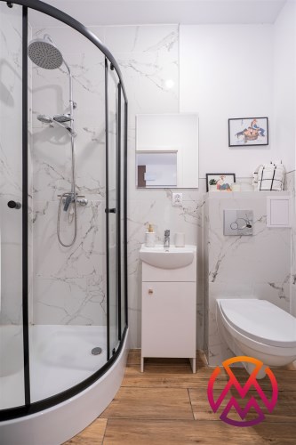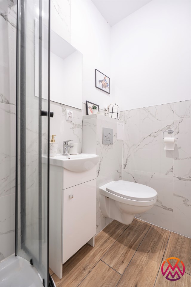 Kuchnia została w pełni wyposażona – znajdziemy tu 2-palnikową płytę indukcyjną, zmywarkę, zlewozmywak z baterią oraz pralkę, co czyni lokal gotowym do zamieszkania od zaraz. Łazienka wykończona jest w jasnej glazurze, a stonowana kolorystyka ścian (biel i szarość) tworzy przyjemną i nowoczesną atmosferę. Na podłodze znajdują się panele.