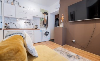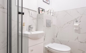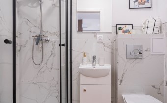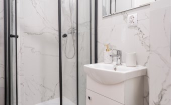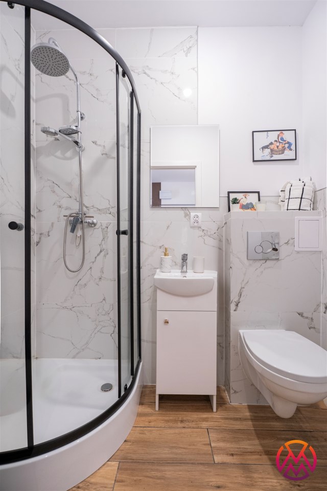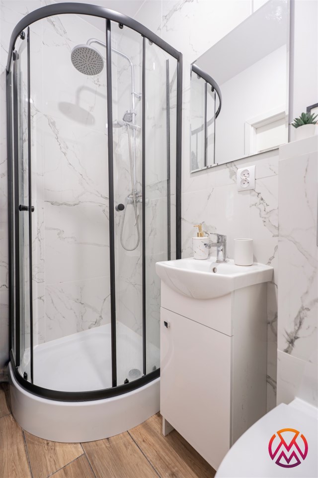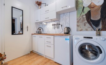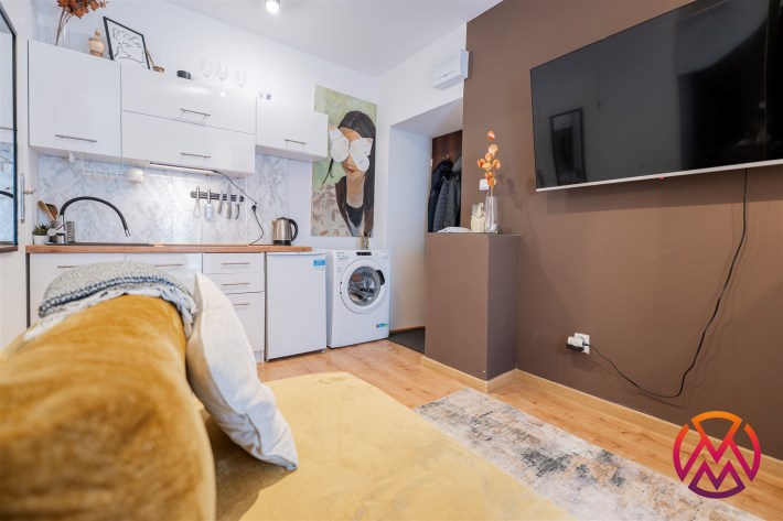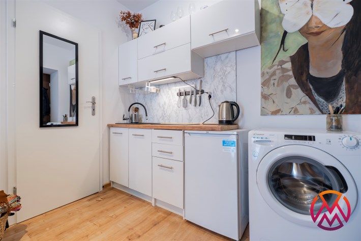 Kuchnia została w pełni wyposażona – znajdziemy tu 2-palnikową płytę indukcyjną, zmywarkę, zlewozmywak z baterią oraz pralkę, co czyni lokal gotowym do zamieszkania od zaraz. Łazienka wykończona jest w jasnej glazurze, a stonowana kolorystyka ścian (biel i szarość) tworzy przyjemną i nowoczesną atmosferę. Na podłodze znajdują się panele.