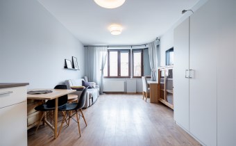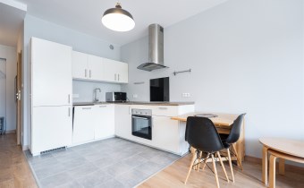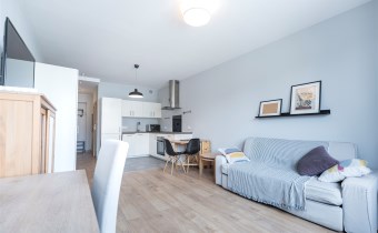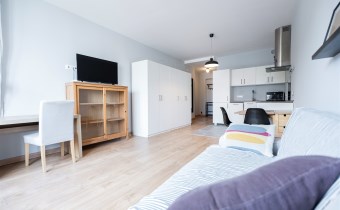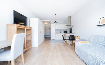 Pokój z aneksem kuchennym w nowoczesnym stylu: wygodna rozkładana kanapa ze stolikiem przykanapowym, biurko (również rozkładane), TV. Aneks kuchenny wyposażony we wszystkie sprzęty niezbędne do wygodnego zamieszkania - lodówka z zamrażarką w zabudowie, zmywarka, płyta, piekarnik.