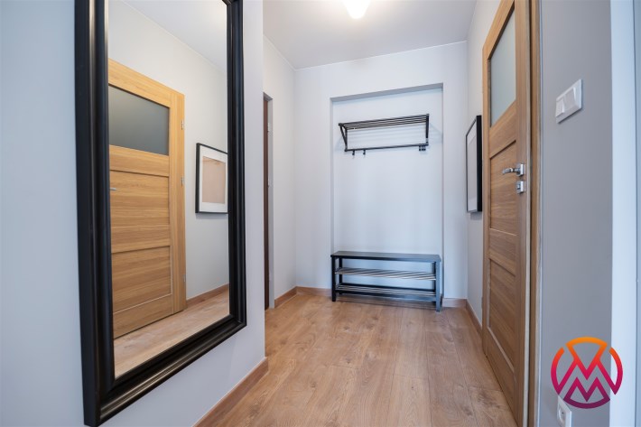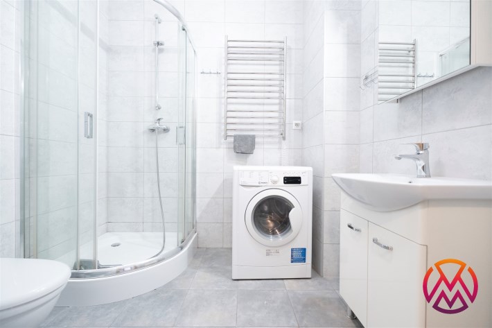 W przedpokoju szafa. Łazienka w pełni wyposażona, WC, umywalka, prysznic i pralka, wszystko w wysokim standardzie i zadbane.