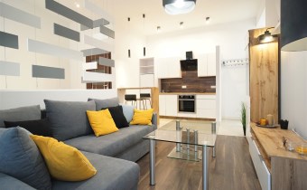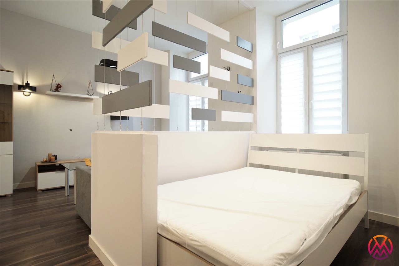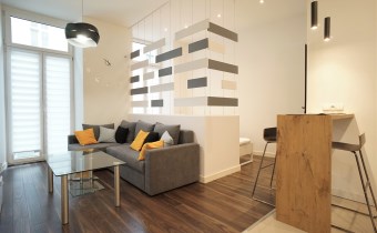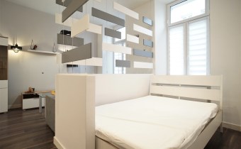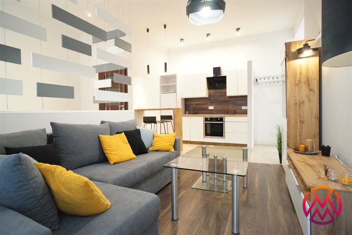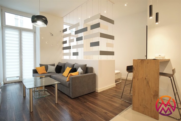 Mieszkanie składa się z jednego pokoju połączonego z aneksem kuchennym, łazienki razem z WC oraz wydzielonej sypialni, gdzie znajduje się dwuosobowe łóżko wraz z materacem.