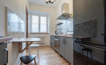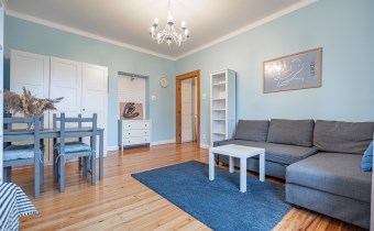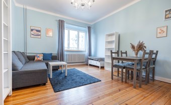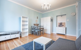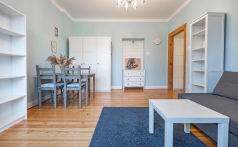 - Pokój: Ustawny, jasny i przestronny. Wyposażony w rozkładaną kanapę, stół z krzesłami, dwie komody, szafę oraz regał na książki.