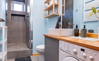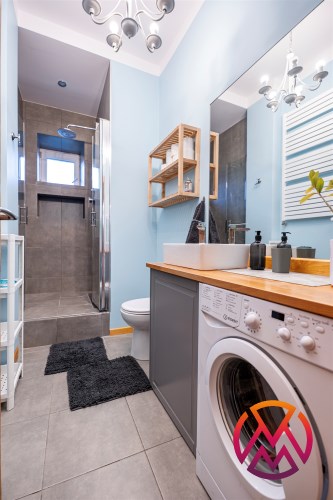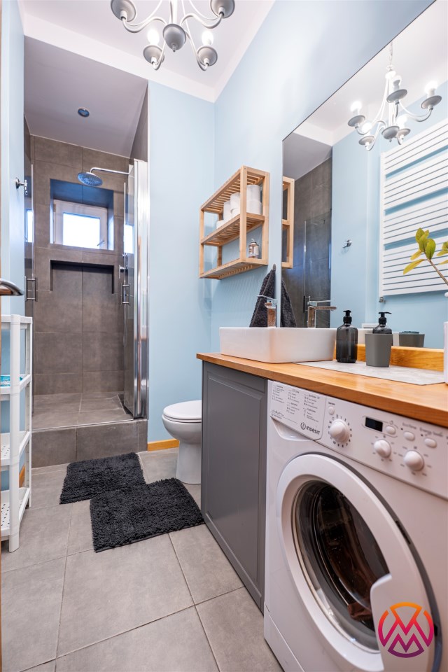 - Łazienka: z prysznicem, umywalką toaletą i pralką.