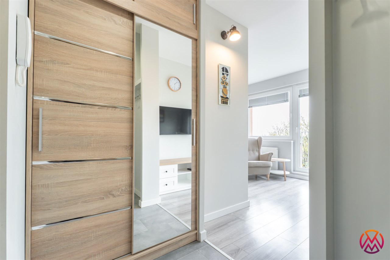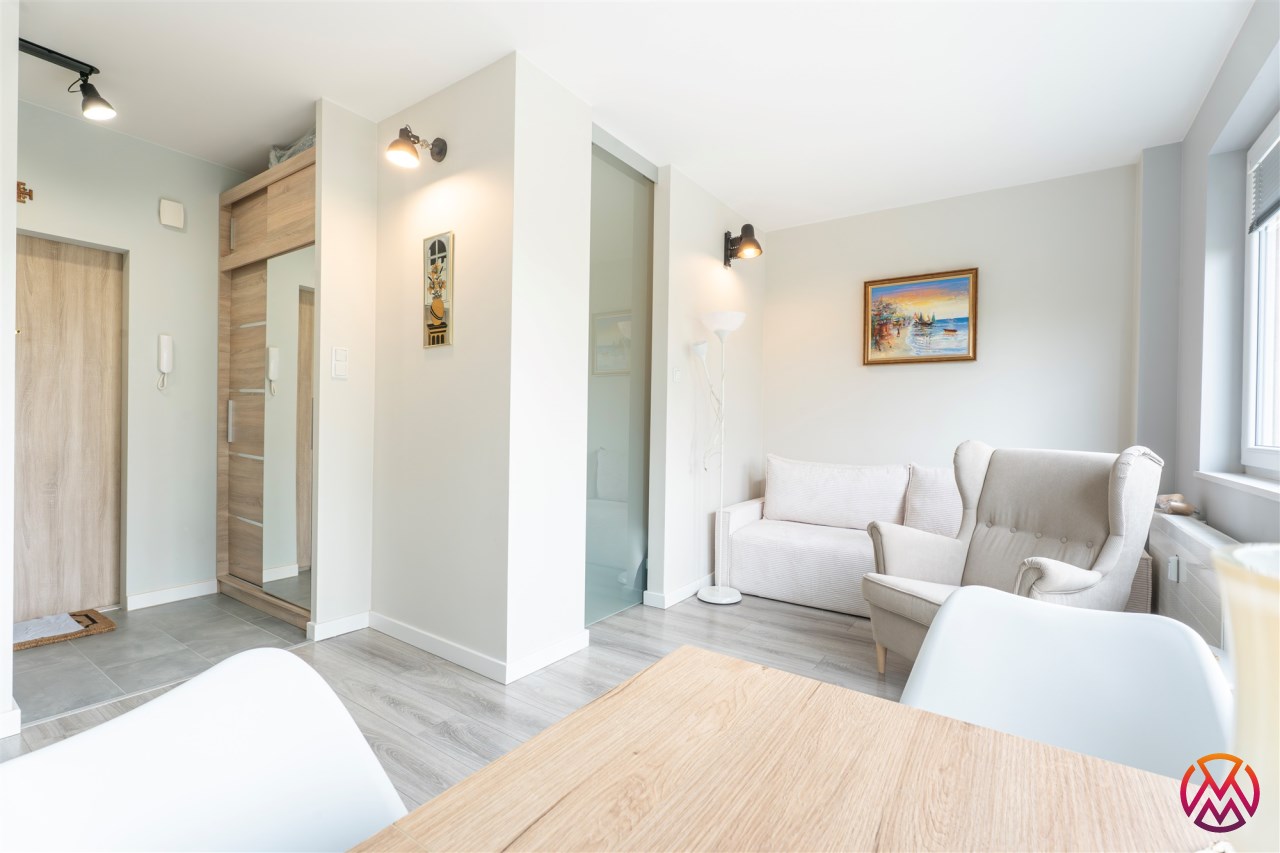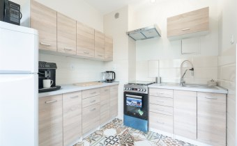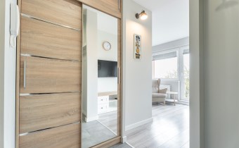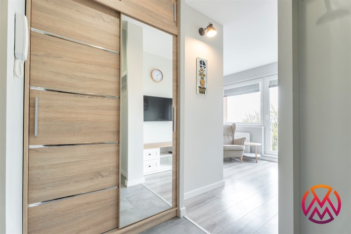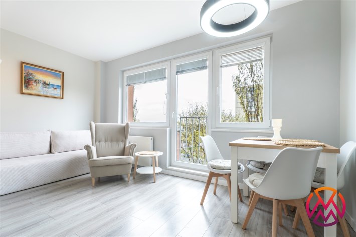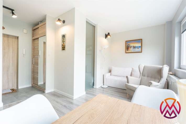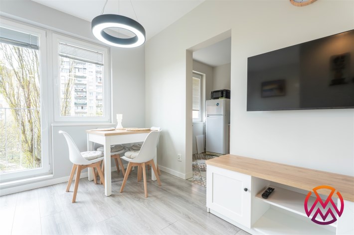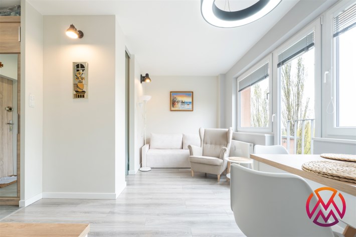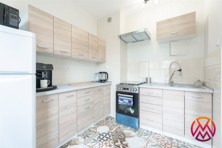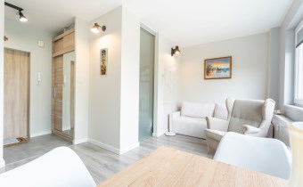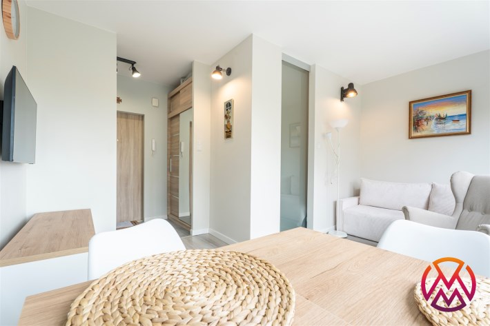 Kawalerka składa się z pokoju z wydzieloną częścią sypialnianą, w której swoje miejsce znalazło podwójne łóżko z materacem oraz półki. Salon wyposażony został w kanapę, fotel, stół z krzesłami, szafę RTV oraz telewizor. Mieszkanie dodatkowo posiada oddzielną i widną kuchnię, w pełni wyposażoną m.in. kuchenka gazowa z piekarnikiem elektrycznym, lodówka z zamrażarką, zlewozmywak, mikrofala, komplet naczyń. Łazienka z prysznicem, umywalką, toaletą oraz pralką. W przedpokoju dodatkowo pakowna szafa.