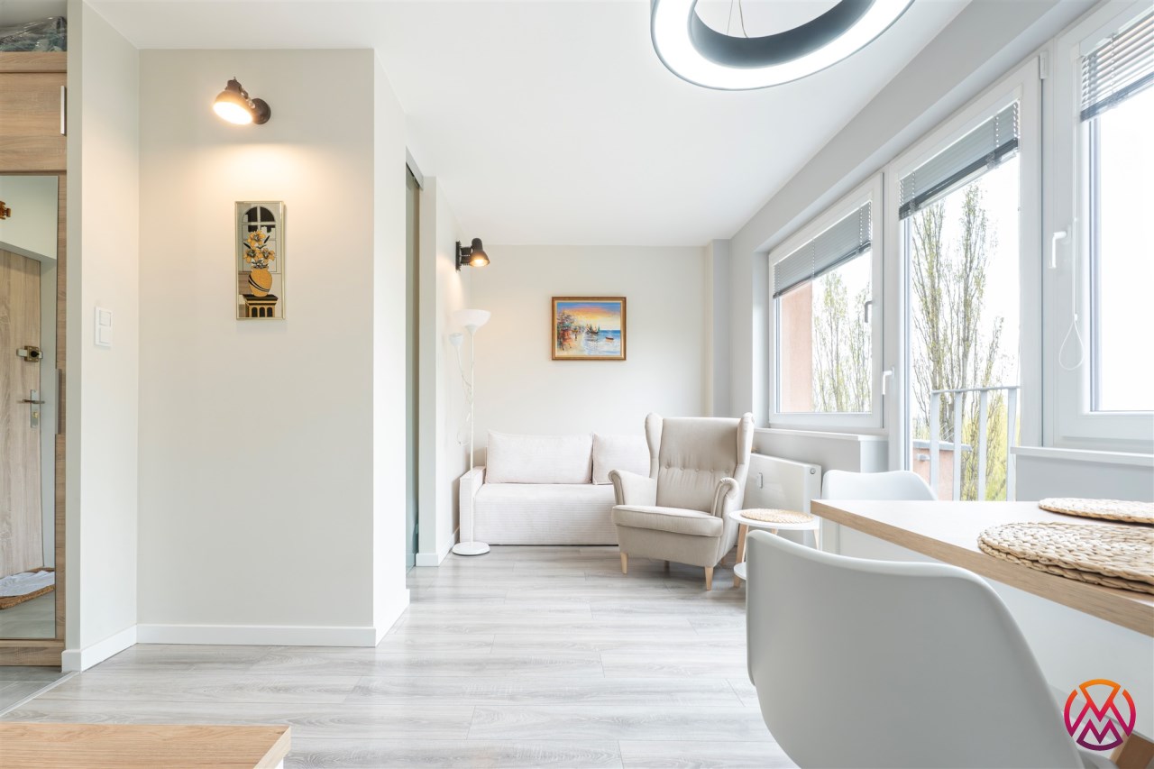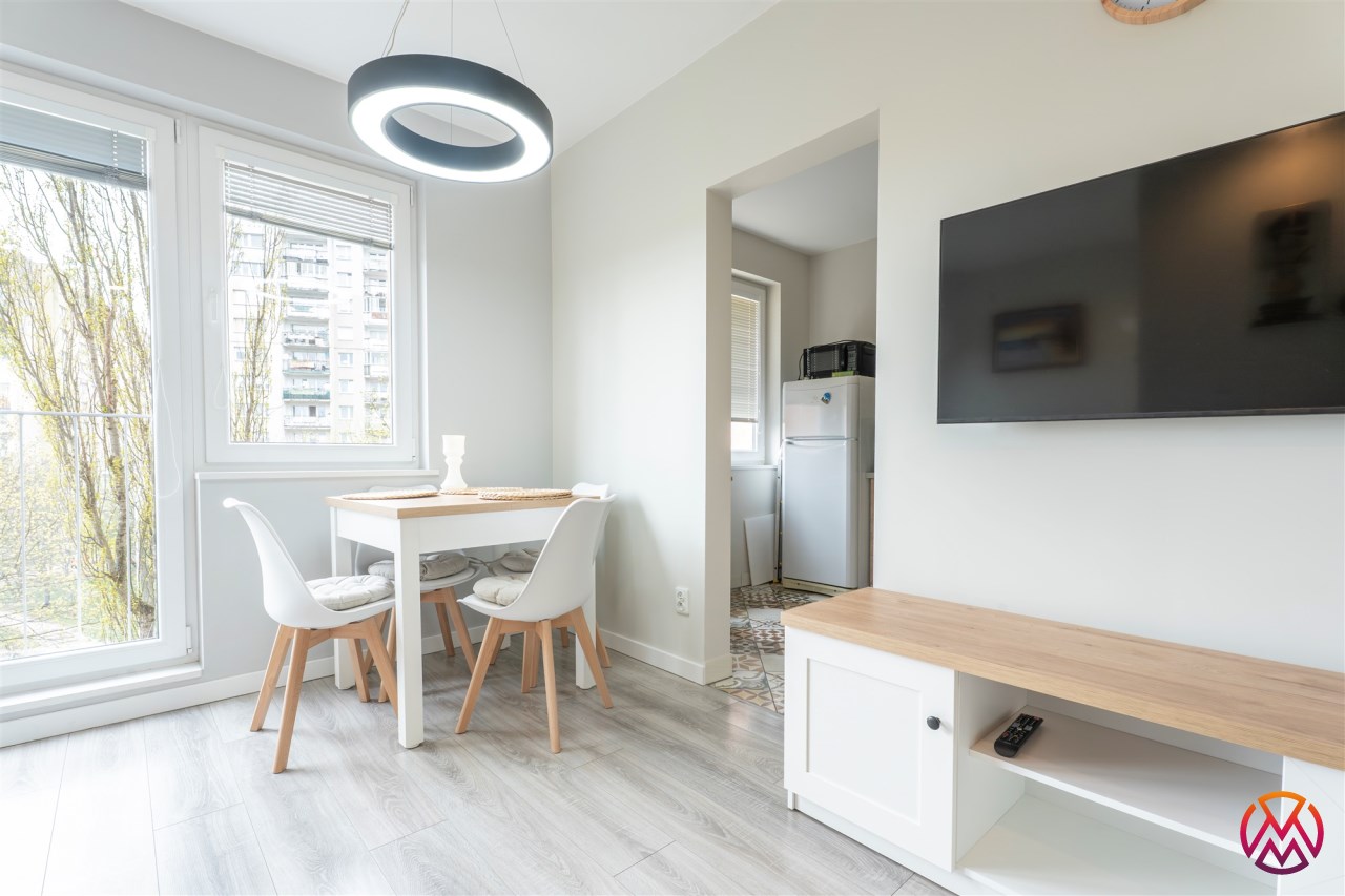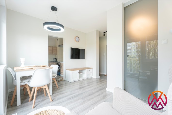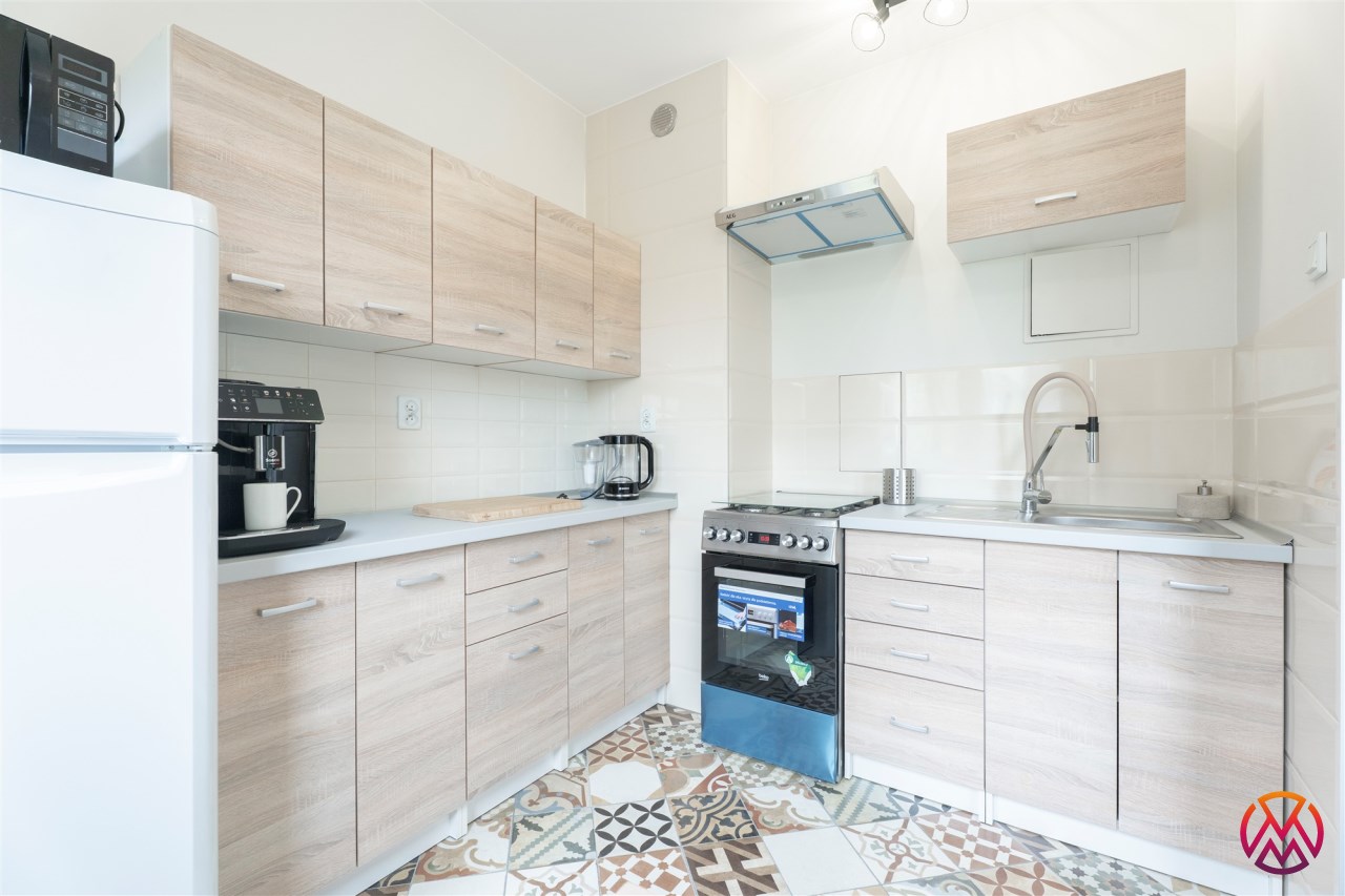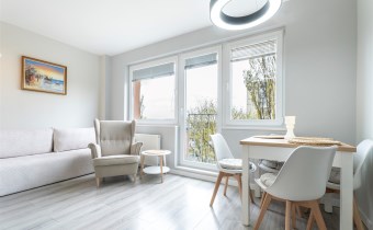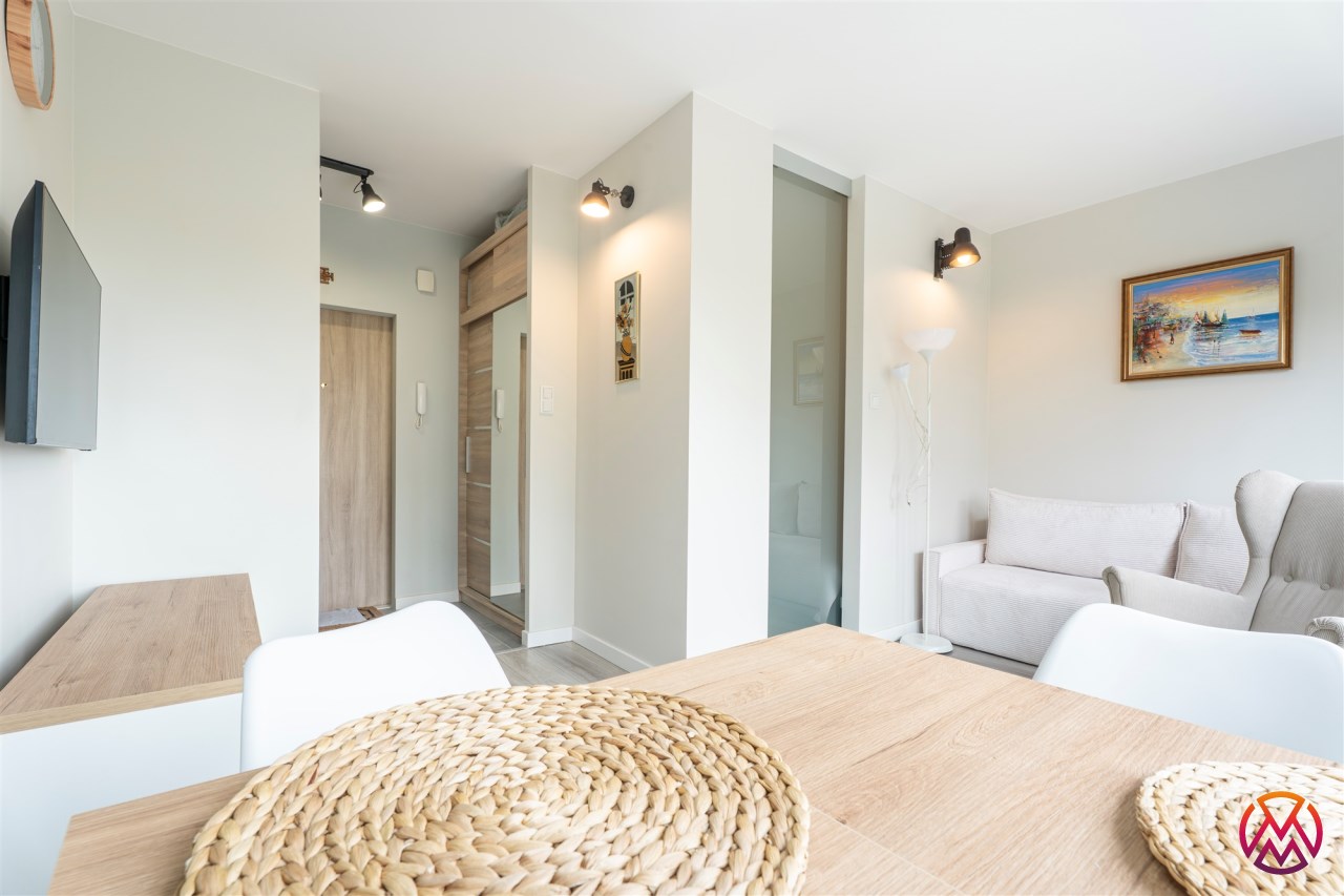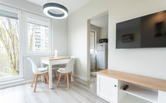 Kawalerka składa się z pokoju z wydzieloną częścią sypialnianą, w której swoje miejsce znalazło podwójne łóżko z materacem oraz półki. Salon wyposażony został w kanapę, fotel, stół z krzesłami, szafę RTV oraz telewizor. Mieszkanie dodatkowo posiada oddzielną i widną kuchnię, w pełni wyposażoną m.in. kuchenka gazowa z piekarnikiem elektrycznym, lodówka z zamrażarką, zlewozmywak, mikrofala, komplet naczyń. Łazienka z prysznicem, umywalką, toaletą oraz pralką. W przedpokoju dodatkowo pakowna szafa.
