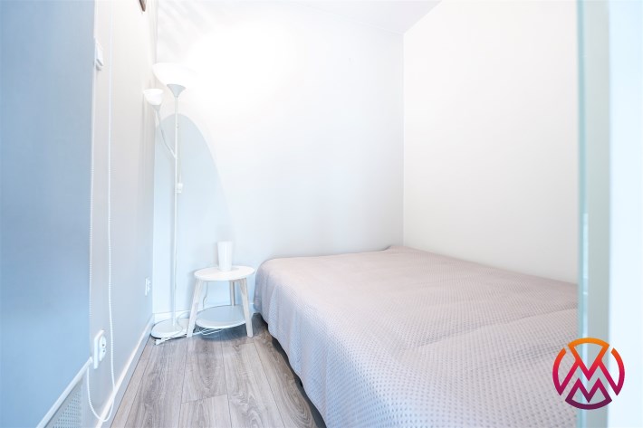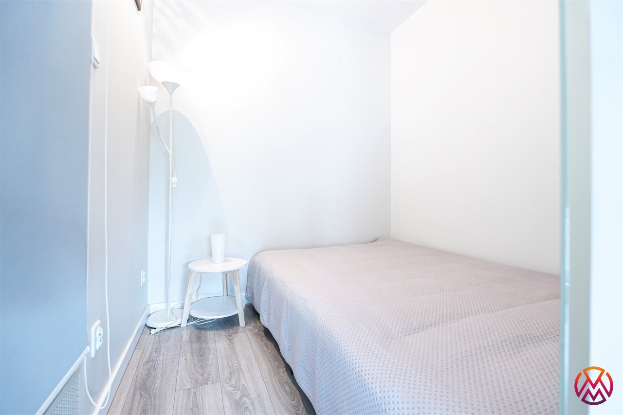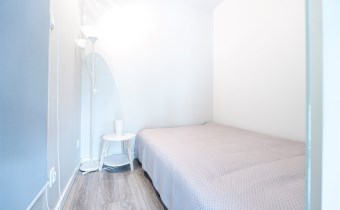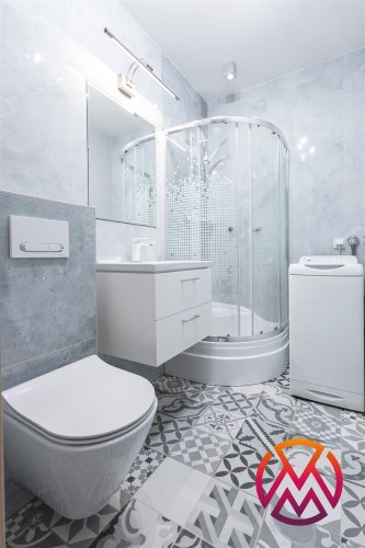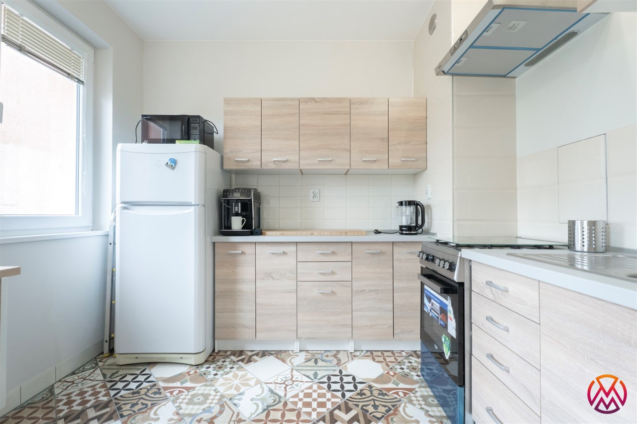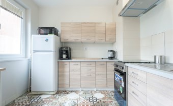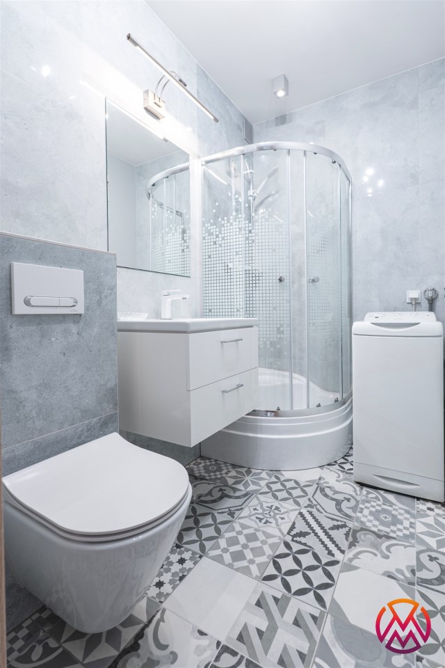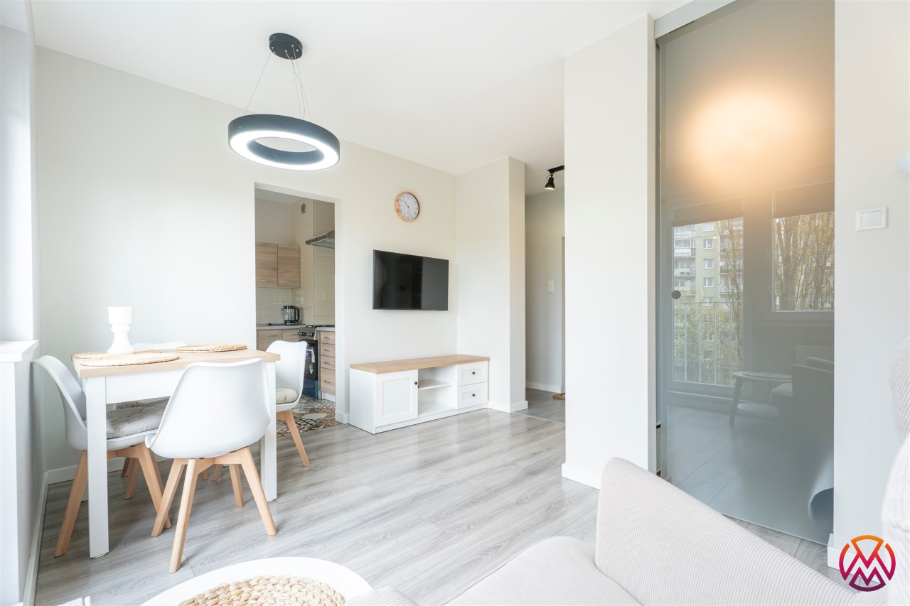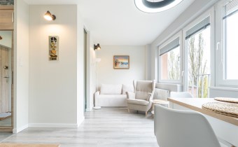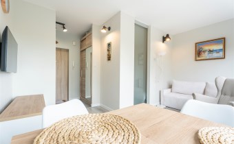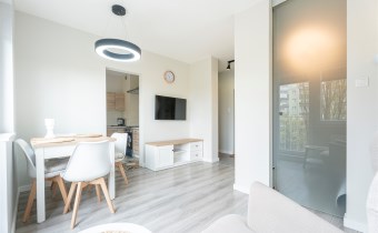 Kawalerka składa się z pokoju z wydzieloną częścią sypialnianą, w której swoje miejsce znalazło podwójne łóżko z materacem oraz półki. Salon wyposażony został w kanapę, fotel, stół z krzesłami, szafę RTV oraz telewizor. Mieszkanie dodatkowo posiada oddzielną i widną kuchnię, w pełni wyposażoną m.in. kuchenka gazowa z piekarnikiem elektrycznym, lodówka z zamrażarką, zlewozmywak, mikrofala, komplet naczyń. Łazienka z prysznicem, umywalką, toaletą oraz pralką. W przedpokoju dodatkowo pakowna szafa.