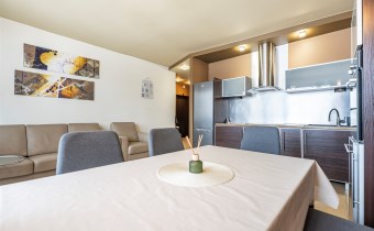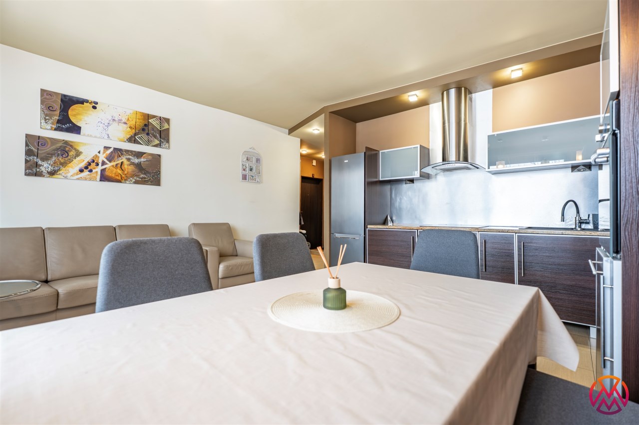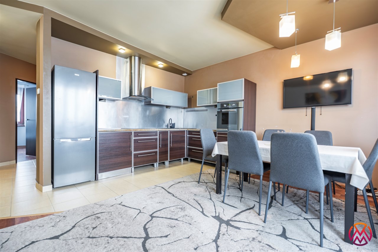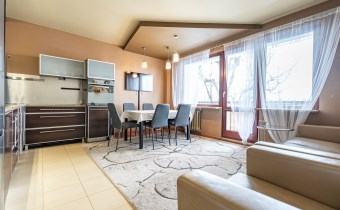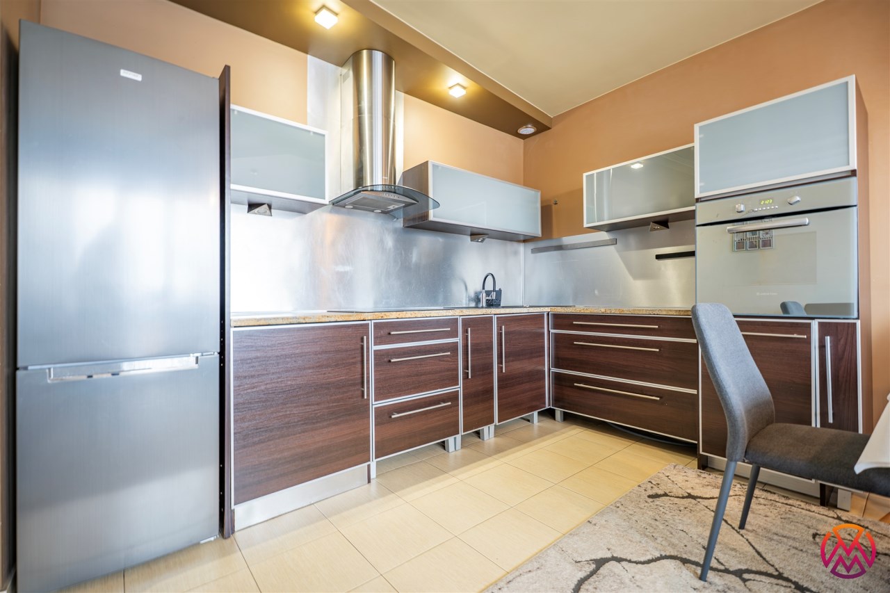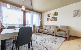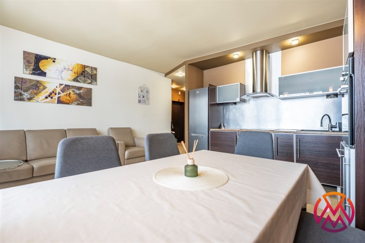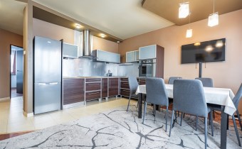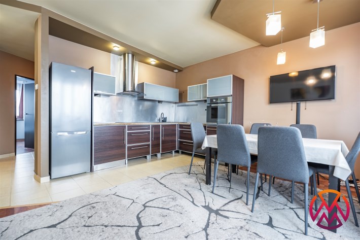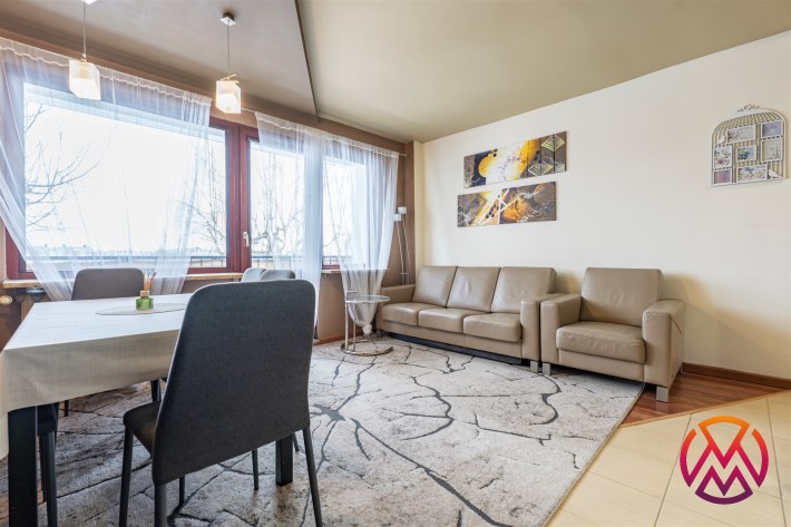 Salon z aneksem kuchennym: Przestronna strefa dzienna. Kuchnia wykonana na wymiar, w pełni wyposażona w nowoczesny sprzęt AGD (lodówka, piekarnik, płyta grzewcza oraz zmywarka). Salon z kanapą, stołem z krzesłami i TV, doskonale doświetlony (strona południowa) z wyjściem na szeroki i głęboki balkon.