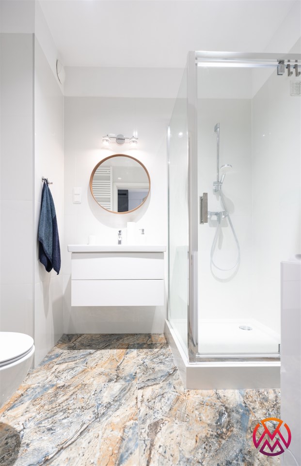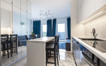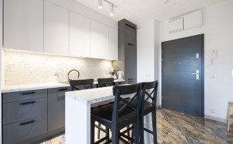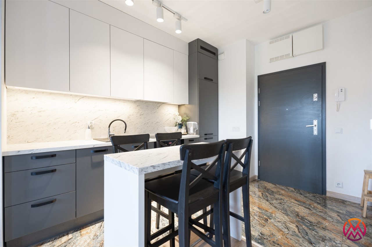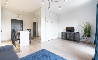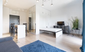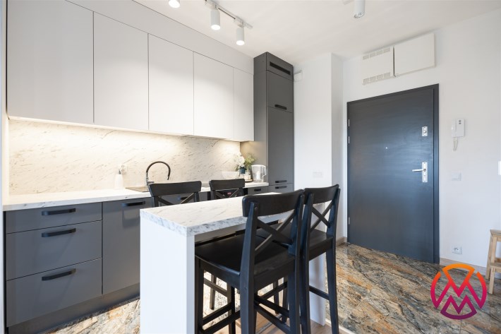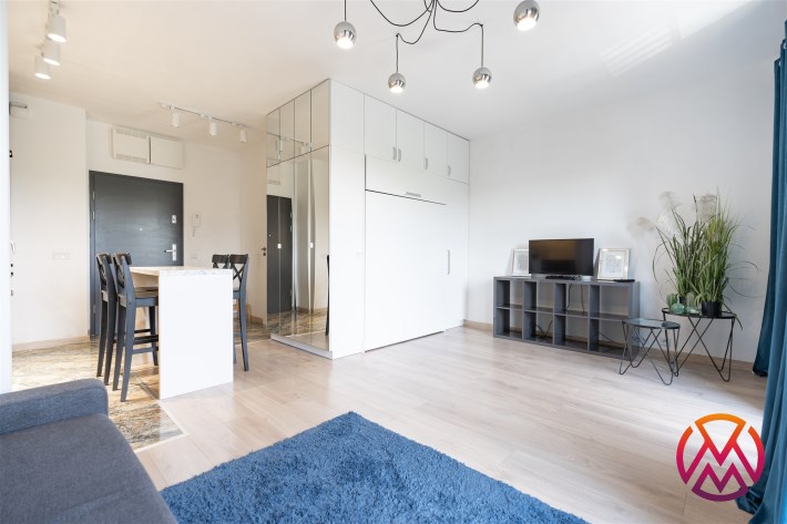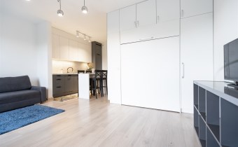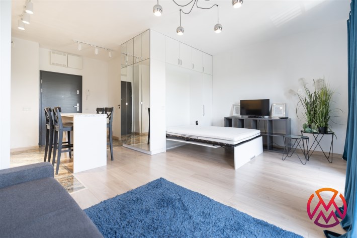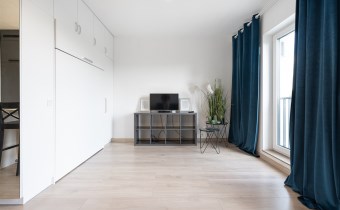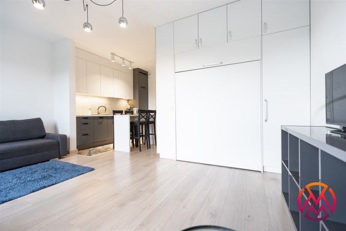 Kompletnie umeblowane. Pokój posiada rozkładaną, wygodną kanapę, ukryte łóżko z materacem, szafkę RTV, telewizor, szafę w zabudowie. Aneks kuchenny w pełni wyposażony we wszystkie niezbędne sprzęty m.in. lodówkę, zmywarkę, piekarnik, płytę indukcyjną, czajnik. dodatkowo kuchnia posiada wyspę z krzesłami. W łazience znajduje się prysznic, toaleta, umywalka z szafką oraz pralka.