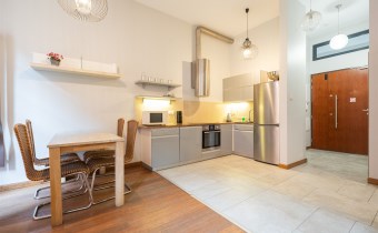 Kuchnia została wyposażona w wysokiej jakości sprzęt AGD: lodówkę z zamrażarką, płytę indukcyjną, piekarnik, zmywarkę, zlewozmywak z baterią oraz zabudowę kuchenną z blatem, a także podstawowe wyposażenie.