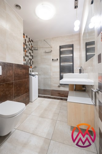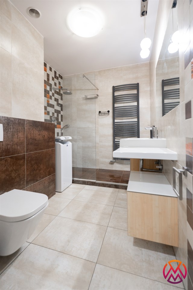 Przestronna łazienka została wyposażona w duży prysznic, umywalkę, WC oraz pralkę. W przedpokoju znajduje się praktyczna garderoba, zapewniająca dodatkowe miejsce do przechowywania.