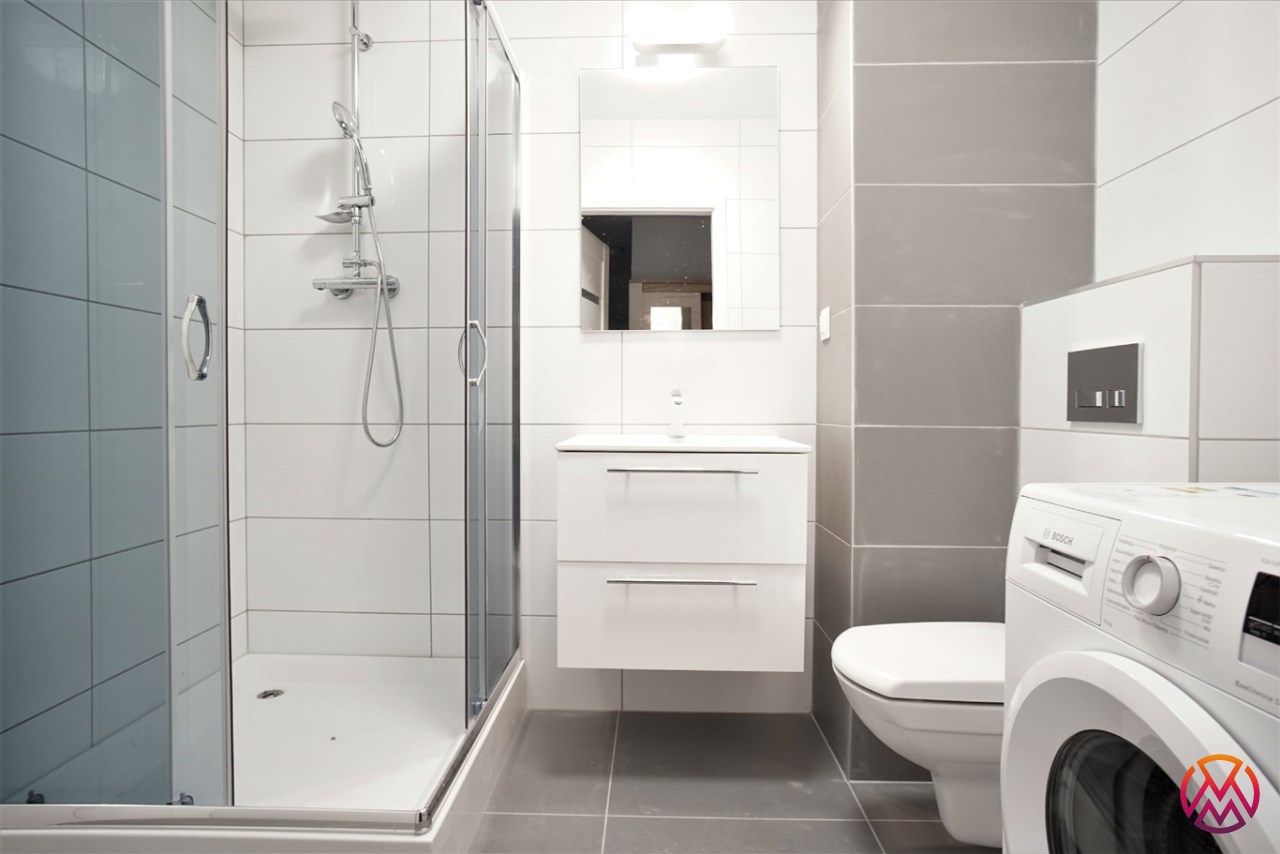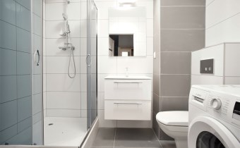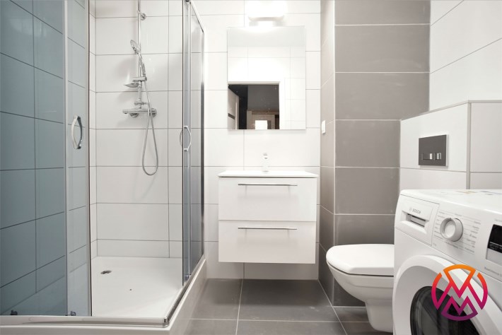 Wyposażenie łazienki kabina prysznicowa, lustro, natrysk, pralka, prysznic, umywalka, WC