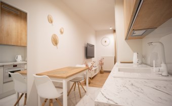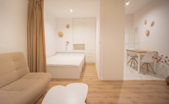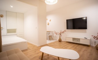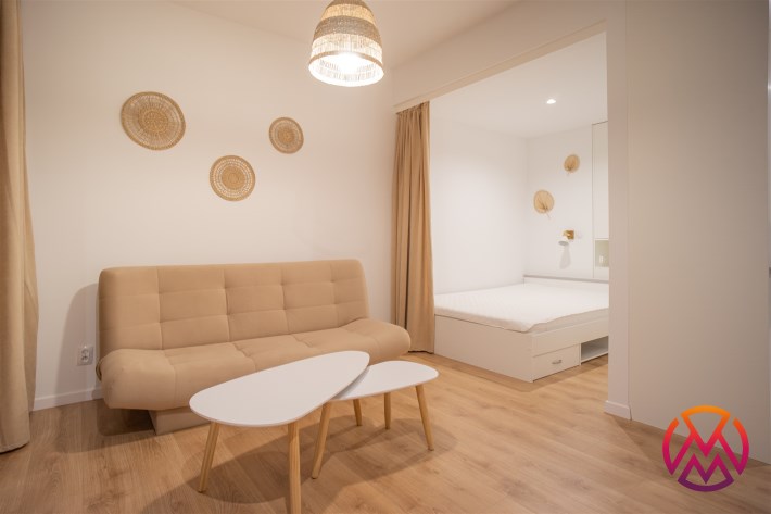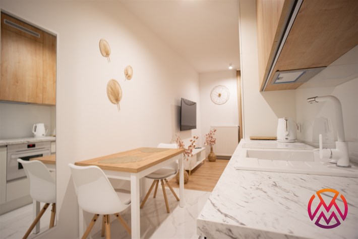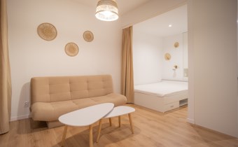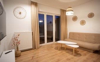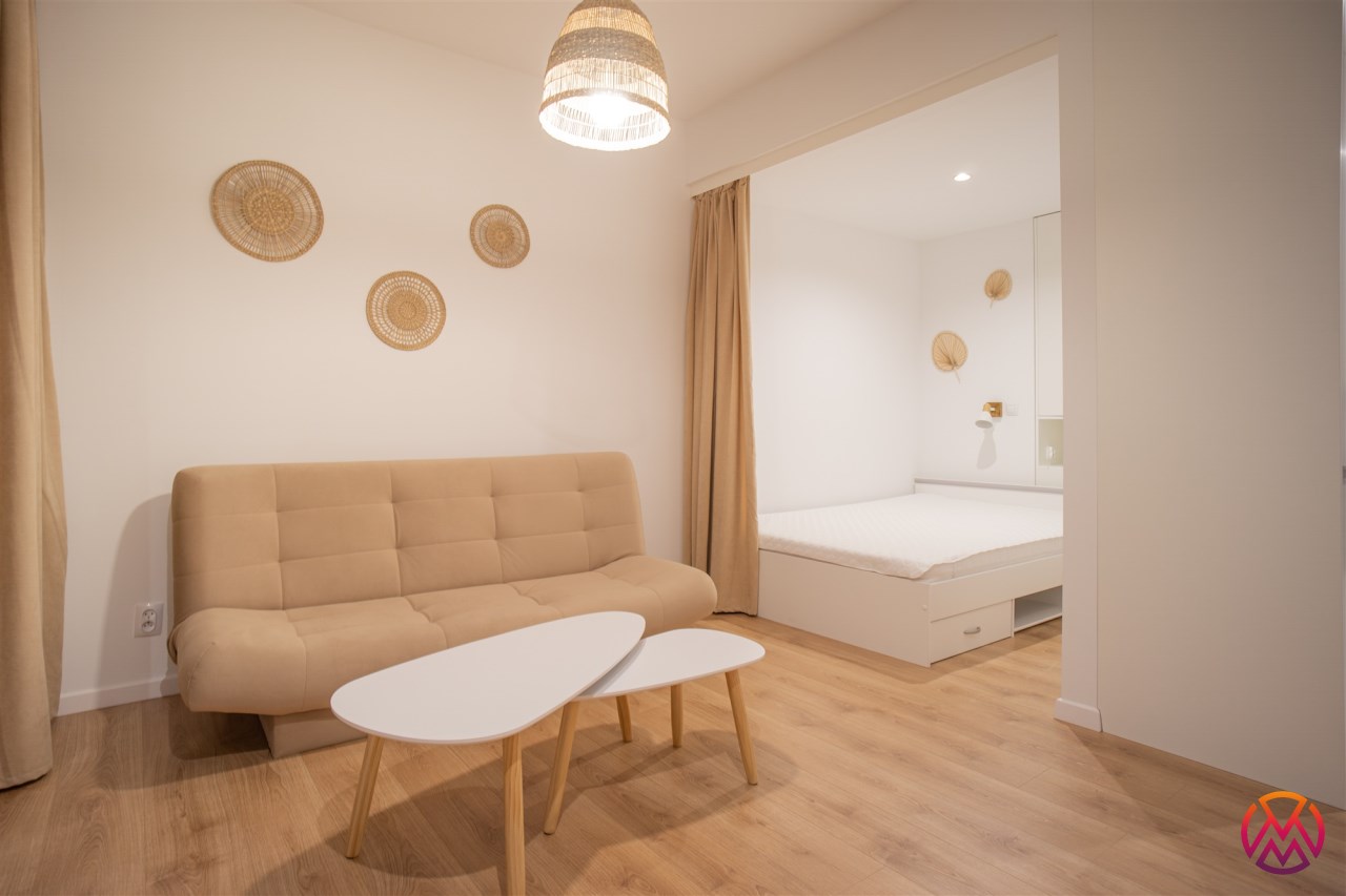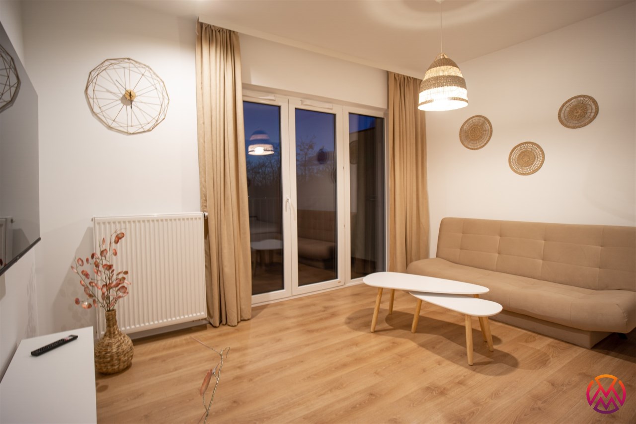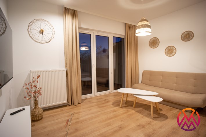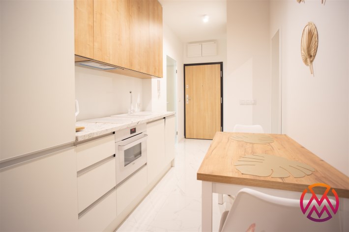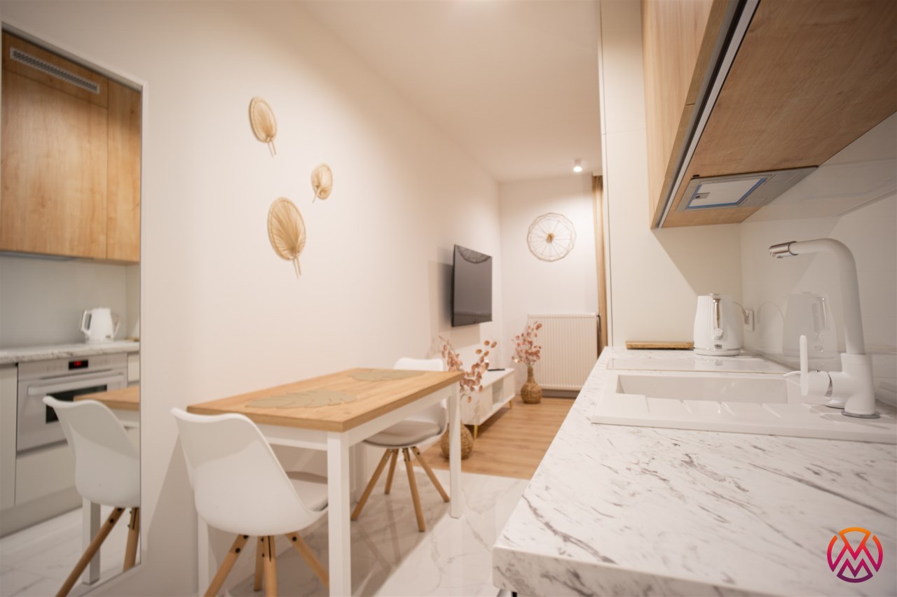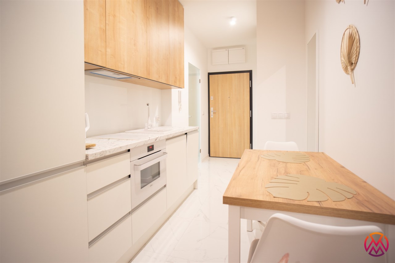 Urządzone przy użyciu wysokiej jakości materiałów, w nowoczesny i niebanalny sposób. W pełni umeblowane - w salonie znajdziemy wygodną kanapę, stolik kawowy, szafkę RTV wraz z TV. Całości dopełnia ciekawe oświetlenie. Kuchnia wyposażone we wszystkie niezbędne sprzęty - lodówkę z zamrażarką, płytę indukcyjną, piekarnik, zmywarkę, stół z krzesłami, a także komplet naczyń i sztućców. Wnęka sypialniana posiada wygodne małżeńskie łóżko z materacem oraz funkcjonalną i pakowną szafę w zabudowie. Łazienka wyposażona została w prysznic z deszczownicą, toaletę, umywalkę z szafką oraz pralkę. W przedpokoju funkcjonalna szafa.