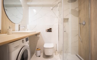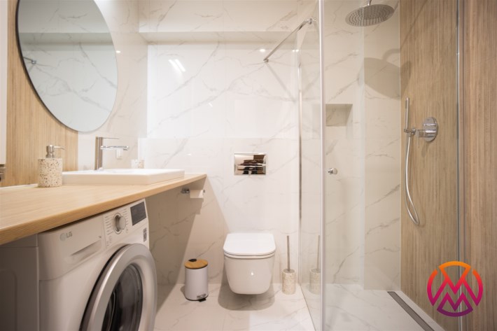 Wyposażenie łazienki WC, umywalka, prysznic, pralka, lustro, kabina prysznicowa