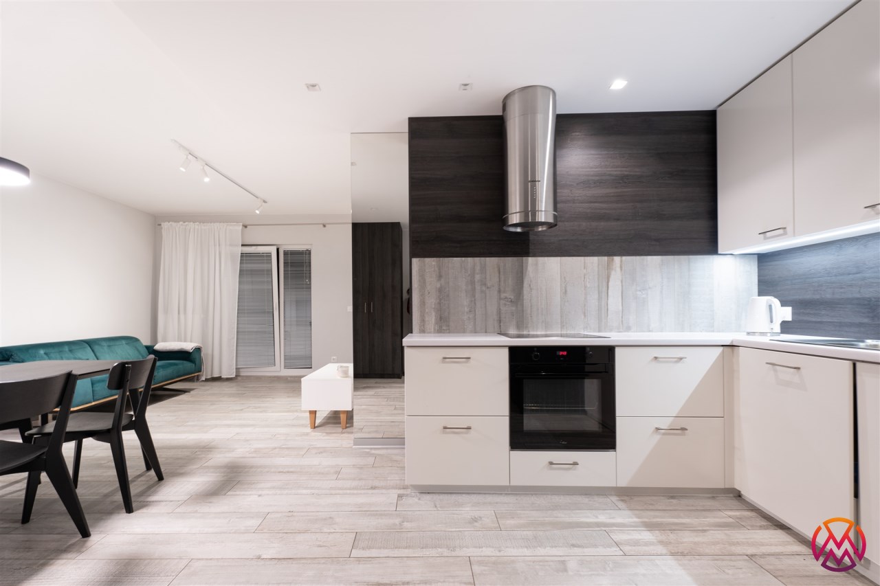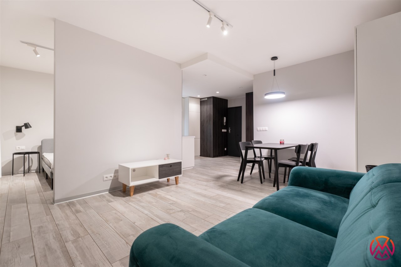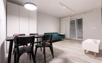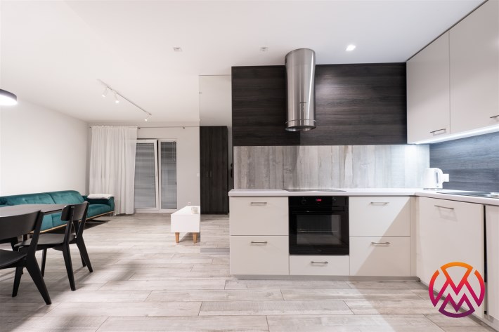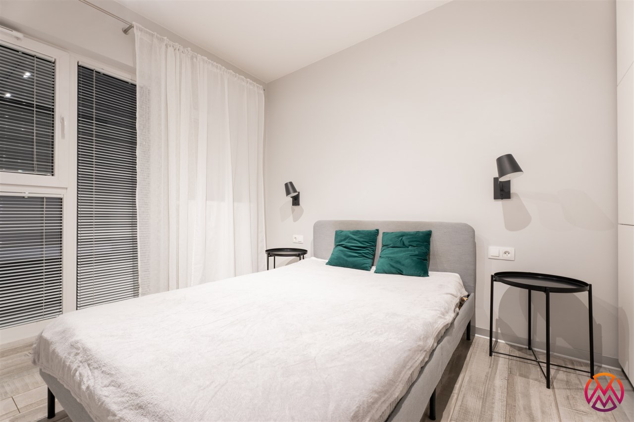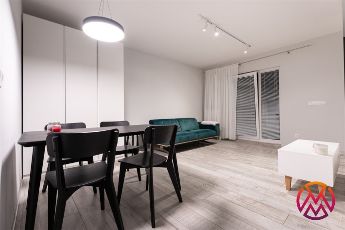 Mieszkanie w pełni umeblowane. W salonie znajdziemy wygodną sofę, stół z krzesłami szafkę RTV oraz szafę. W sypialni podwójne łóżko 140/200 z materacem oraz pakowną szafę w zabudowie. Kuchnia została wyposażona we wszystkie niezbędne sprzęty, w tym lodówko-zamrażarka, zmywarka, płyta indukcyjna, okap, kuchenka mikrofalowa. Łazienka wraz z WC, w której znajdziemy duży prysznic z deszczownicą, umywalkę, szafkę w zabudowie oraz pralko-suszarkę. W przedpokoju została umieszczona szafa w zabudowie.