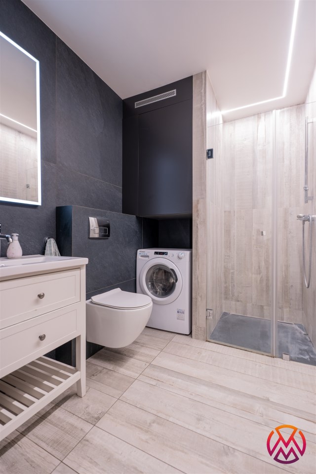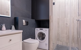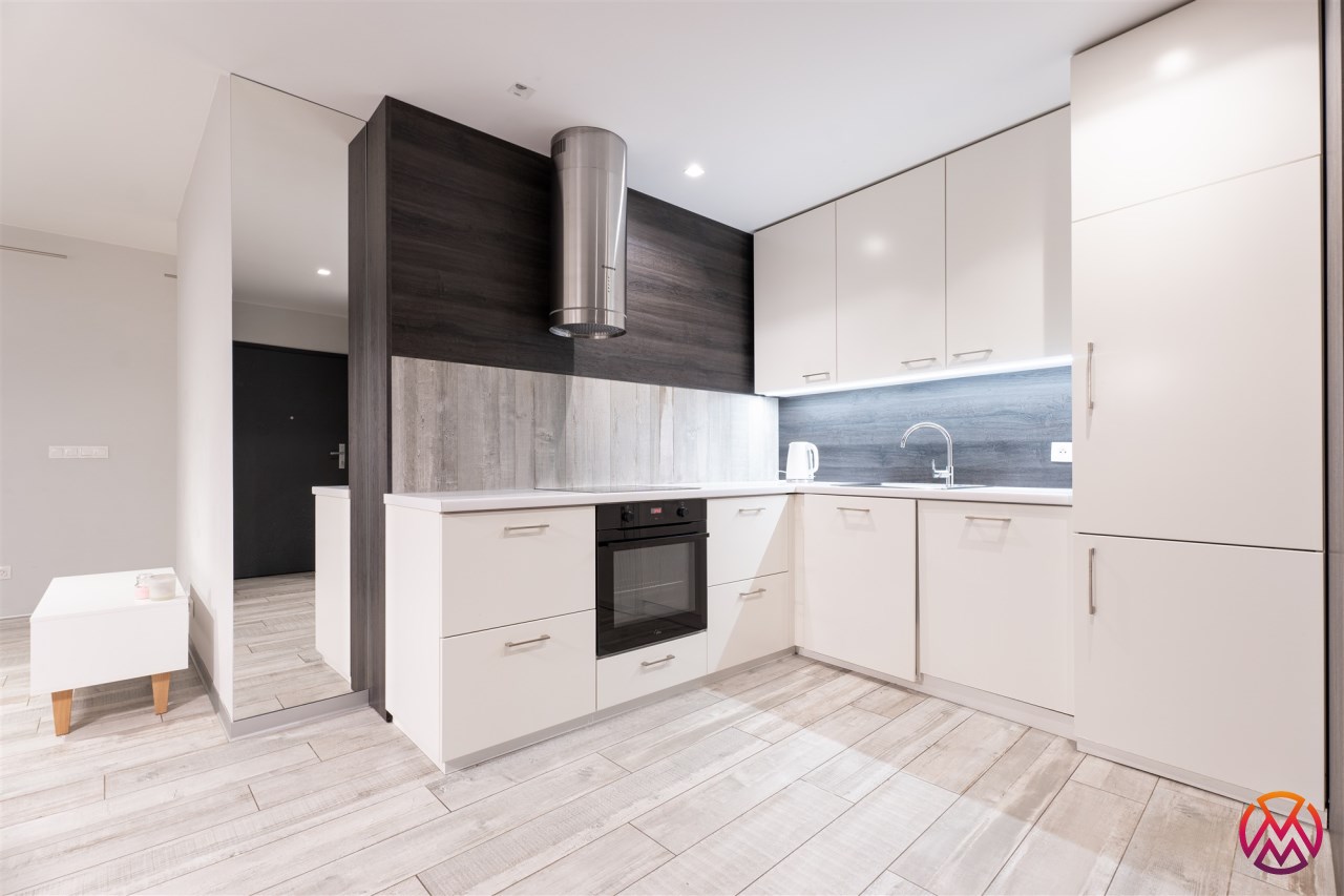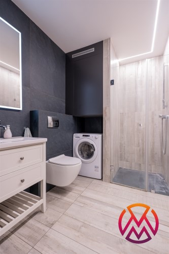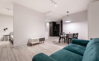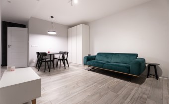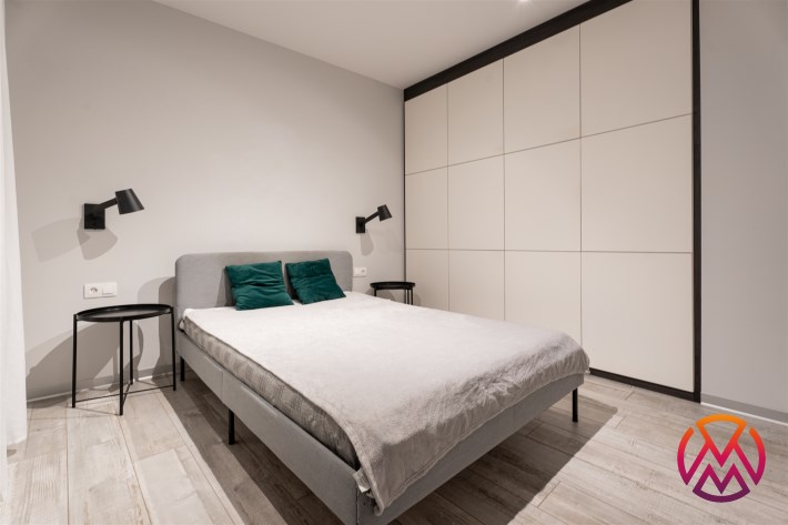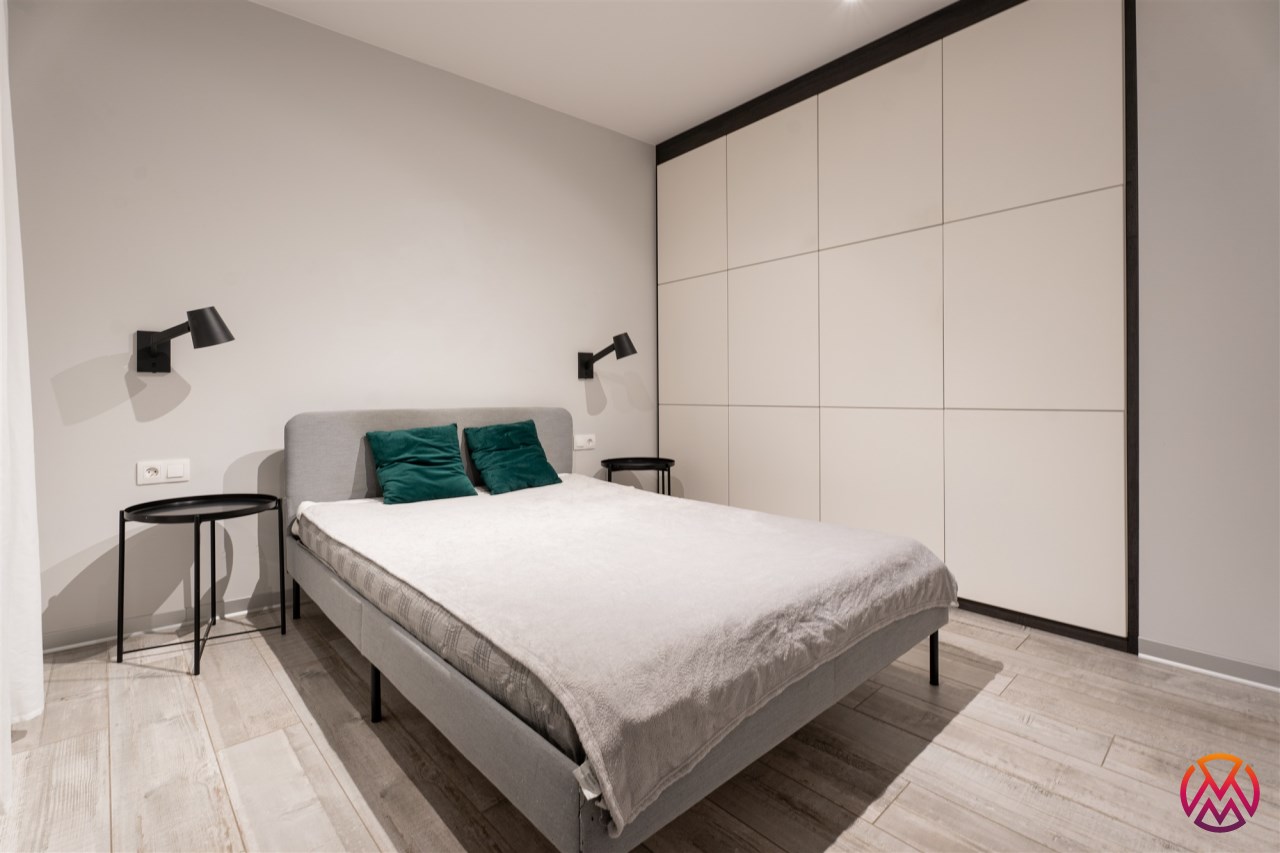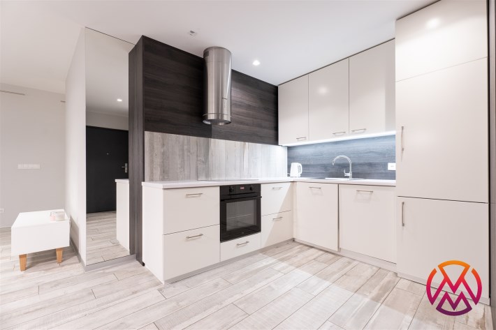 Mieszkanie w pełni umeblowane. W salonie znajdziemy wygodną sofę, stół z krzesłami szafkę RTV oraz szafę. W sypialni podwójne łóżko 140/200 z materacem oraz pakowną szafę w zabudowie. Kuchnia została wyposażona we wszystkie niezbędne sprzęty, w tym lodówko-zamrażarka, zmywarka, płyta indukcyjna, okap, kuchenka mikrofalowa. Łazienka wraz z WC, w której znajdziemy duży prysznic z deszczownicą, umywalkę, szafkę w zabudowie oraz pralko-suszarkę. W przedpokoju została umieszczona szafa w zabudowie.