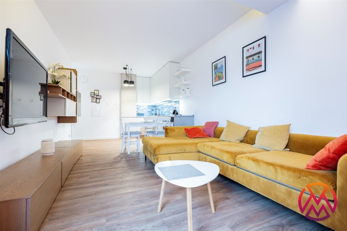 Salon wyposażony został w rozkładaną kanapę, szafkę RTV, telewizor oraz toaletkę. Aneks kuchenny posiada wszystkie niezbędne sprzęty: lodówkę z zamrażarką, zmywarkę, płytę indukcyjną, piekarnik, , okap oraz stół z krzesłami. W sypialni znajduje się łóżko dwuosobowe, z komfortowym wygodnym materacem, szafka nocna oraz regał. W przestronnej łazience znajduje się prysznic z deszczownicą, umywalka z szafką i lustrem w zabudowie. W przedpokoju natomiast znajduje się pakowna szafa w zabudowie z dużą przestrzenią do przechowywania.