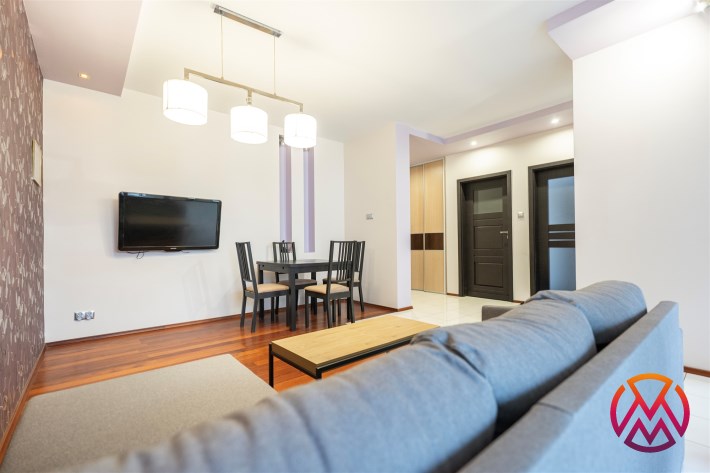 Mieszkanie całkowicie umeblowane - w salonie znajdziemy wygodną kanapę rogową, stolik kawowy, stół z krzesłami, TV. Kuchnia wyposażona we wszystkie niezbędne sprzęty m.in. lodówka, piekarnik, płyta indukcyjna, zmywarka. W sypialni znajdziemy duże, małżeńskie łóżko oraz szafę. Łazienka z prysznicem, pralką, WC i umywalką. Dodatkowo w przedpokoju miejsce znalazła szafa w zabudowie.