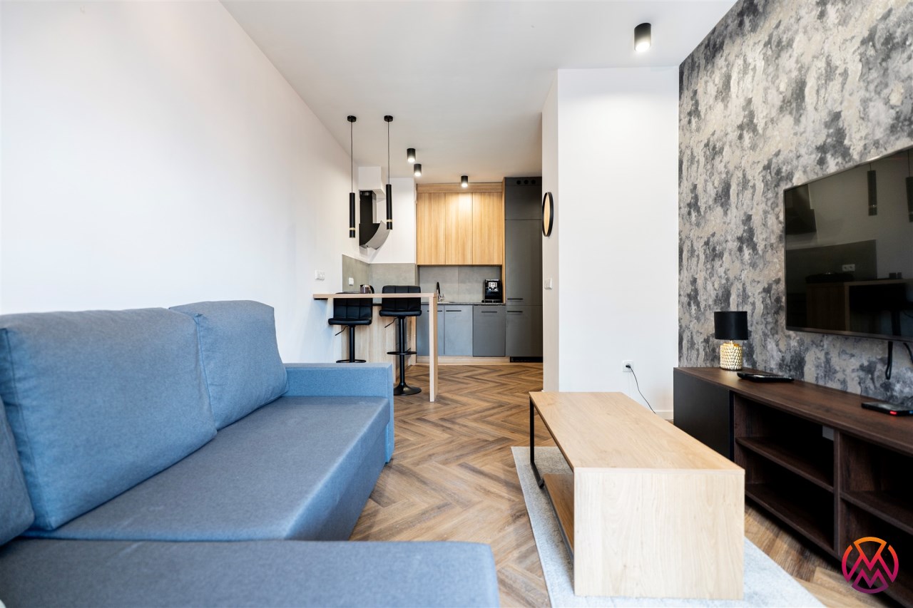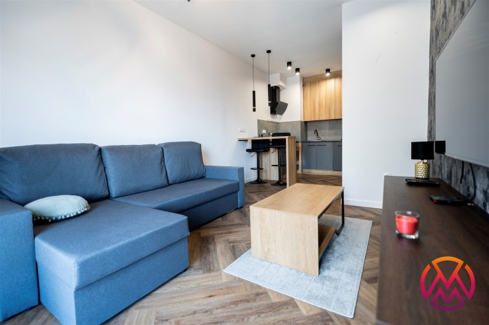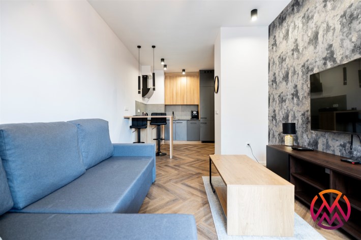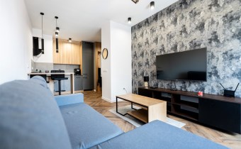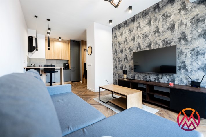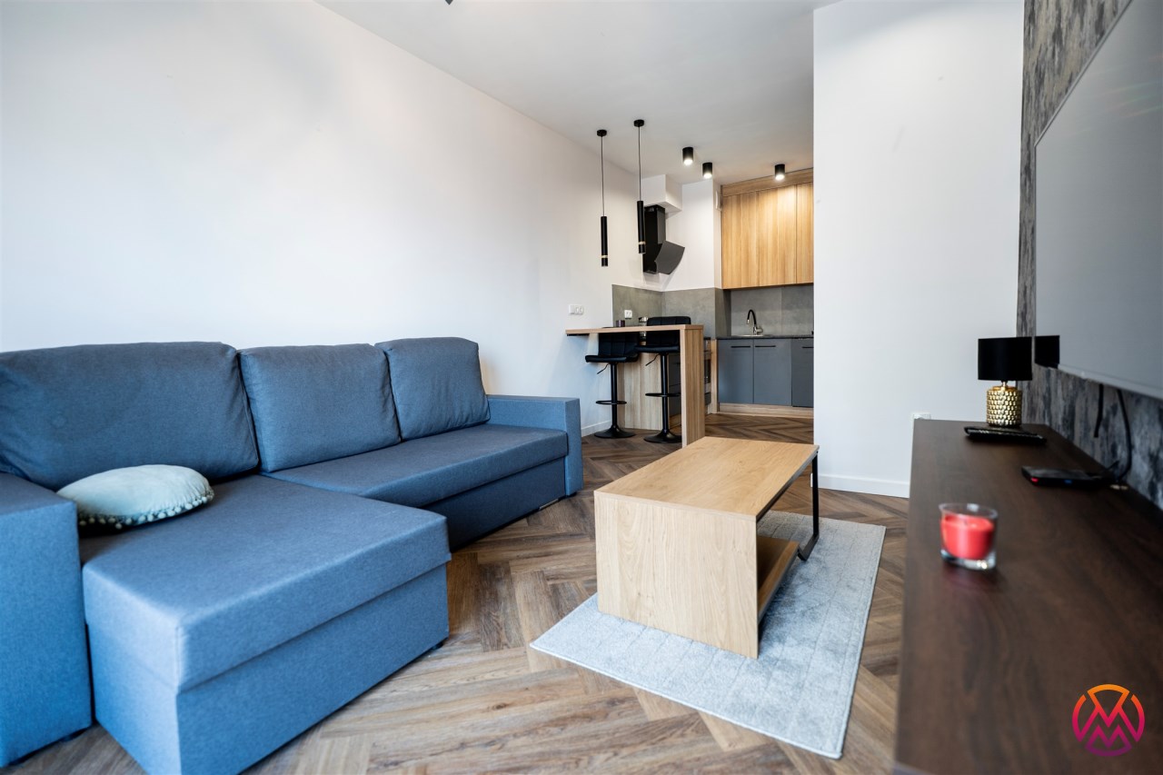Mieszkanie w pełni umeblowane. W salonie znajdziemy wygodną kanapę, szafkę RTV, TV, stolik kawowy, stół z krzesłami. W sypialni podwójne łóżko z materacem, szafki nocne, szafa w zabudowie, toaletka. Kuchnia została wyposażona we wszystkie niezbędne sprzęty, w tym lodówko-zamrażarka, zmywarka, płyta indukcyjna, okap, piekarnik. Łazienka wraz z WC, w której znajdziemy duży prysznic z deszczownicą, pralkę, umywalkę oraz funkcjonalne szafki. W przedpokoju została umieszczona duża, pakowna szafa.
