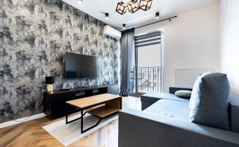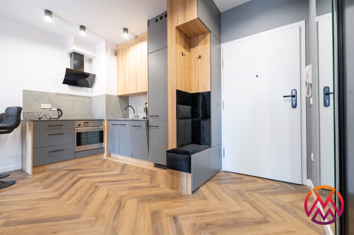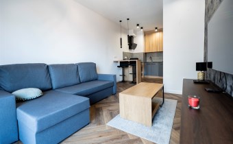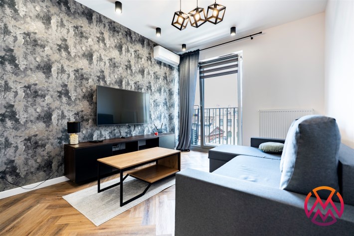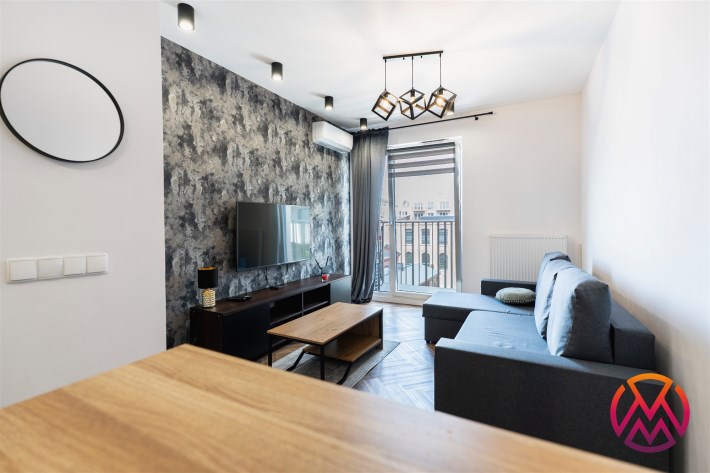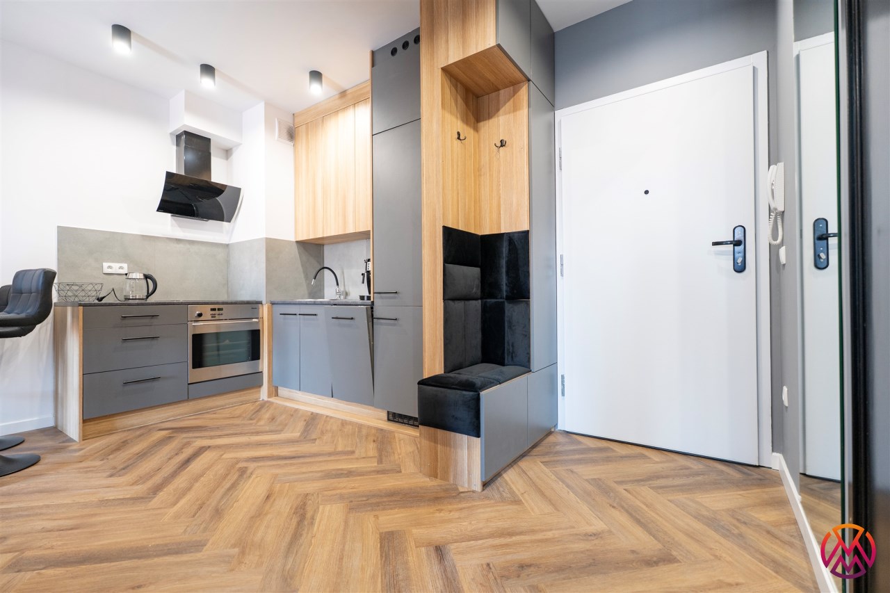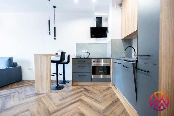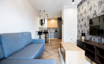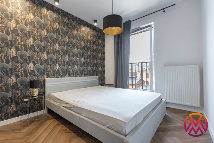 Mieszkanie w pełni umeblowane. W salonie znajdziemy wygodną kanapę, szafkę RTV, TV, stolik kawowy, stół z krzesłami. W sypialni podwójne łóżko z materacem, szafki nocne, szafa w zabudowie, toaletka. Kuchnia została wyposażona we wszystkie niezbędne sprzęty, w tym lodówko-zamrażarka, zmywarka, płyta indukcyjna, okap, piekarnik. Łazienka wraz z WC, w której znajdziemy duży prysznic z deszczownicą, pralkę, umywalkę oraz funkcjonalne szafki. W przedpokoju została umieszczona duża, pakowna szafa.