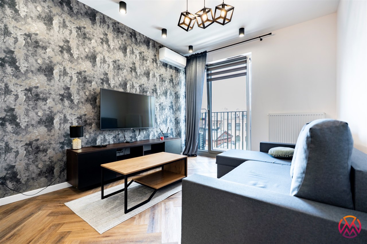 Mieszkanie wykończone w nowoczesnym stylu. Wszystkie sprzęty oraz meble nowe. Mieszkanie słoneczne dzięki ekspozycji zachodniej, z widokiem na osiedle i zabytkowe, pofabryczne budynki.