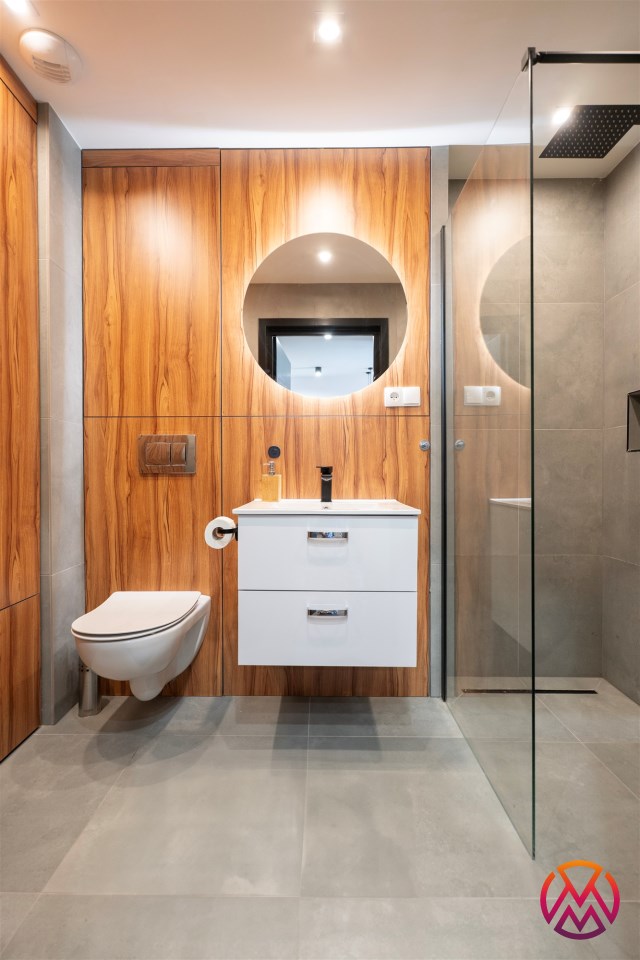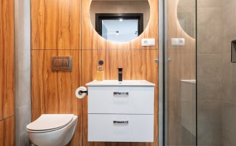 Wyposażenie łazienki pralka, lustro, kabina prysznicowa, umywalka, WC, prysznic