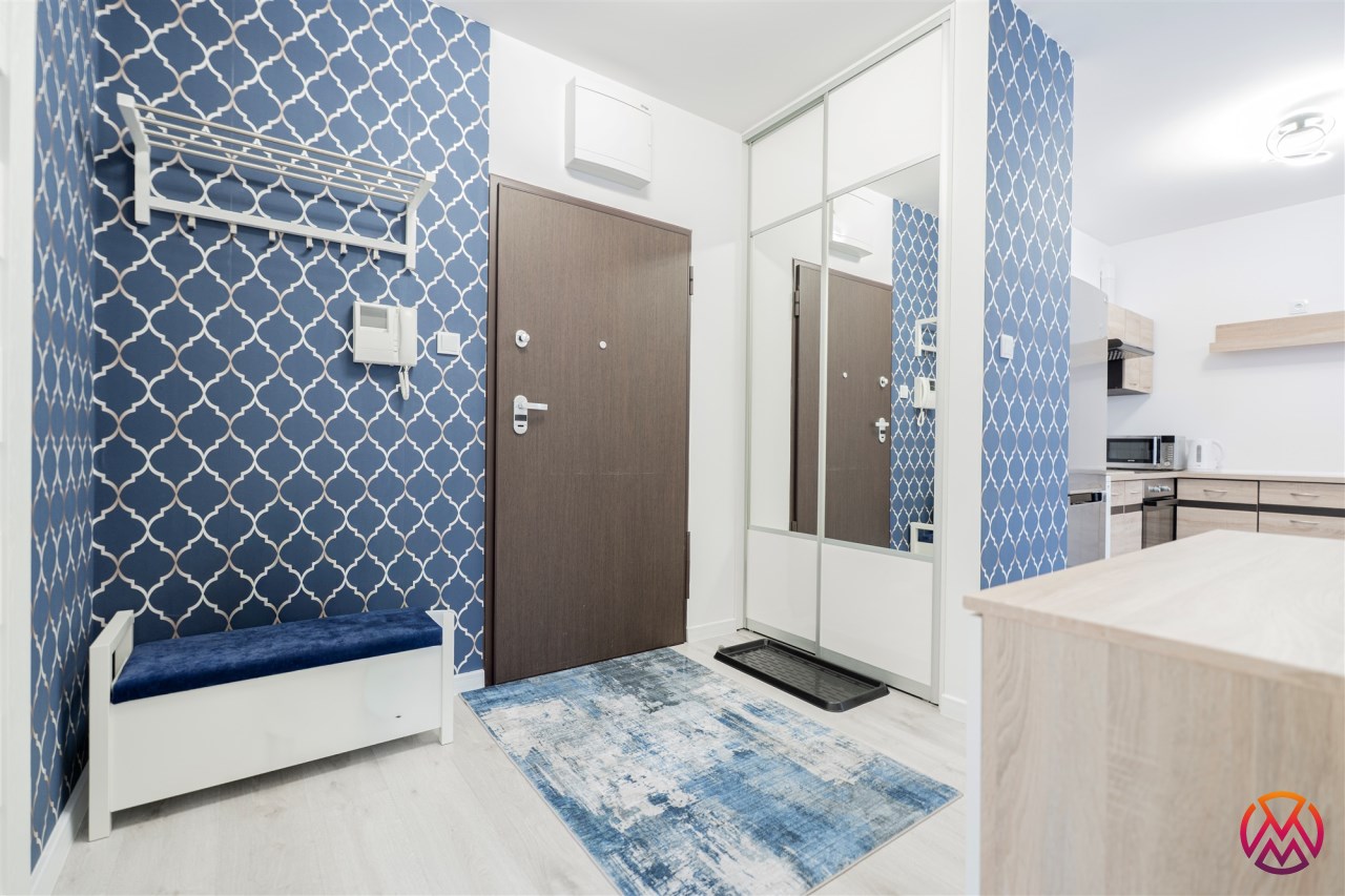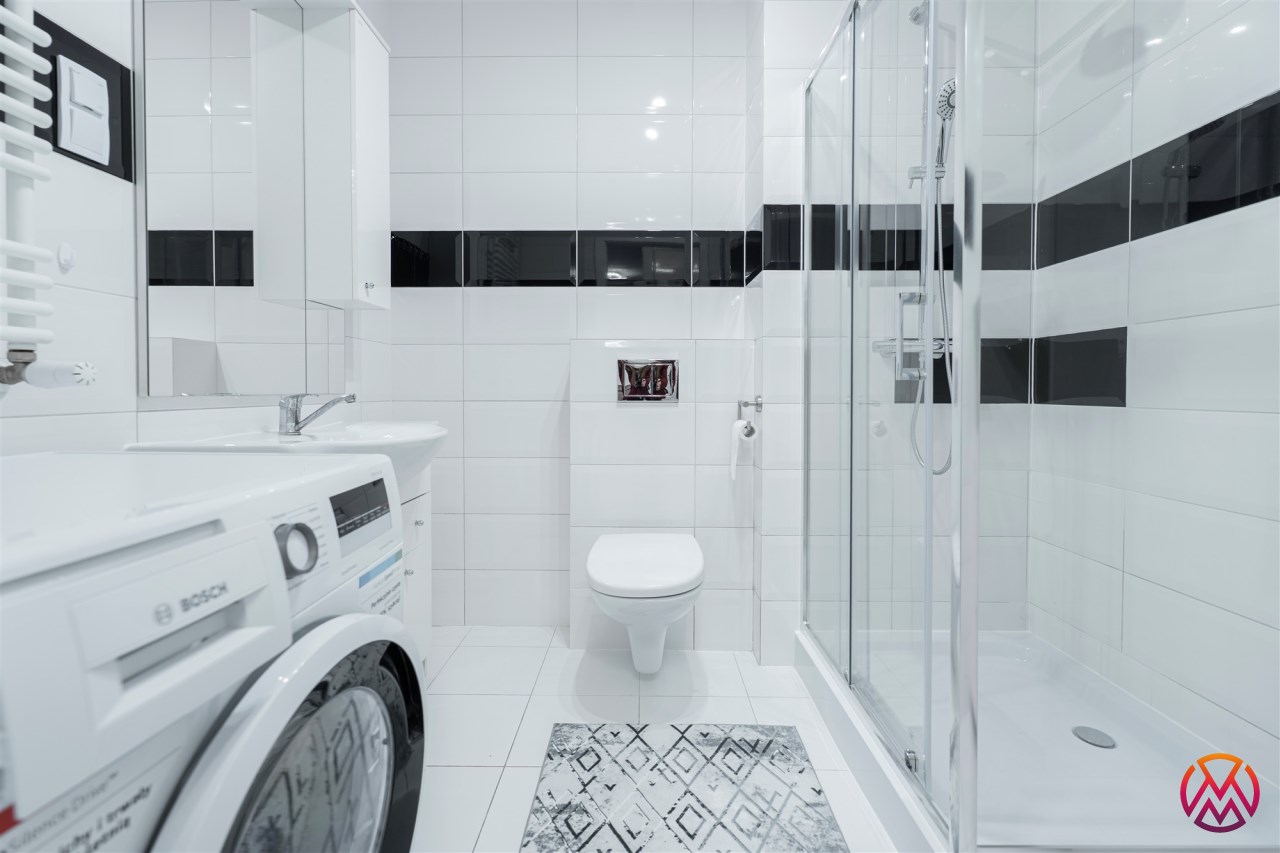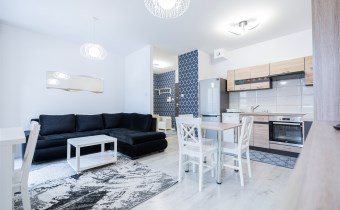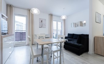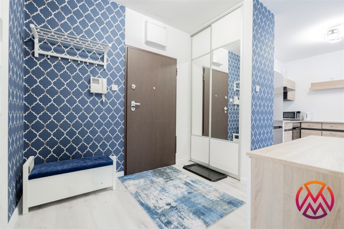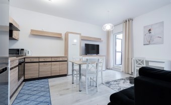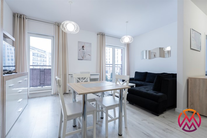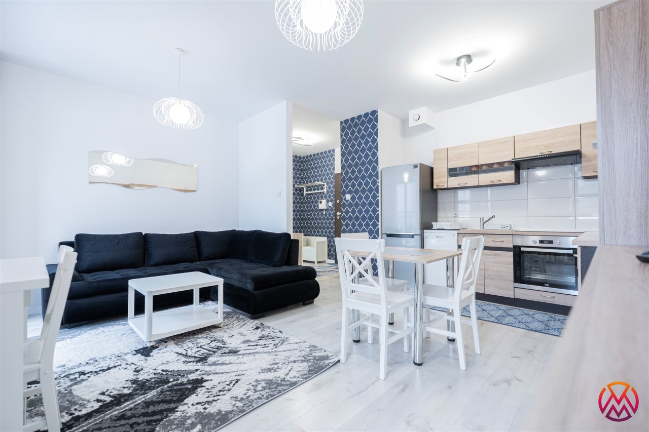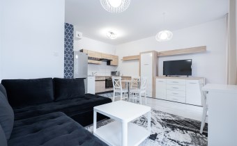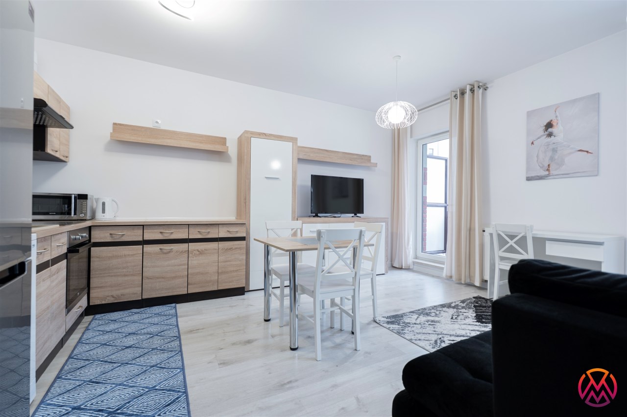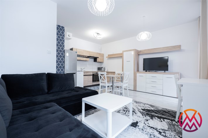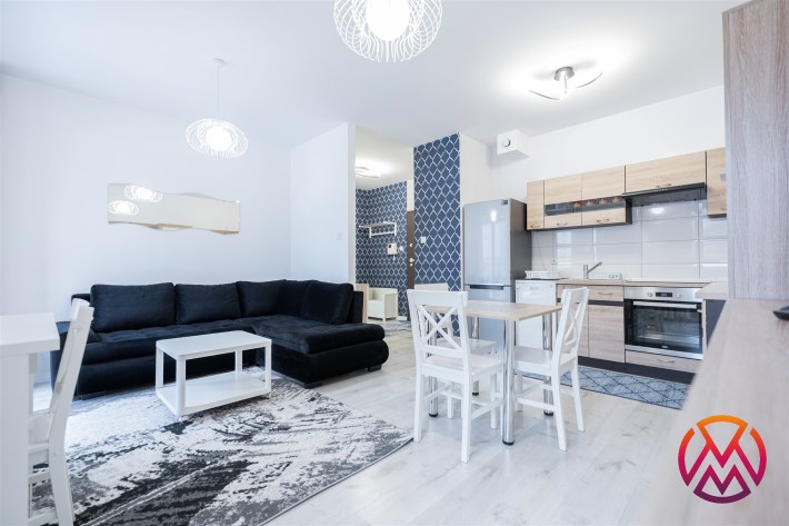 Mieszkanie w pełni wyposażone we wszystkie meble, sprzęty. W salonie kanapa, stół z krzesłami, TV oraz niezbędne umeblowanie. Z salonu wyjście na balkon. Wszystkie okna PCV, w całym mieszkaniu oświetlenie typu LED. Aneks kuchenny posiada wszystkie niezbędne sprzęty: lodówko zamrażarka, piekarnik, płyta indukcyjna, okap, czajnik, zmywarka. Pełne wyposażenie kuchenne: garnki, talerzyki, kubki, sztućce.