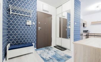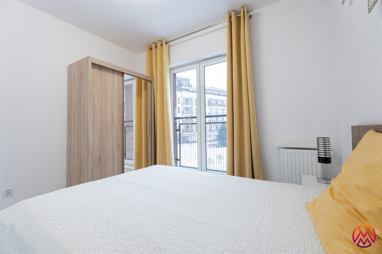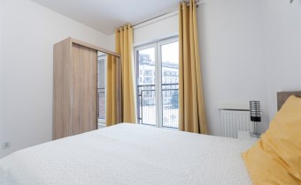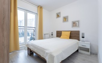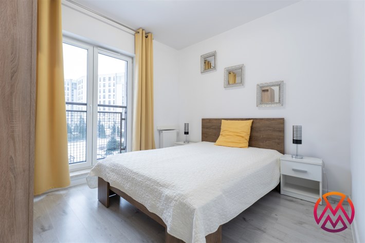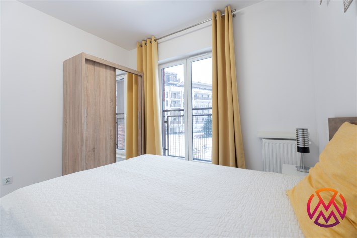 Sypialnia wyposażona w podwójne łóżko, szafę oraz biurko. W korytarzu pojemna szafa przesuwna typu komandor. Mieszkanie wyposażone w wysokie panoramiczne szyby, dzięki czemu jest doskonale doświetlone.