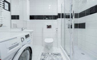 Łazienka przestronna, wyposażona w kabinę prysznicową z deszczownicą i biczami. Dodatkowo lustro, pralka, WC i umywalka. Wszystko zaaranżowane w jasnych, przyjemnych kolorach.