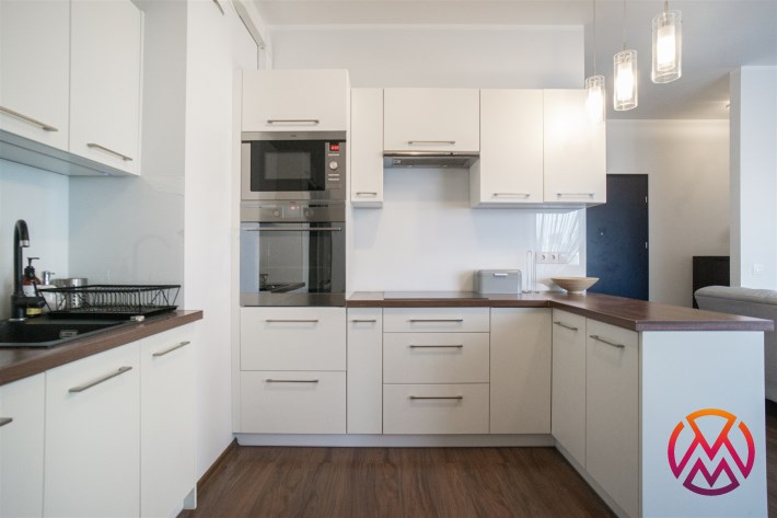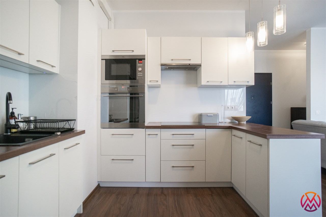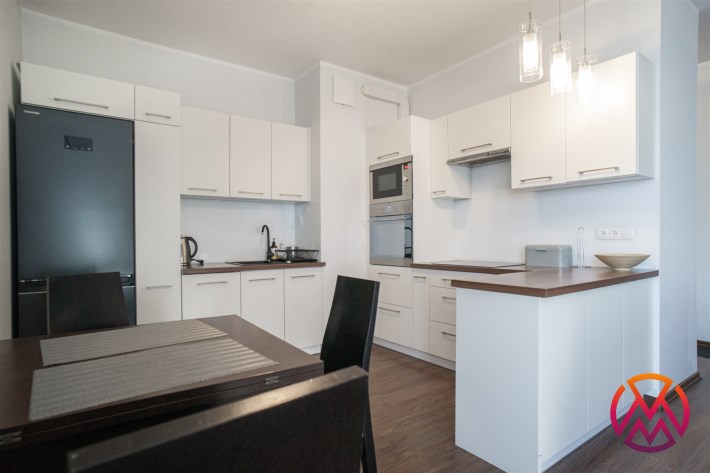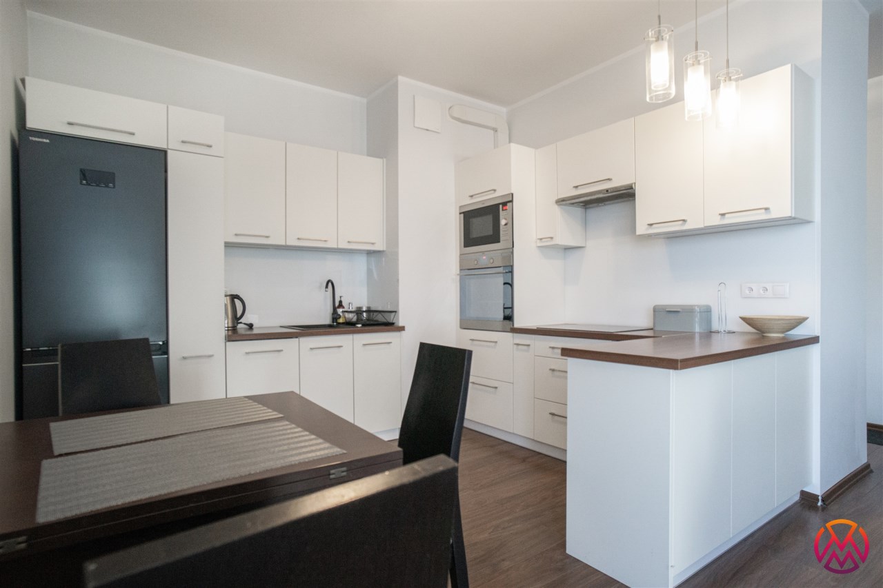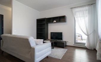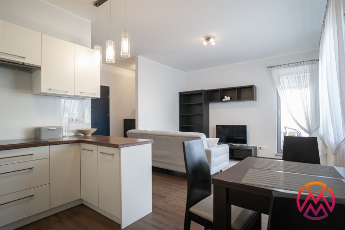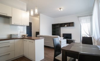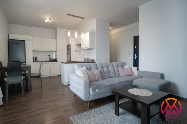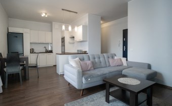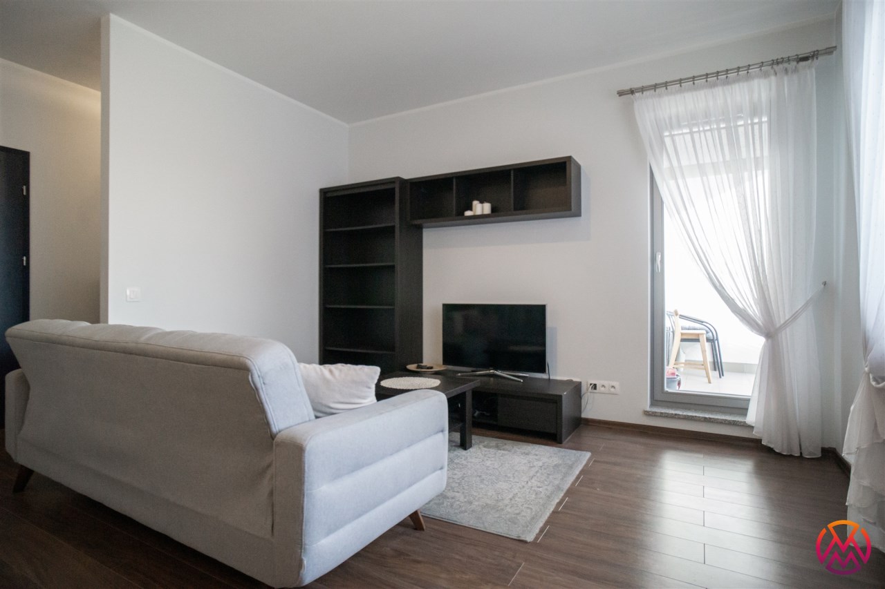 Salon posiada komfortowy wypoczynek z funkcją spania, stolik, szafkę RTV i TV. Salon połączony z aneksem kuchennym, wyposażonym we wszystkie niezbędne sprzęty: lodówka z zamrażarką, piekarnik, płyta, okap, zmywarka oraz wyposażenie kuchenne. Wszystkie sprzęty oraz cała zabudowa w bardzo dobrym stanie, niezużyte. Dużym atutem mieszkania jest balkon o powierzchni około 5 m2 z wystawą na przepięknie zagospodarowane i zadbane osiedle.