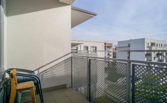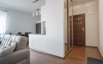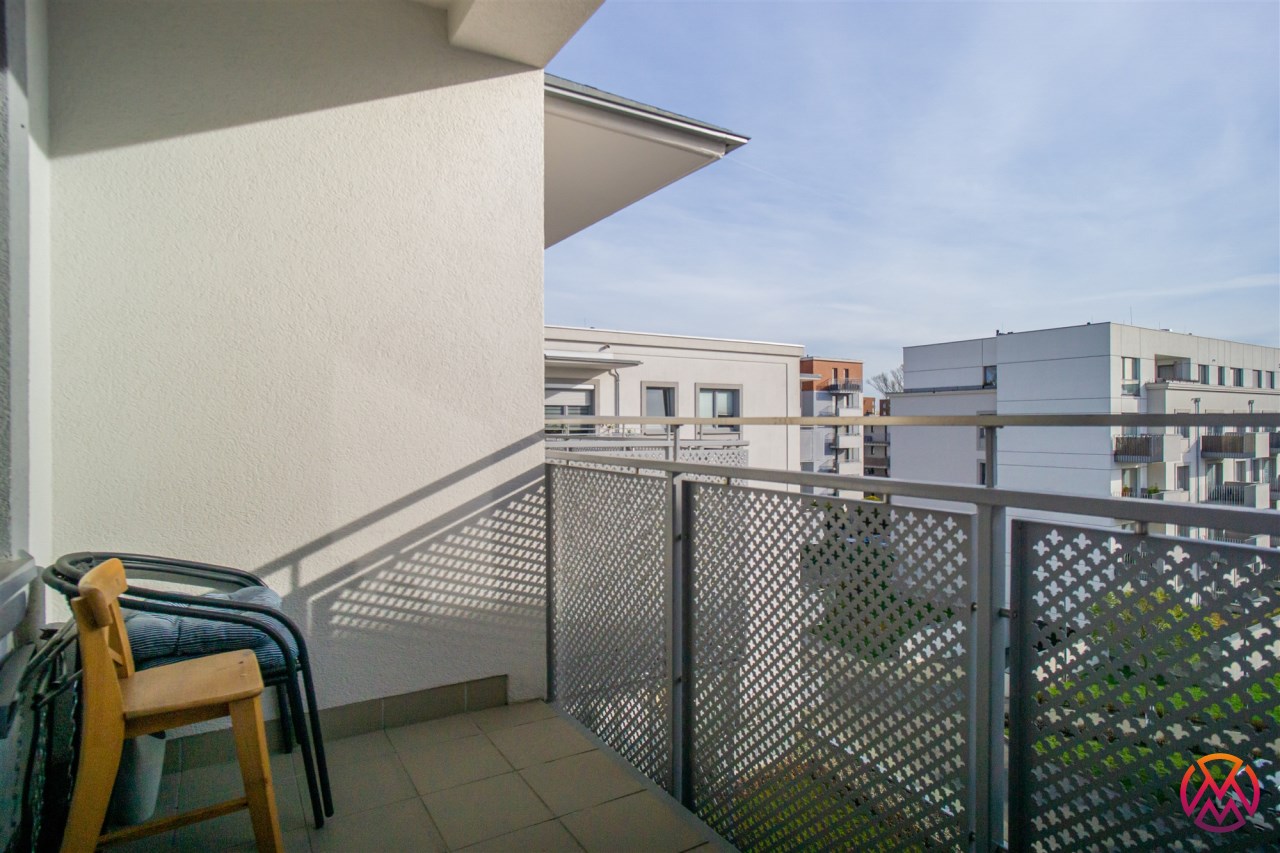 Mieszkanie składa się z dwóch pokoi - salonu z aneksem kuchennym, sypialni, przedpokoju i łazienki wraz z WC. Z salonu wyjście na balkon, z którego mamy widok na patio, plac zabaw oraz osiedle.