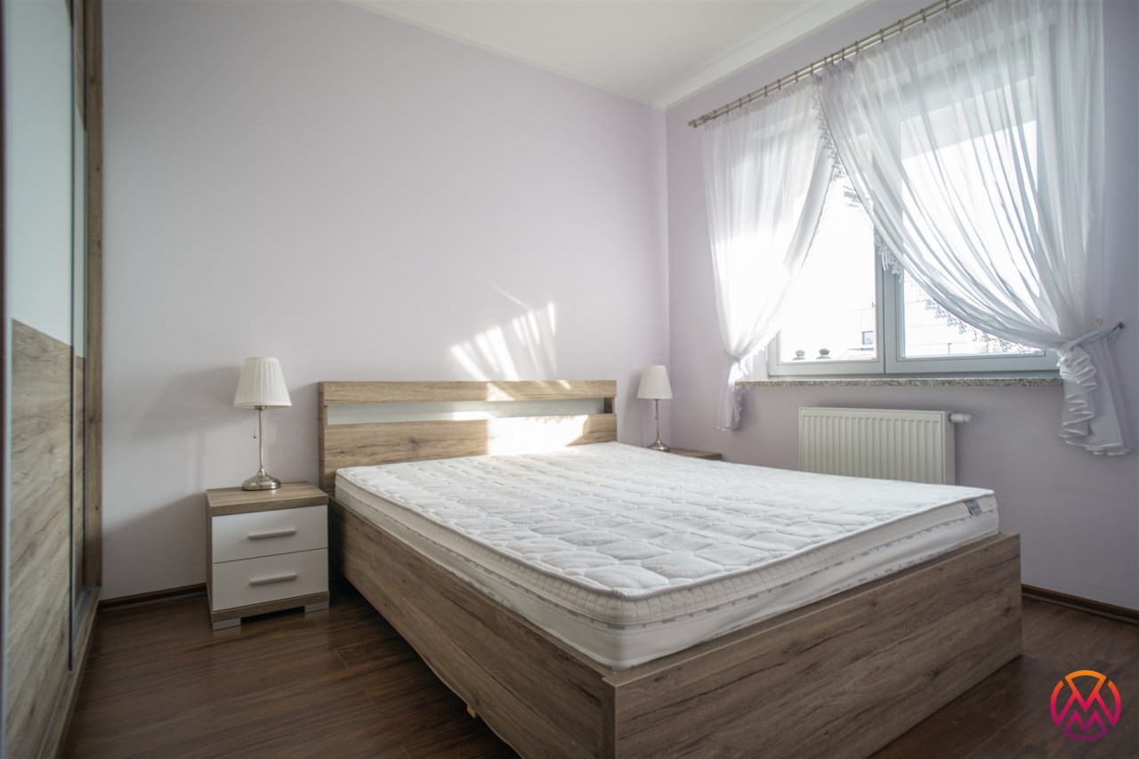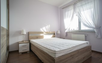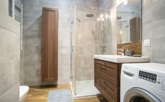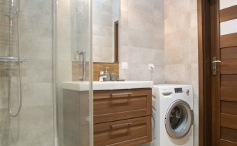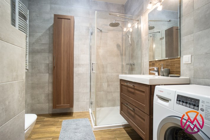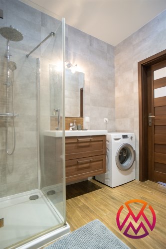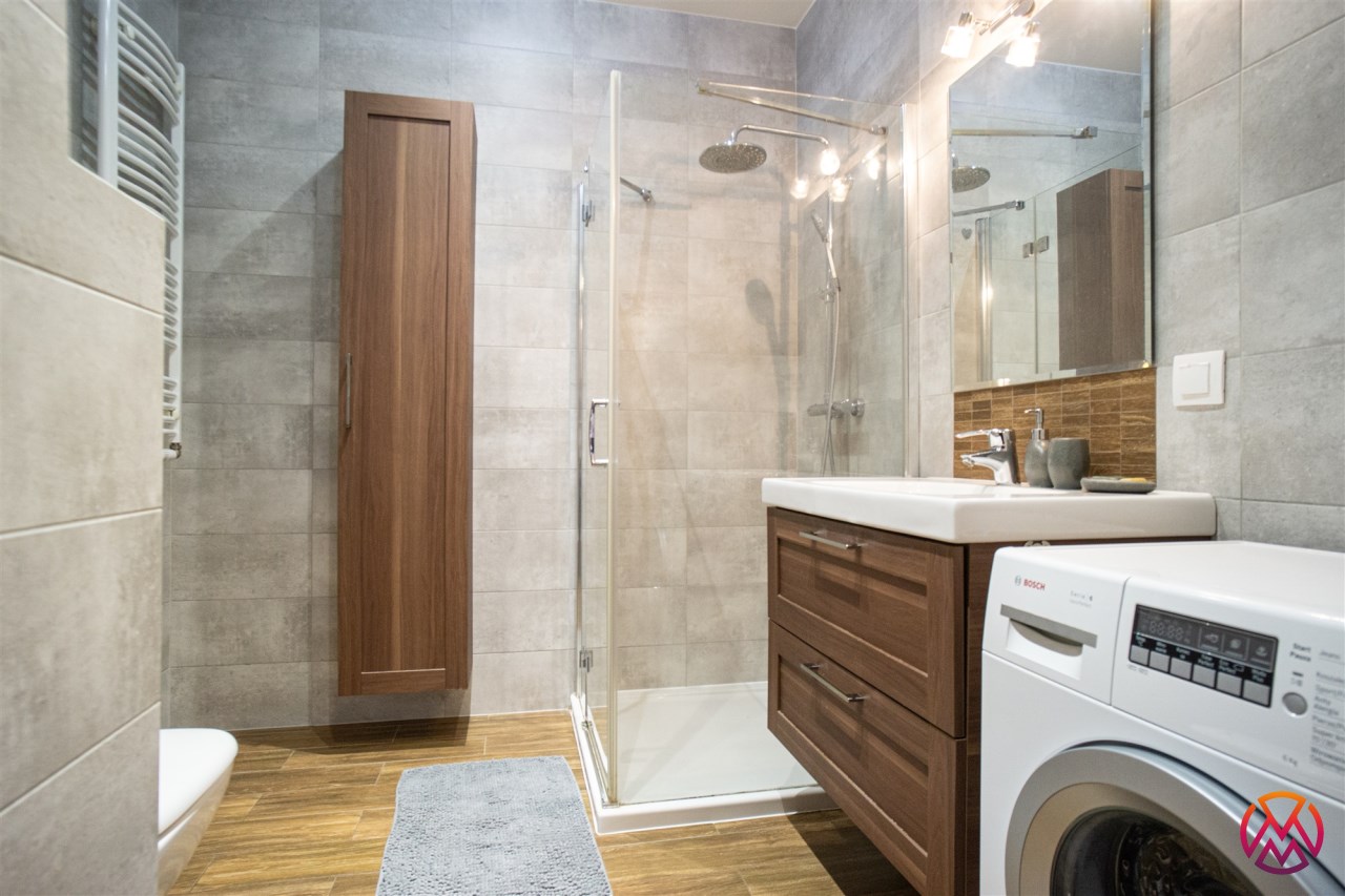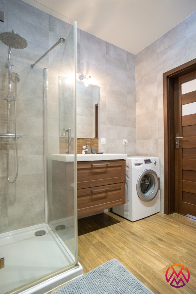 Sypialnia wyposażona w łóżko dwuosobowe, stolik nocny oraz pojemną szafę. Łazienka wyposażona w duży prysznic, WC oraz pralkę, dodatkowo funkcjonalne szafki.