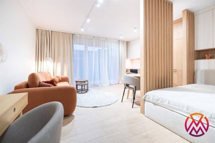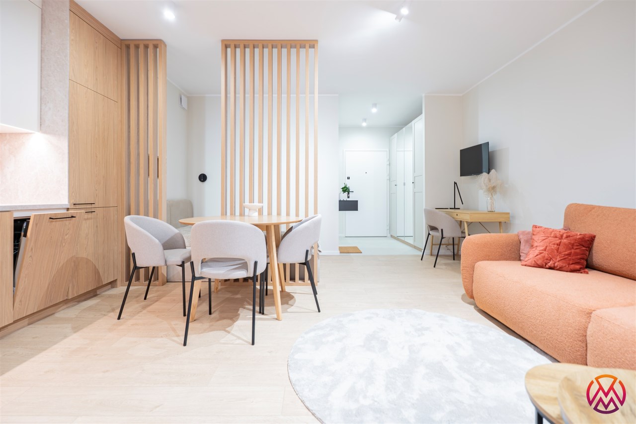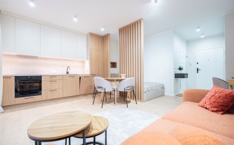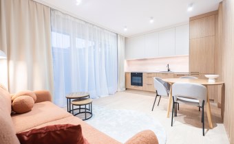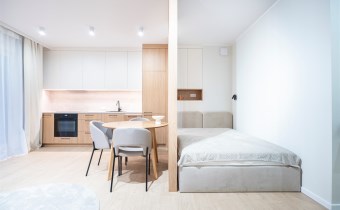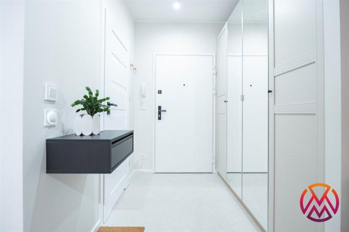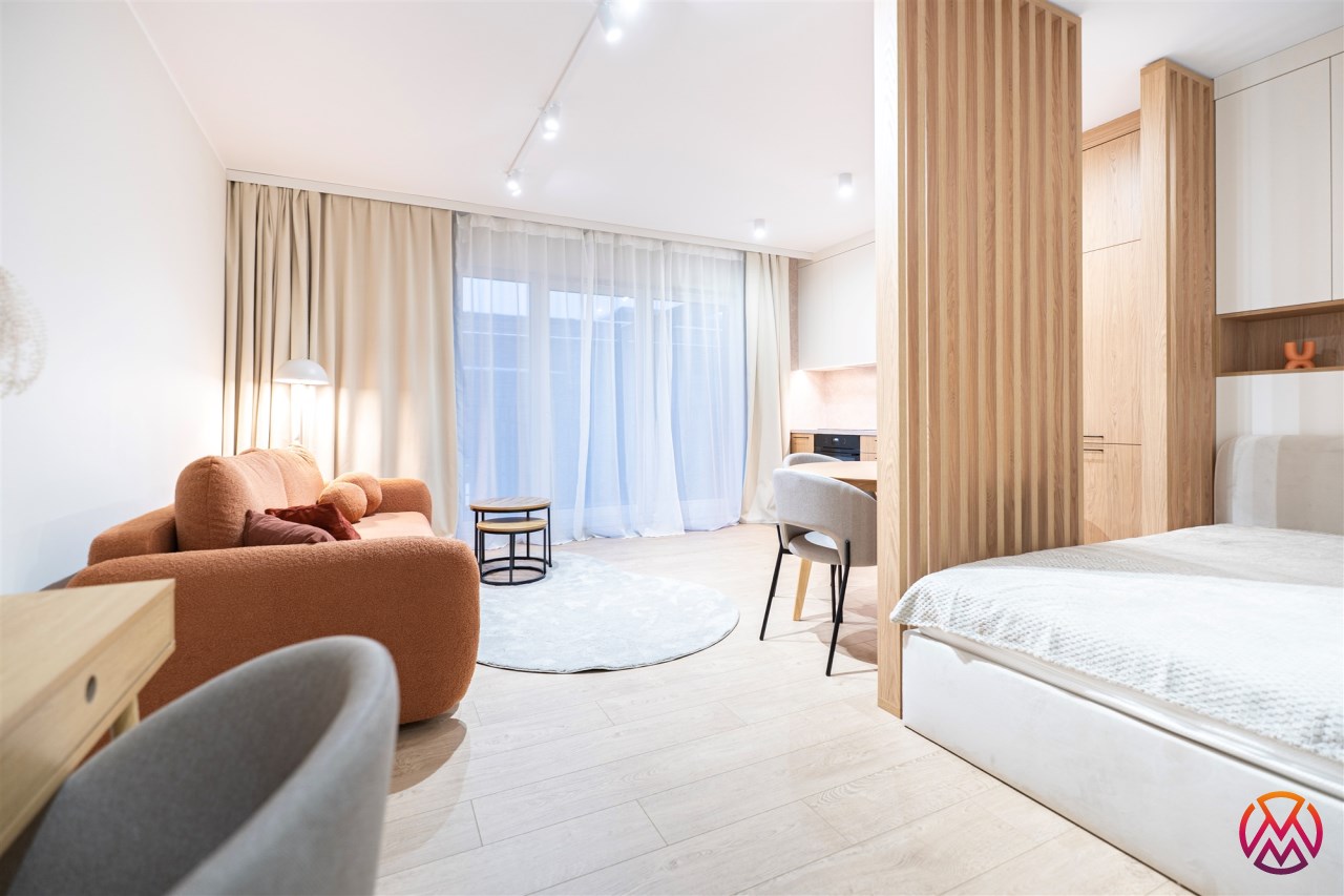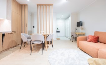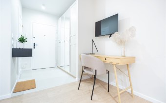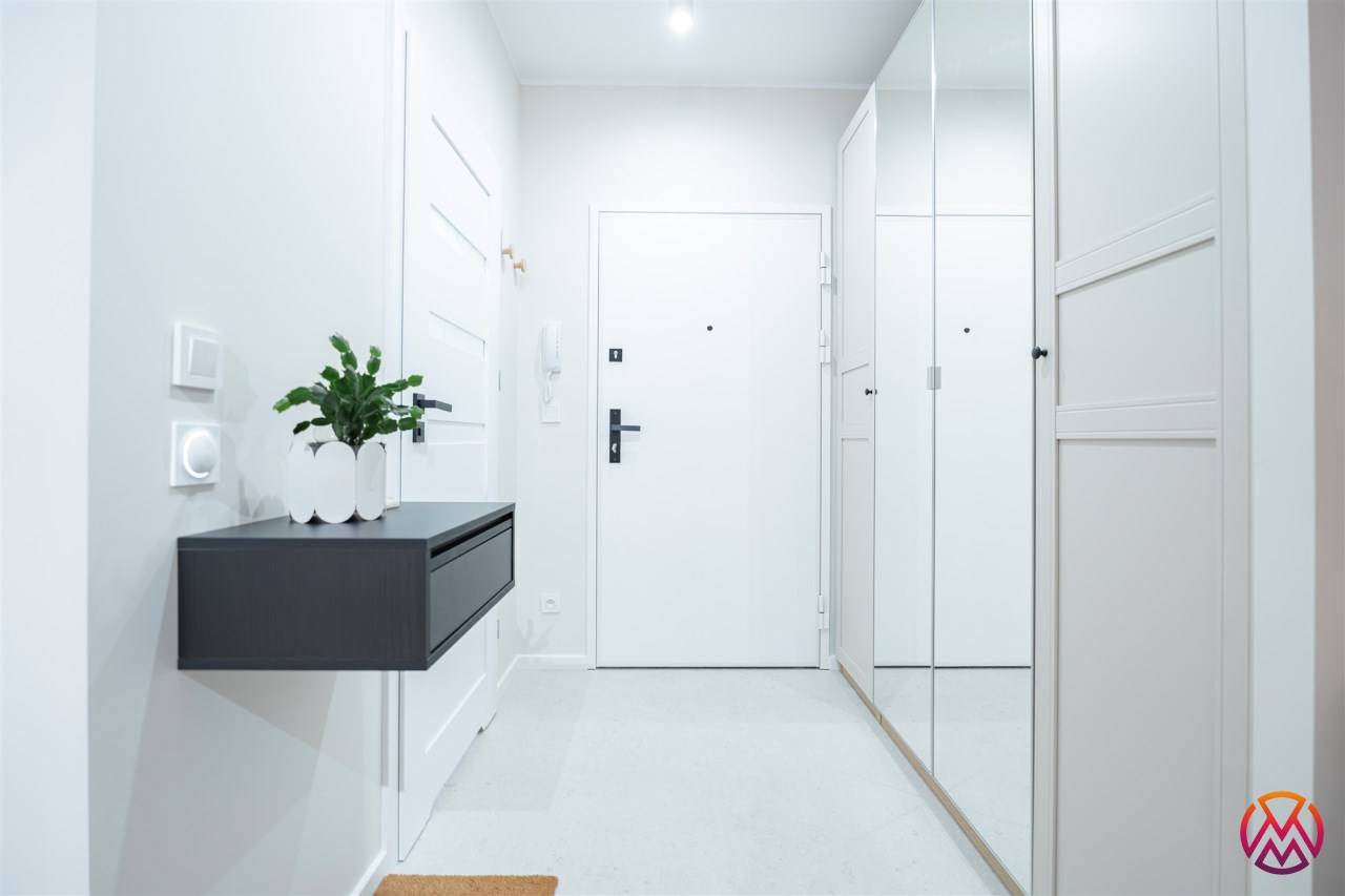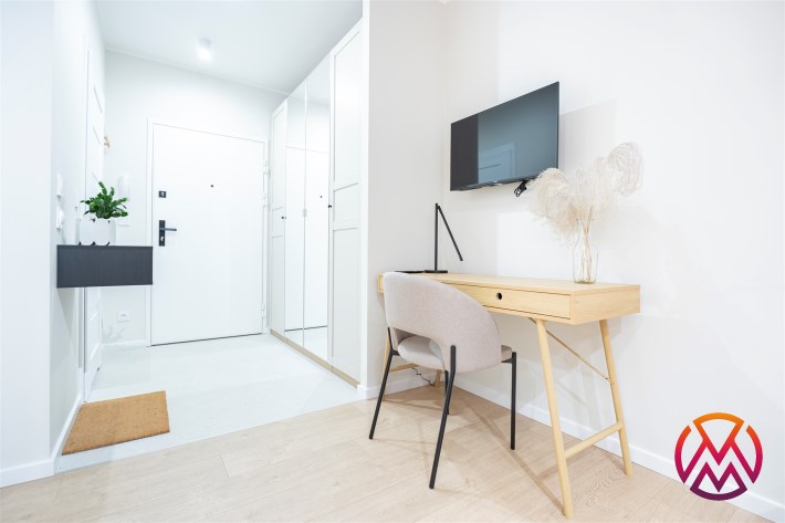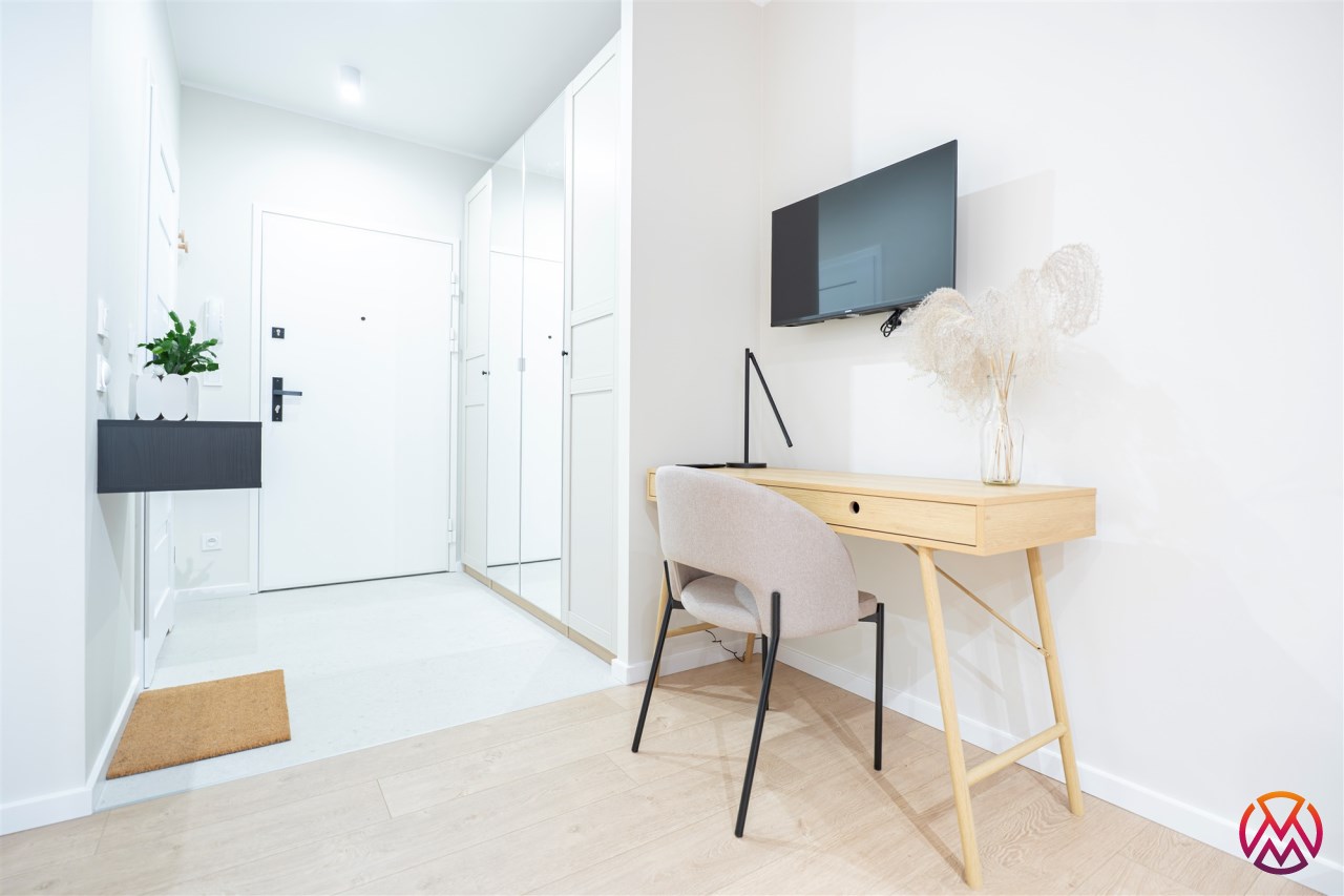 W salonie znajdziemy wygodną rozkładaną sofę, szafkę RTV, TV, stół z krzesłami oraz biurko, zaś w sypialni podwójne łóżko oraz szafki w zabudowie. Aneks kuchenny wyposażony w lodówko-zamrażarkę, zmywarkę, piekarnik, płytę indukcyjną. Toaleta z prysznicem typu walk-in, umywalką, pralką oraz WC. Dodatkowo w przedpokoju znajduje się pakowna szafa z licznym miejscem do przechowywania.