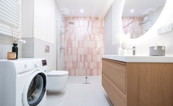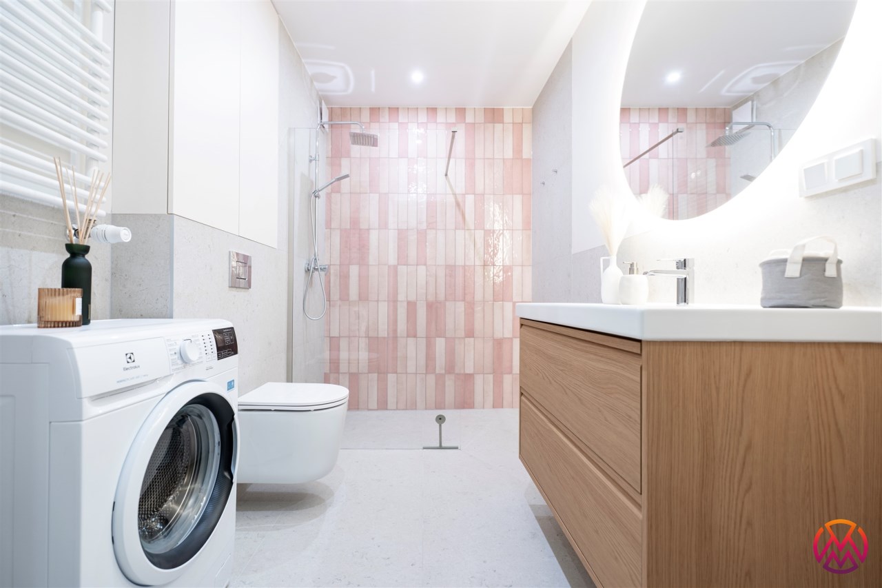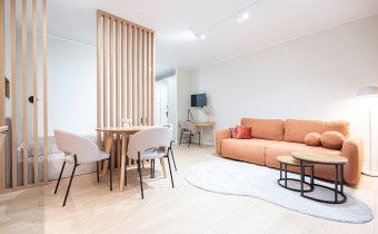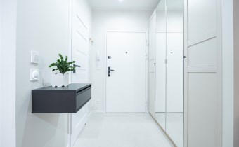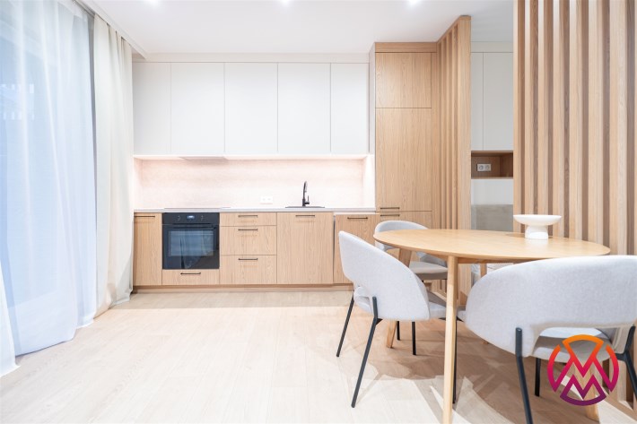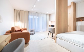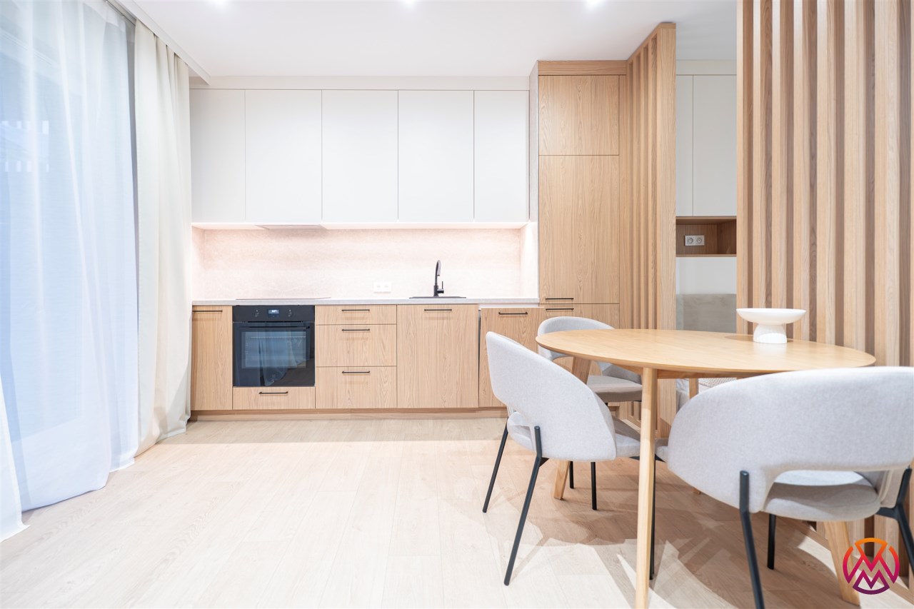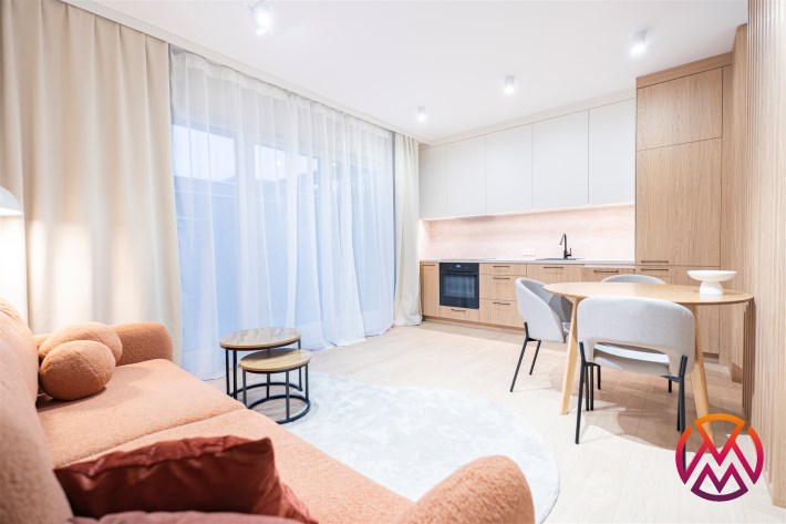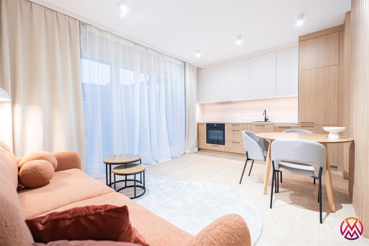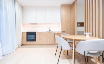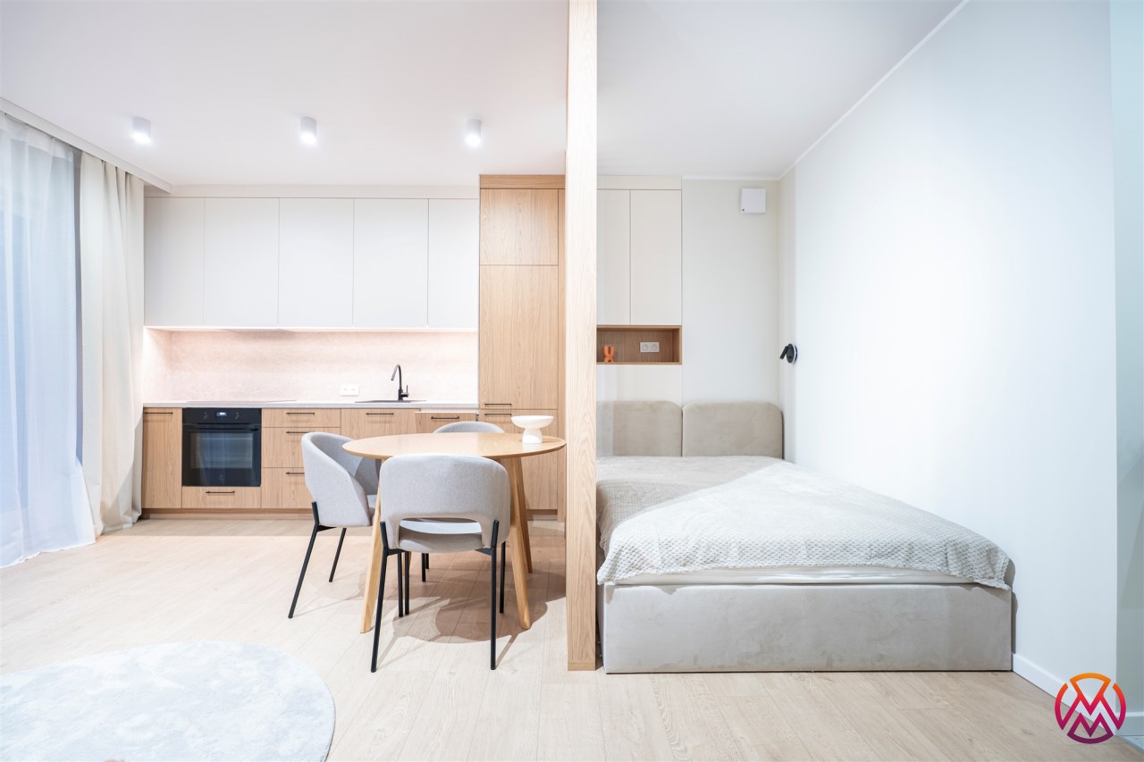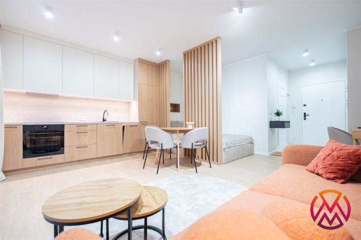 W salonie znajdziemy wygodną rozkładaną sofę, szafkę RTV, TV, stół z krzesłami oraz biurko, zaś w sypialni podwójne łóżko oraz szafki w zabudowie. Aneks kuchenny wyposażony w lodówko-zamrażarkę, zmywarkę, piekarnik, płytę indukcyjną. Toaleta z prysznicem typu walk-in, umywalką, pralką oraz WC. Dodatkowo w przedpokoju znajduje się pakowna szafa z licznym miejscem do przechowywania.