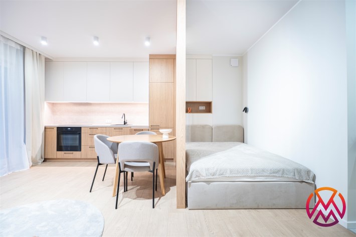 Apartament składa się z salonu z aneksem kuchennym, wydzielonej części sypialnianej, łazienki razem z WC oraz przedpokoju. Atutem mieszkania jest duża przestrzeń do przechowywania.