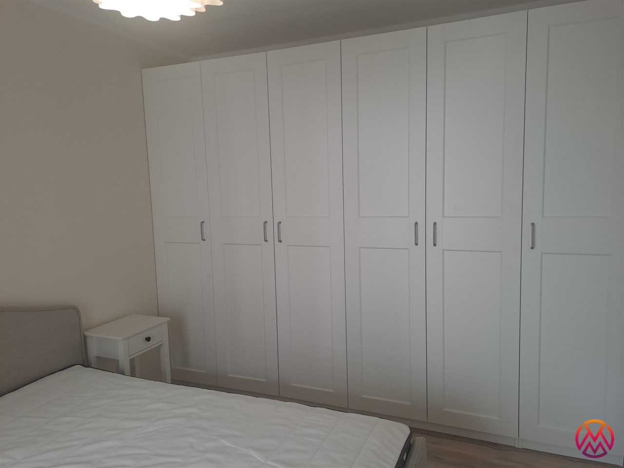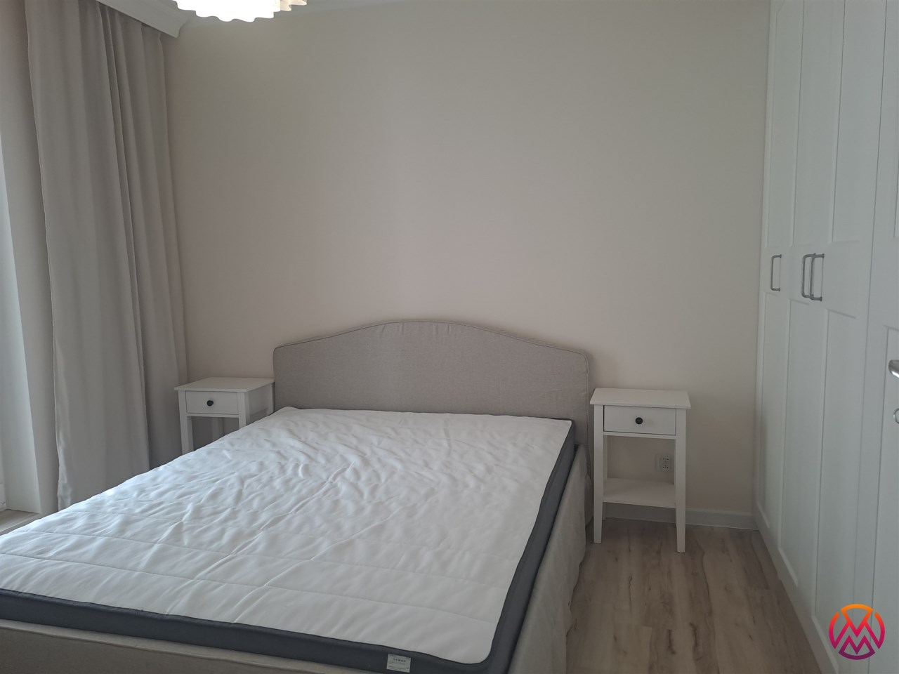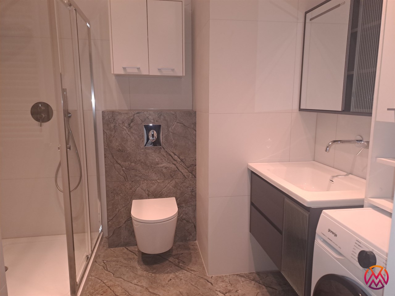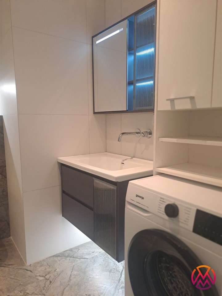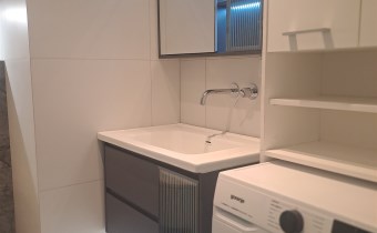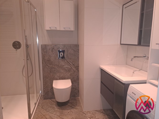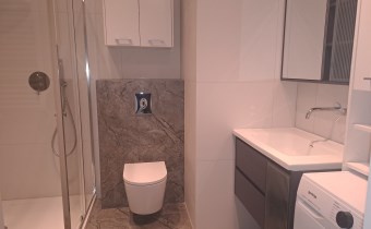 Dodatkowo w przedpokoju również znajdują się 2 pakowne szafy. W łazience natomiast prysznic, toaleta, umywalka i pralka oraz liczne szafki. Całość prezentuje się bardzo gustownie, nowocześnie. Apartament wykończony w wysokim standardzie pod okiem projektanta.