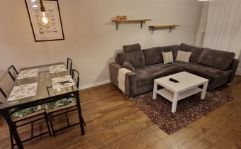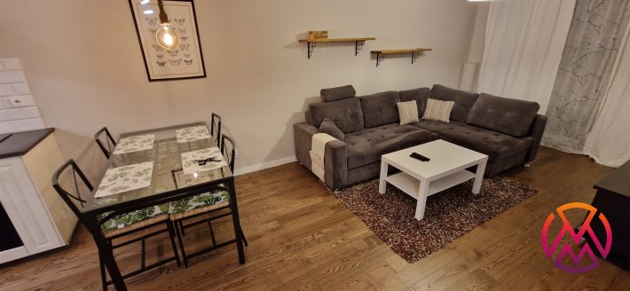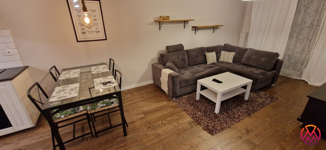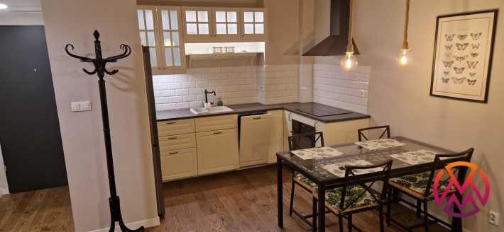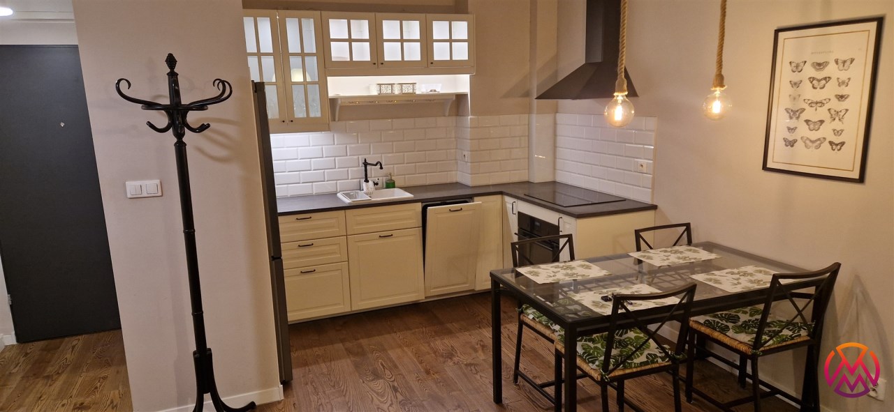 Mieszkanie w pełni umeblowane. W salonie znajdziemy wygodną kanapę, szafkę RTV, telewizor, stolik kawowy, regał oraz stół z krzesłami. W sypialni mieści się podwójne łóżko z materacem oraz szafa. Funkcjonalna kuchnia została wyposażona we wszystkie niezbędne sprzęty: lodówko-zamrażarkę, zmywarkę, płytę indukcyjną, piekarnik elektryczny, okap. Łazienka wraz z WC, w której znajdziemy prysznic typu walk-in, umywalkę oraz pralkę. W przedpokoju znajduje się pakowna szafa w zabudowie
