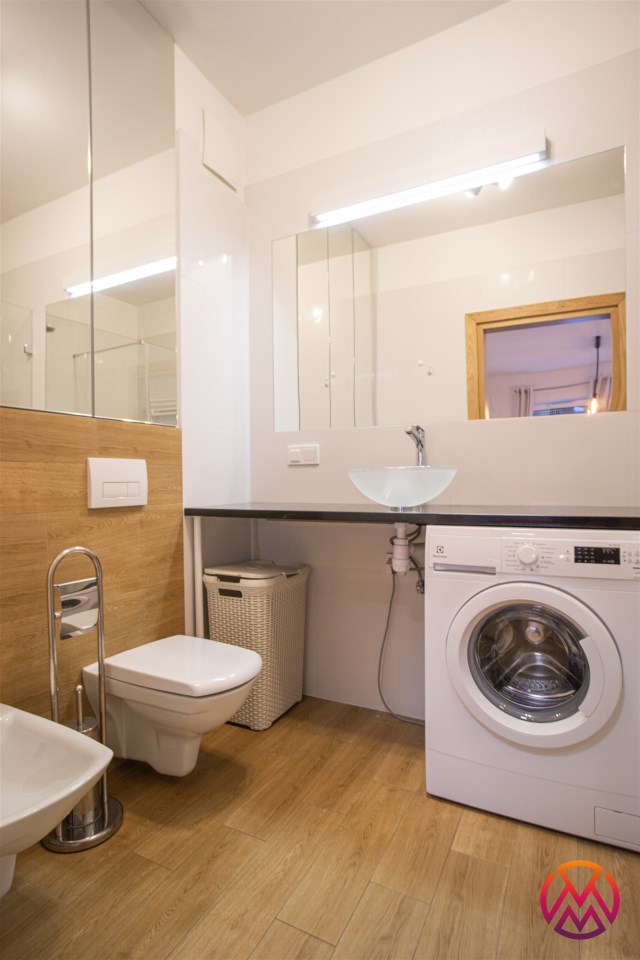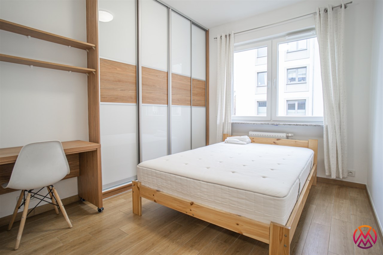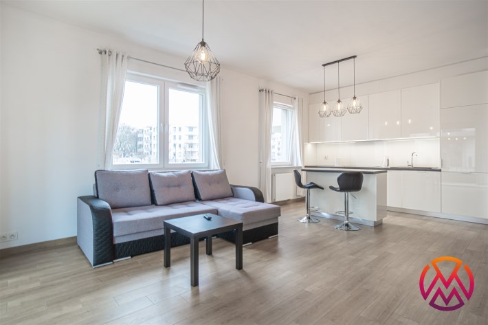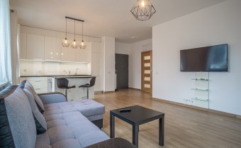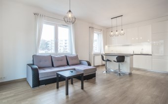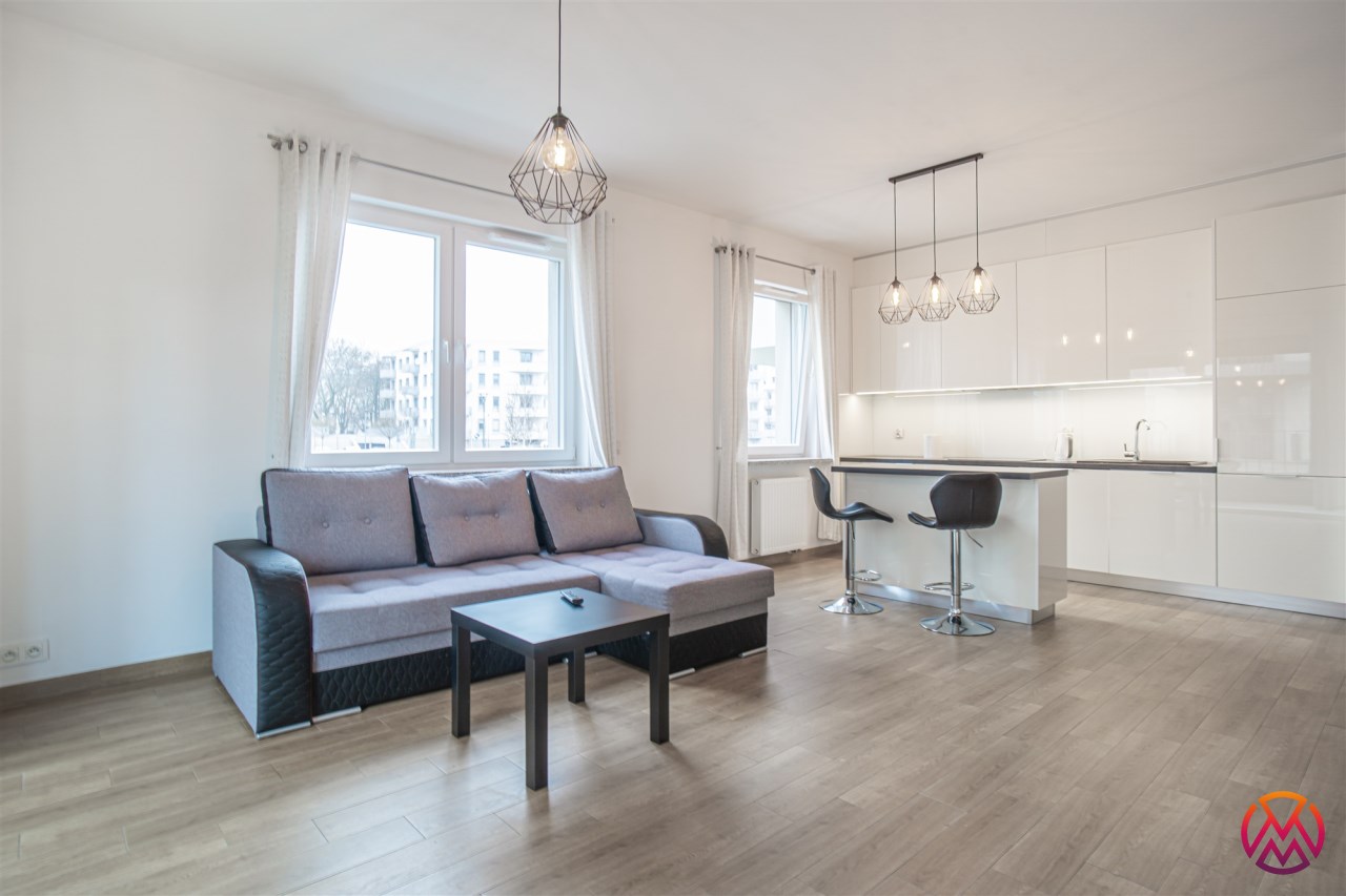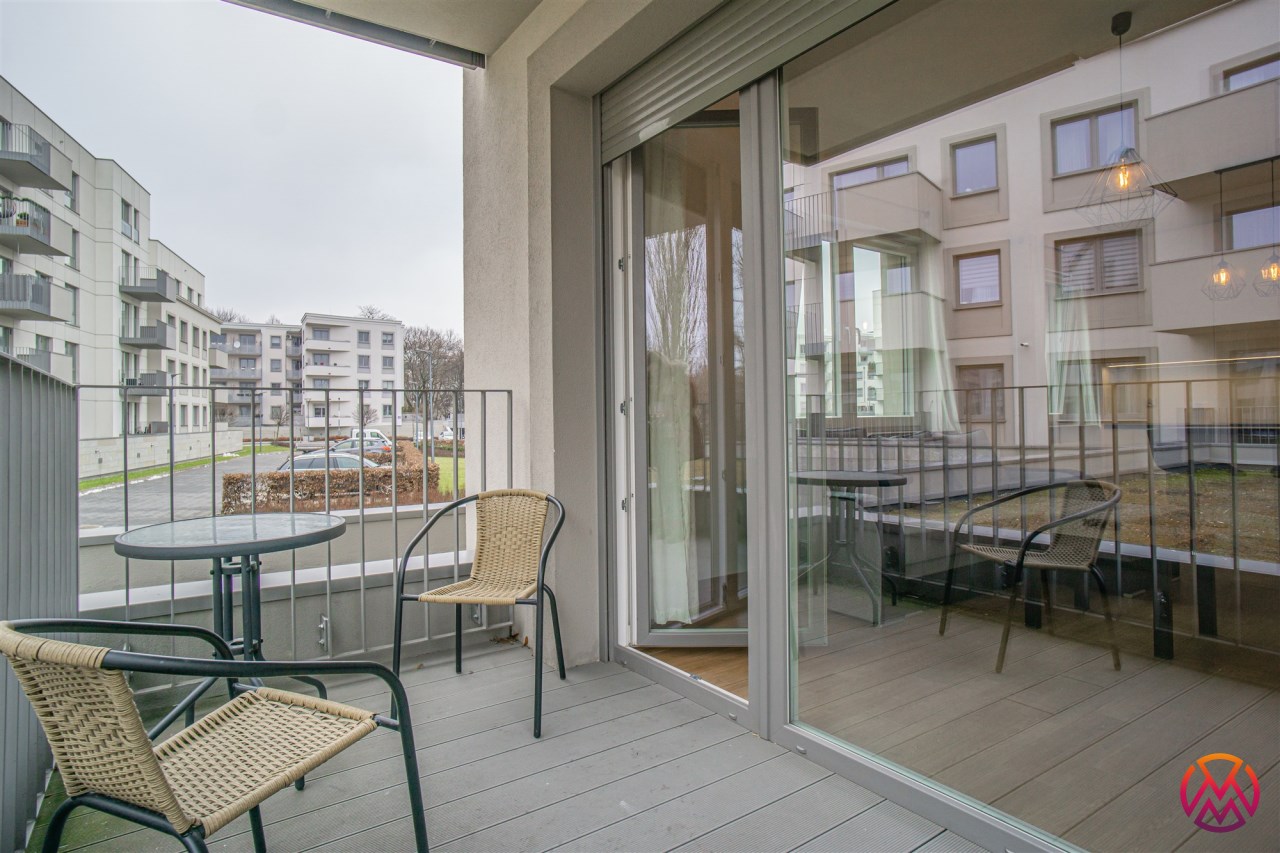 W pełni umeblowane, gotowe do zamieszkanie. W salonie znajduje się wygodna rozkładana kanapa, stolik kawowy, szafka RTV, TV oraz stół z krzesłami. Kuchnia została wyposażona we wszystkie niezbędne sprzęty - lodówka z zamrażarką, piekarnik, płyta indukcyjna, okap, zmywarka, mikrofala, a także komplet sztućców i naczyń. Sypialnia została wyposażona w podwójne łóżko z materacem, pakowną szafę oraz biurko. Łazienka z prysznicem, umywalką oraz pralką. Dodatkowo mieszkanie balkon z widokiem na patio.