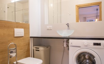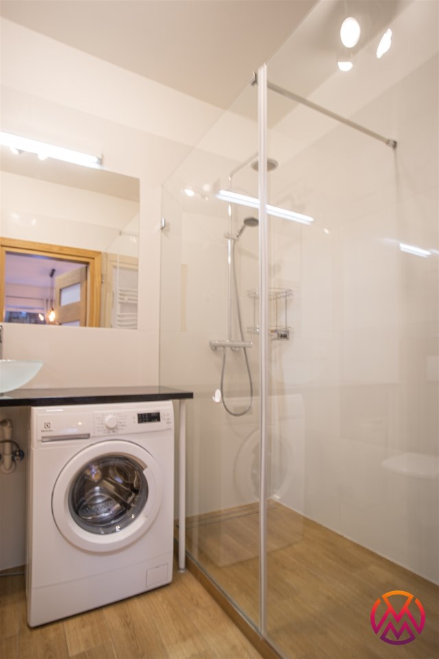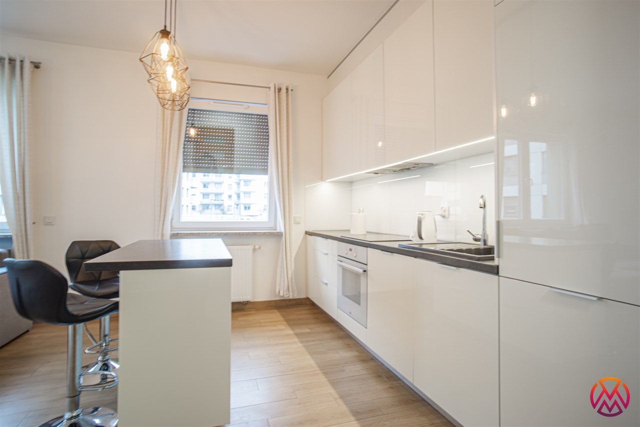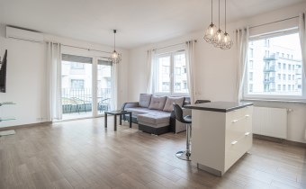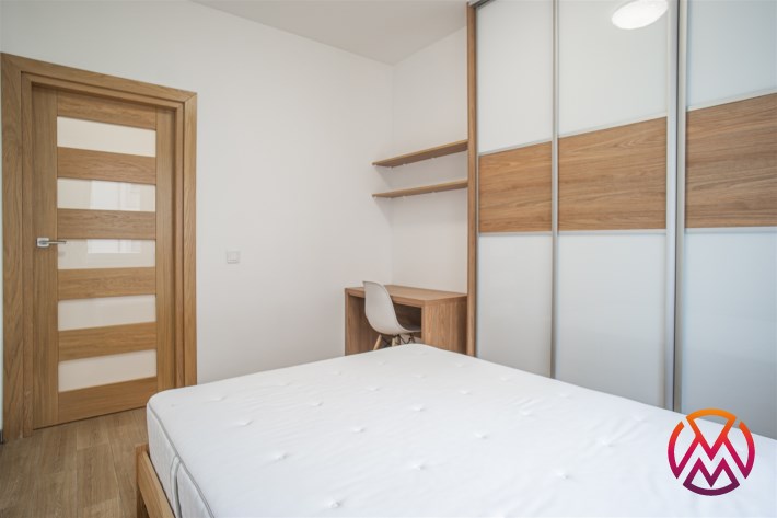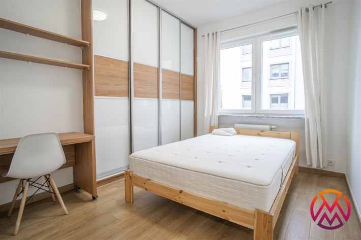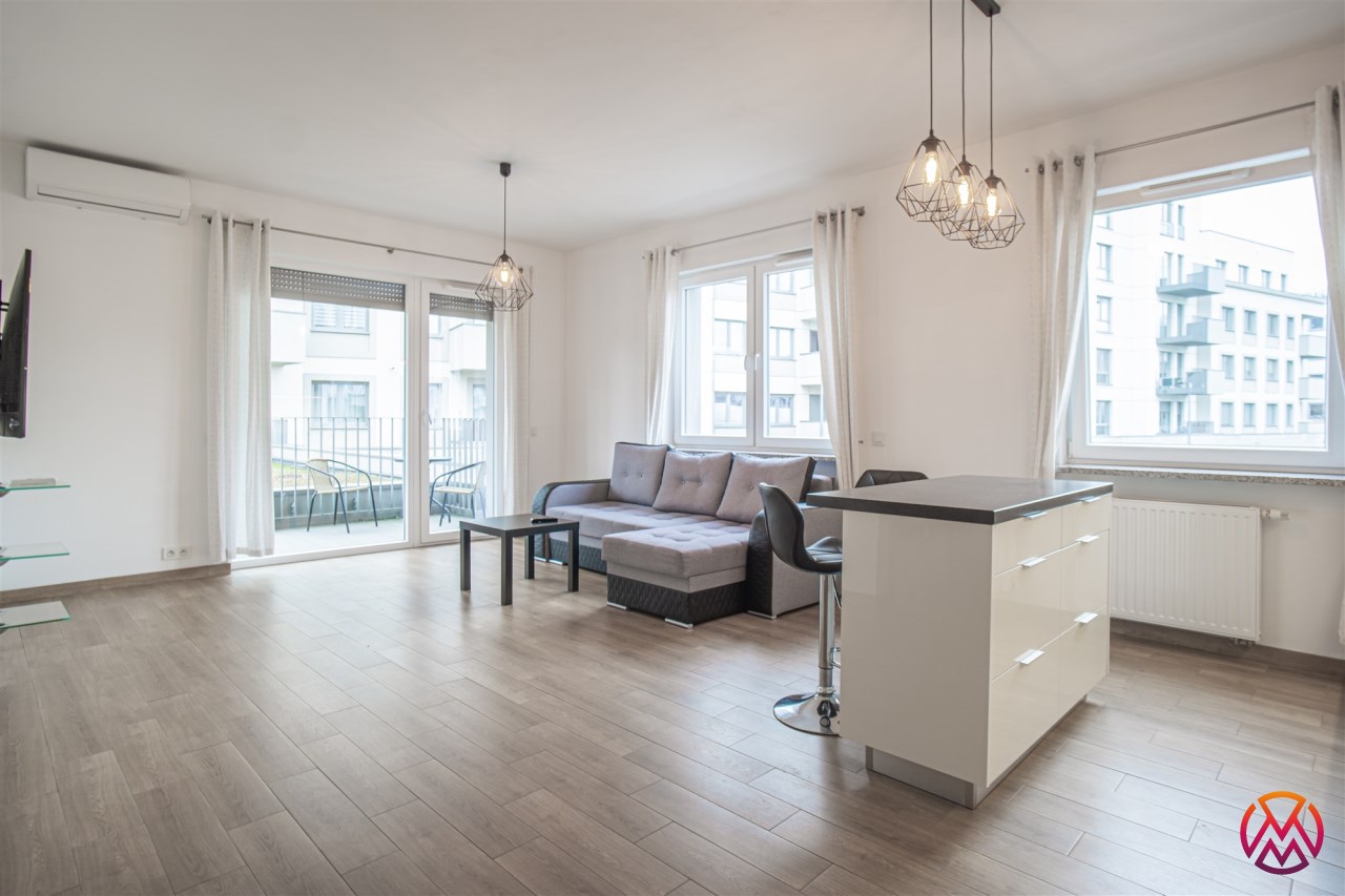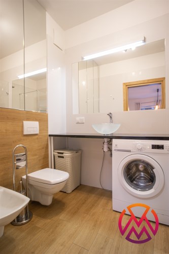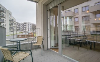 W pełni umeblowane, gotowe do zamieszkanie. W salonie znajduje się wygodna rozkładana kanapa, stolik kawowy, szafka RTV, TV oraz stół z krzesłami. Kuchnia została wyposażona we wszystkie niezbędne sprzęty - lodówka z zamrażarką, piekarnik, płyta indukcyjna, okap, zmywarka, mikrofala, a także komplet sztućców i naczyń. Sypialnia została wyposażona w podwójne łóżko z materacem, pakowną szafę oraz biurko. Łazienka z prysznicem, umywalką oraz pralką. Dodatkowo mieszkanie balkon z widokiem na patio.