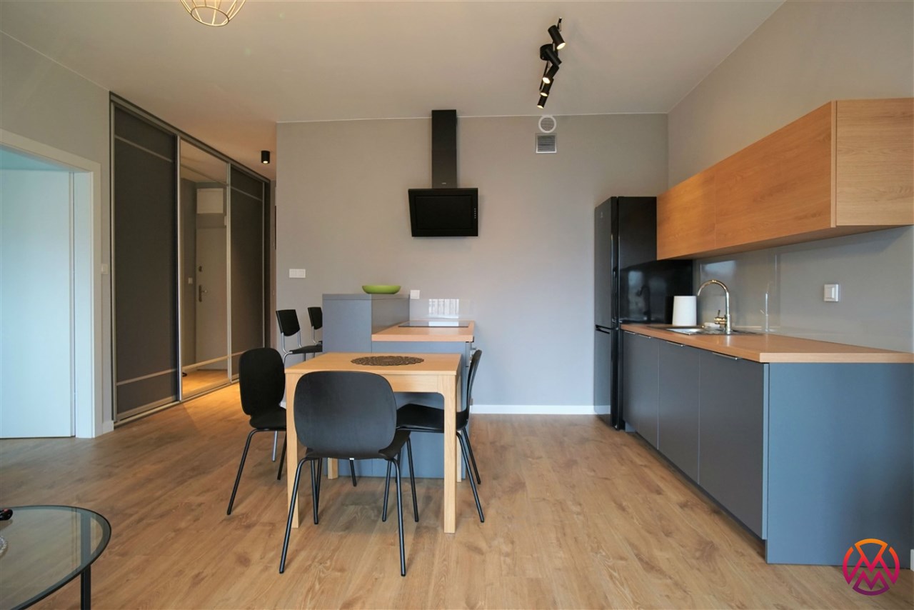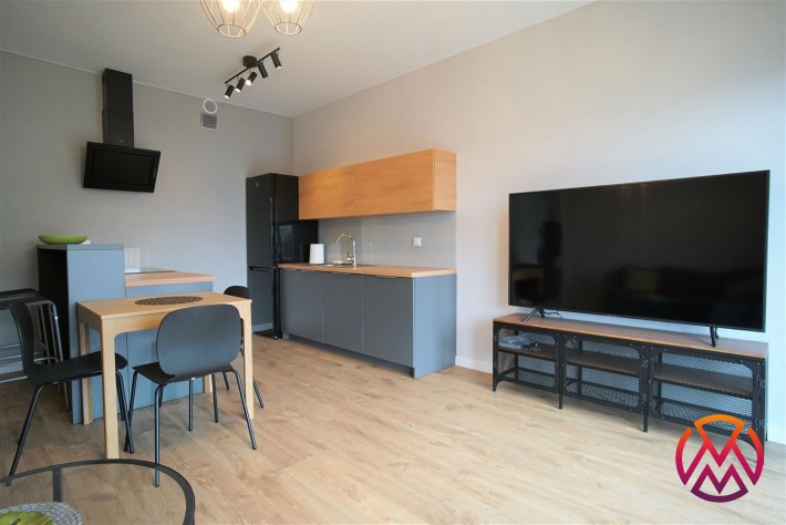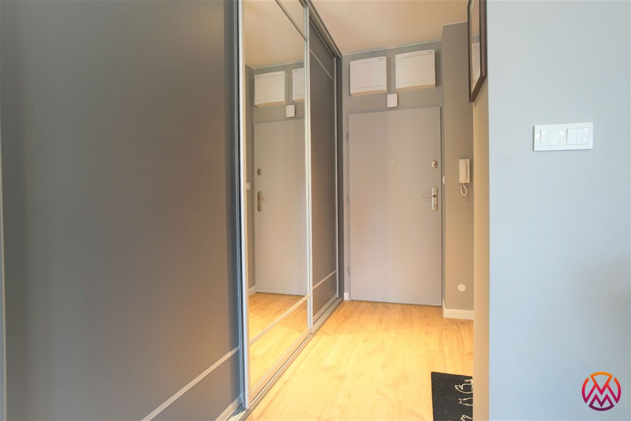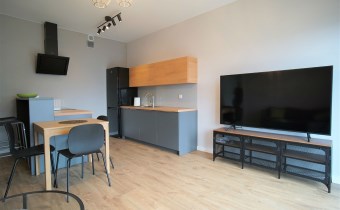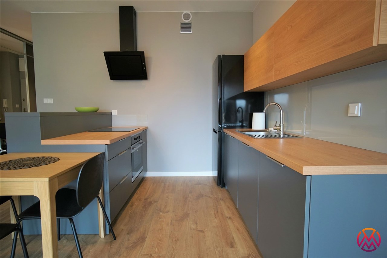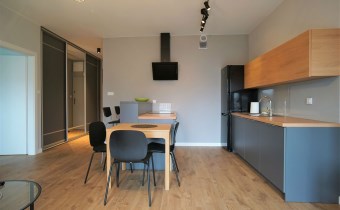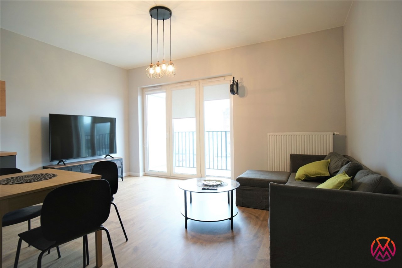 Apartament został wykończony w nowoczesny, niebanalny sposób. Przeważają jasne kolory. W pełni umeblowane. W salonie znajdziemy wygodny komplet wypoczynkowy, stoliki kawowe, szafkę RTV z dużym telewizorem. Aneks kuchenny wyposażony w lodówko-zamrażarkę, zmywarkę, piekarnik, płytę indukcyjną. W sypialni znajduje się wygodne, podwójne łóżko z materacem, pakowna szafa, biurko oraz szafki nocne z oświetleniem. Toaleta z prysznicem, pralką i WC. Dodatkowo w przedpokoju miejsce znalazła bardzo pojemna, 3-skrzydłowa szafa w zabudowie.