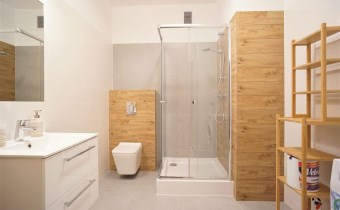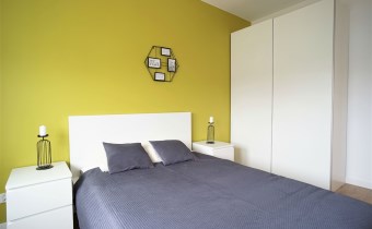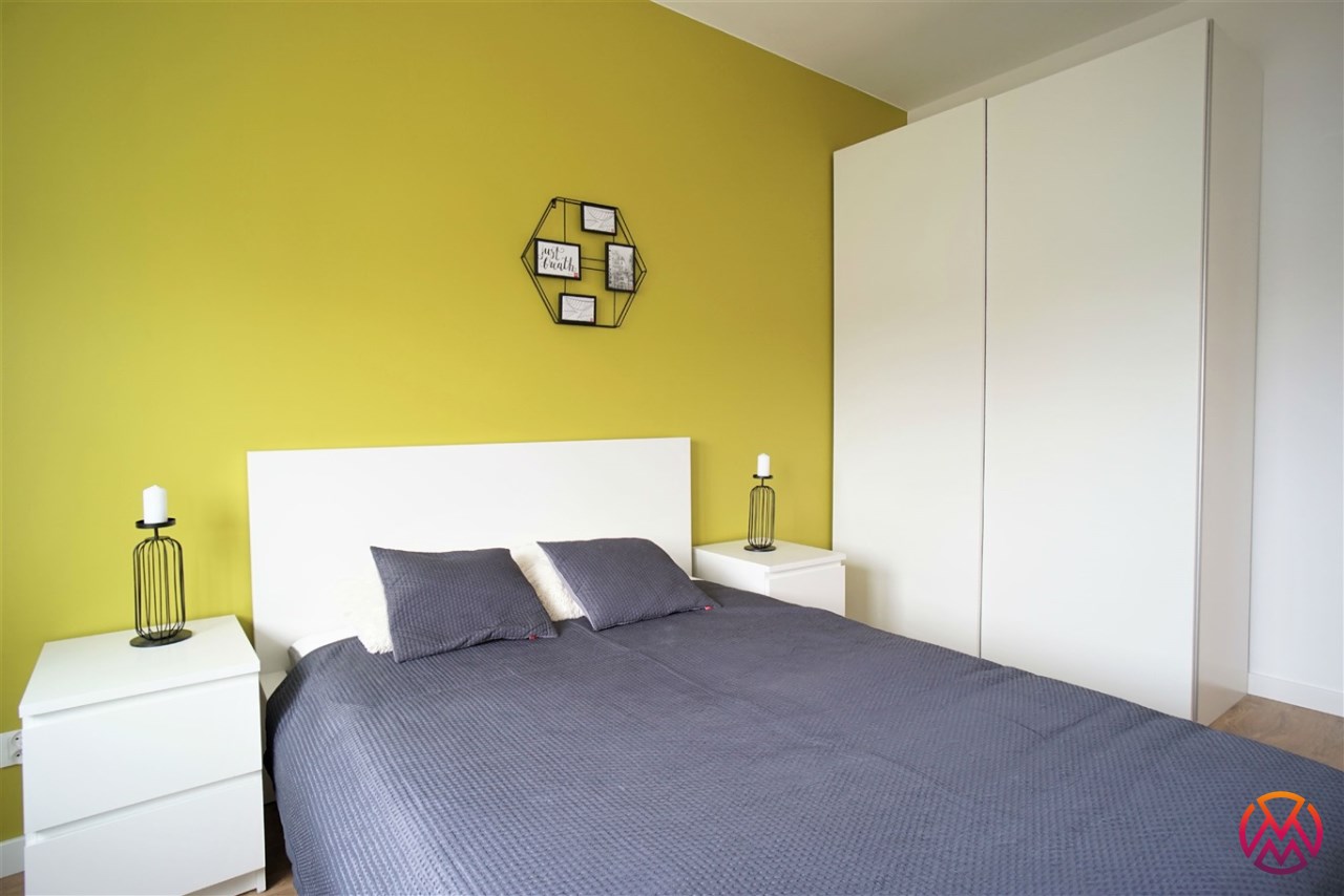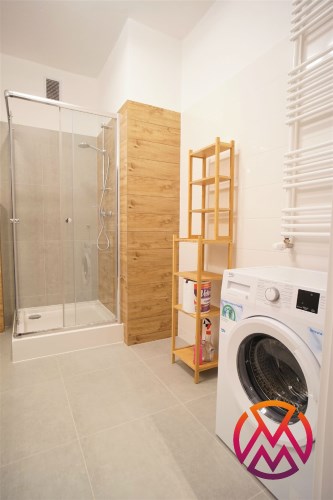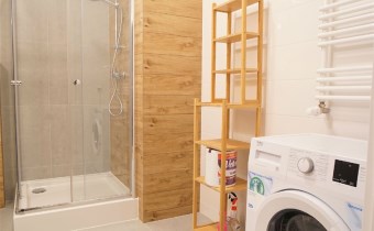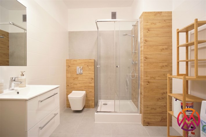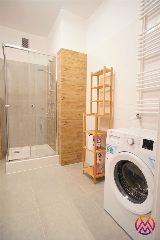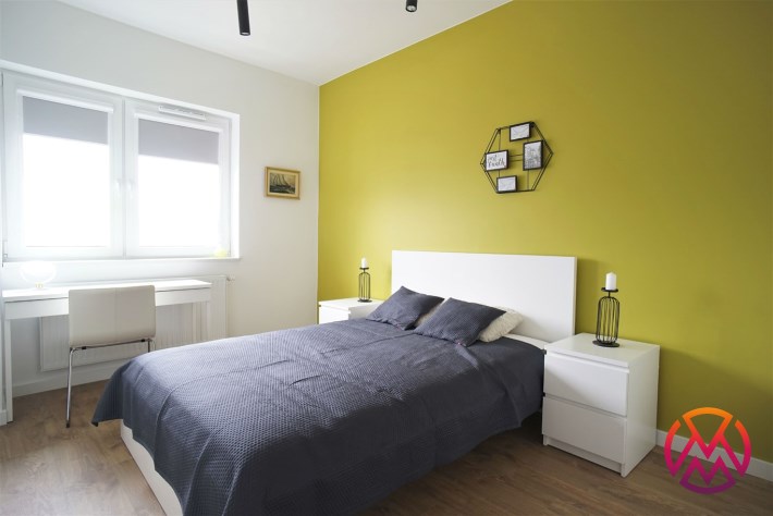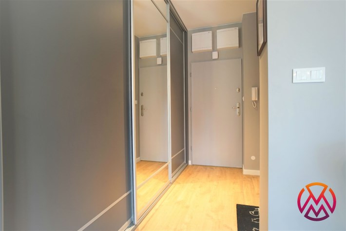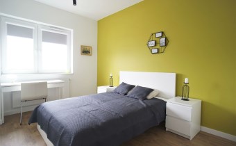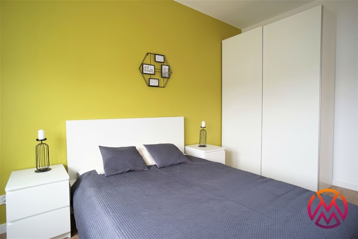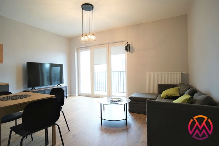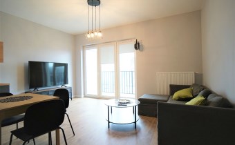 Apartament został wykończony w nowoczesny, niebanalny sposób. Przeważają jasne kolory. W pełni umeblowane. W salonie znajdziemy wygodny komplet wypoczynkowy, stoliki kawowe, szafkę RTV z dużym telewizorem. Aneks kuchenny wyposażony w lodówko-zamrażarkę, zmywarkę, piekarnik, płytę indukcyjną. W sypialni znajduje się wygodne, podwójne łóżko z materacem, pakowna szafa, biurko oraz szafki nocne z oświetleniem. Toaleta z prysznicem, pralką i WC. Dodatkowo w przedpokoju miejsce znalazła bardzo pojemna, 3-skrzydłowa szafa w zabudowie.