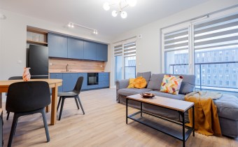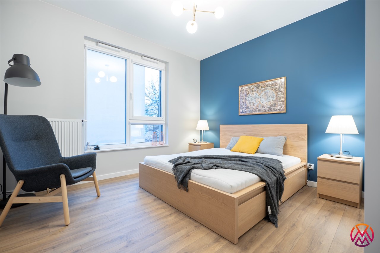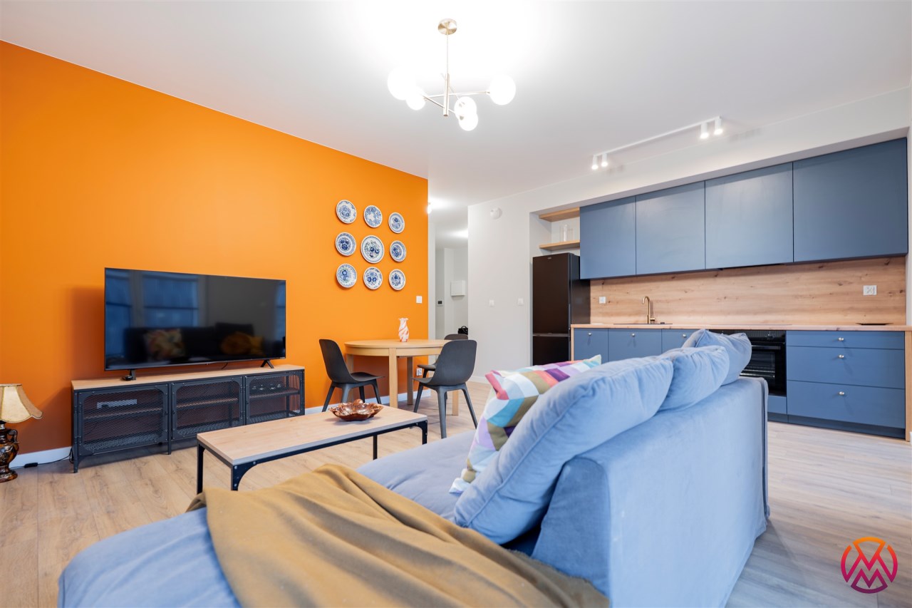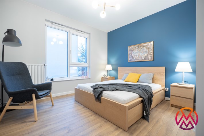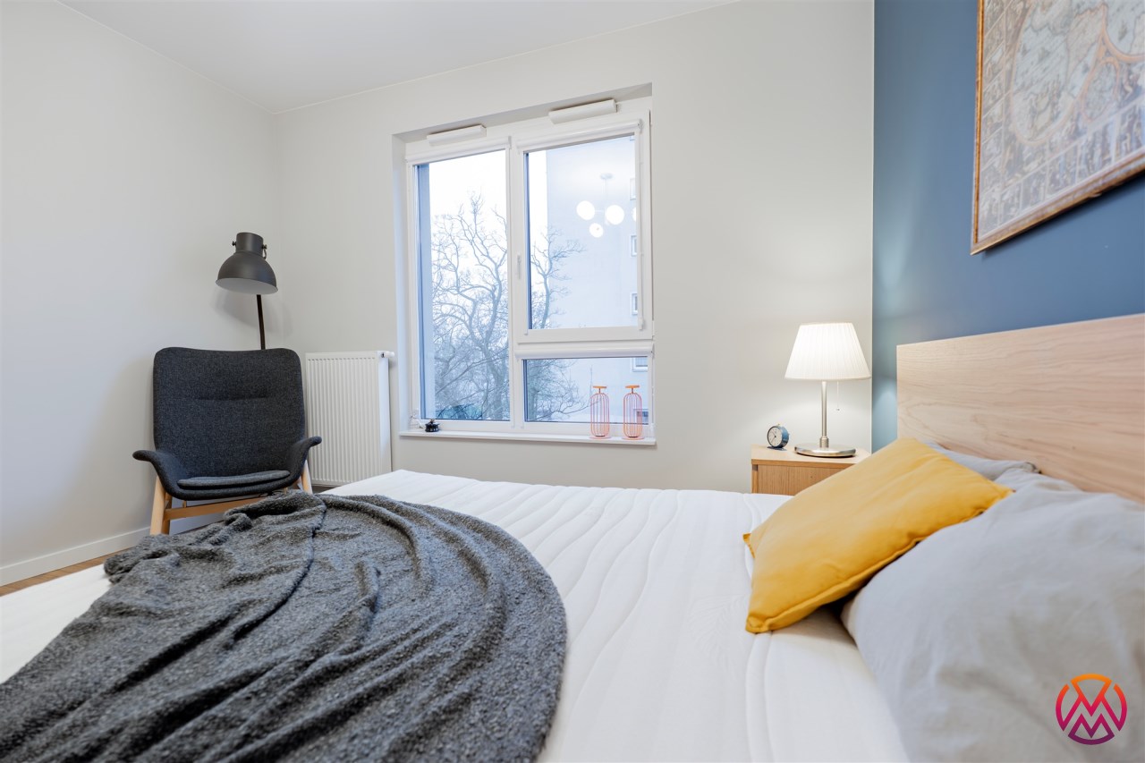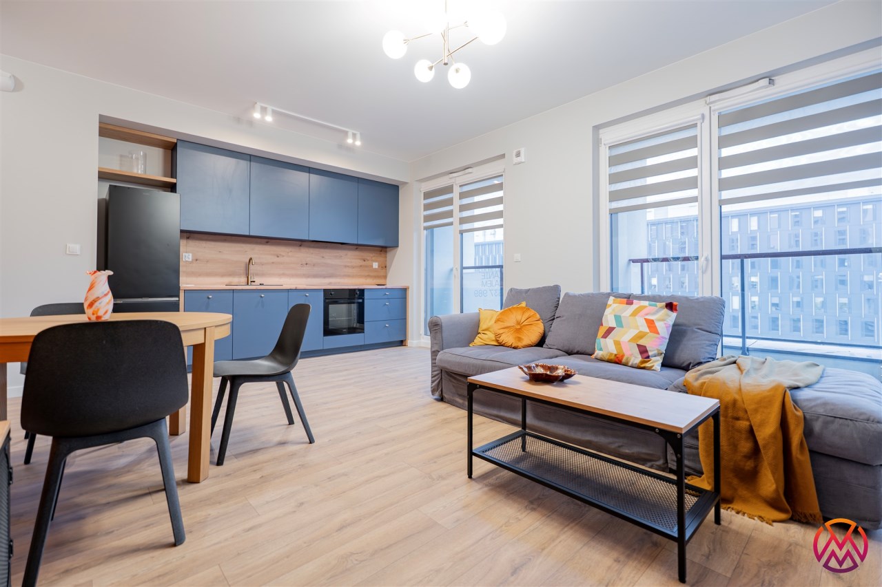 Apartament o powierzchni ok. 53 m2 składa się z salonu z aneksem kuchennym, sypialni, garderoby, przedpokoju oraz łazienki z WC. Do dyspozycji najemcy siłownia w budynku i strefa coworkingowa ze strefą do pracy.