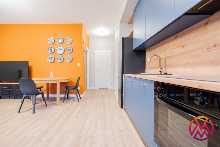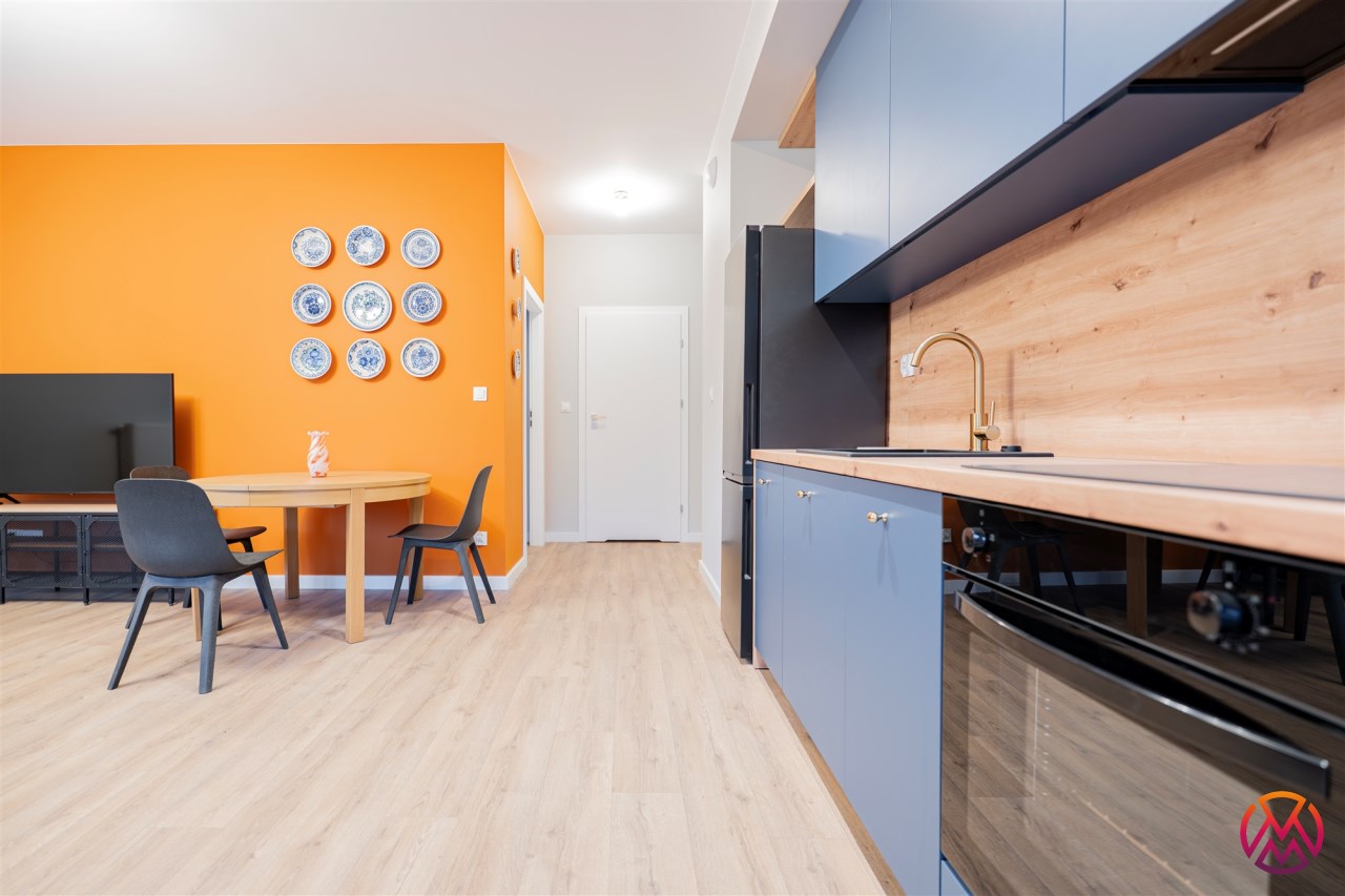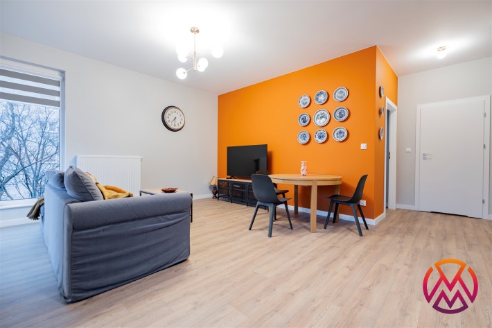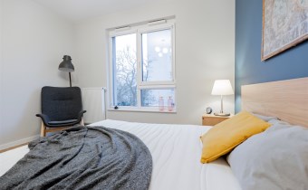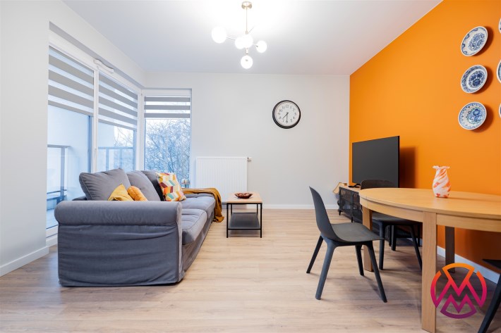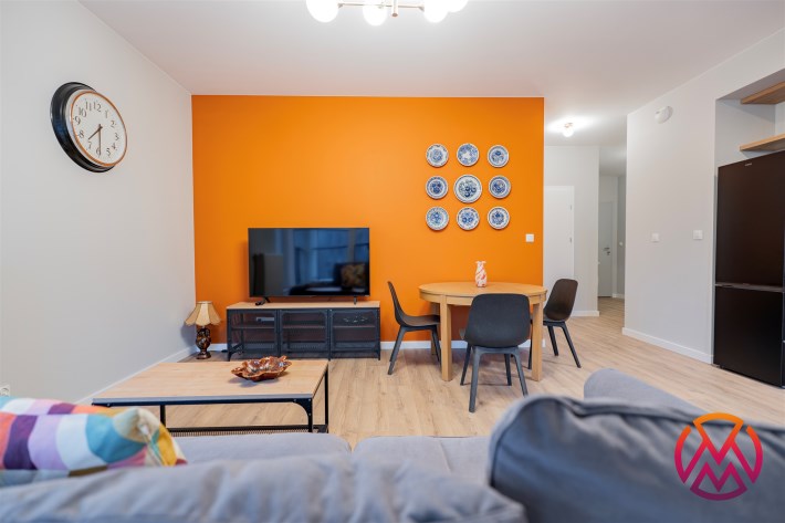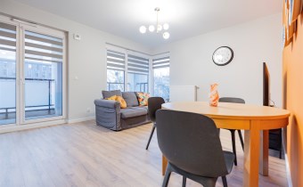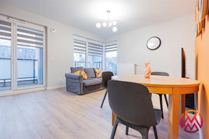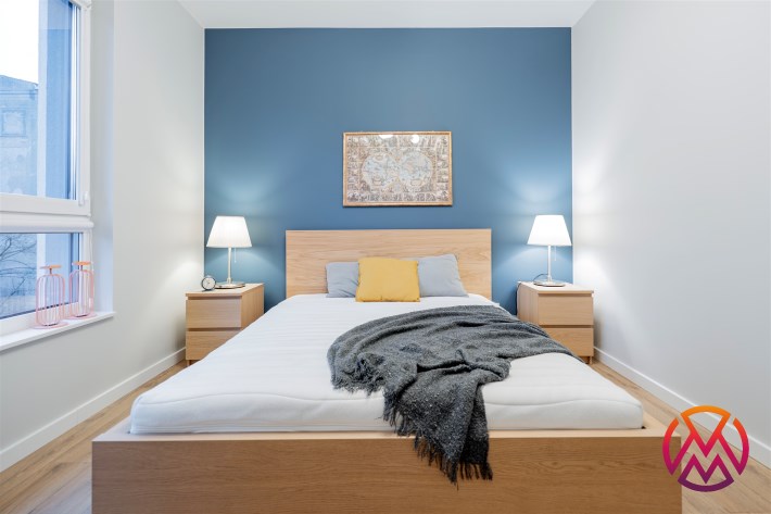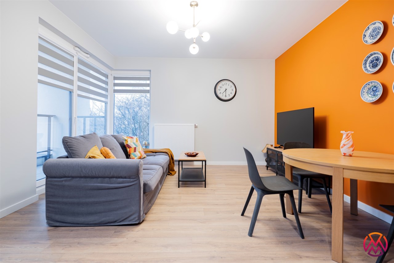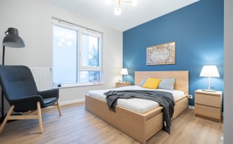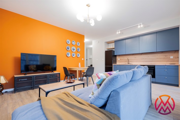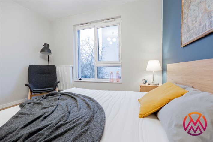 Apartament o powierzchni ok. 53 m2 składa się z salonu z aneksem kuchennym, sypialni, garderoby, przedpokoju oraz łazienki z WC. Do dyspozycji najemcy siłownia w budynku i strefa coworkingowa ze strefą do pracy.