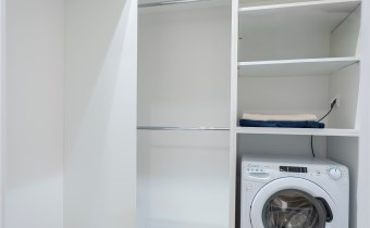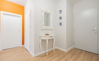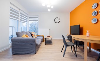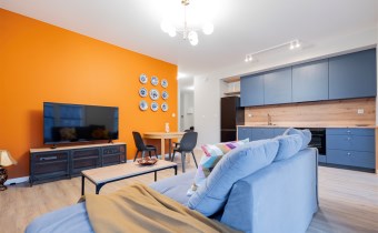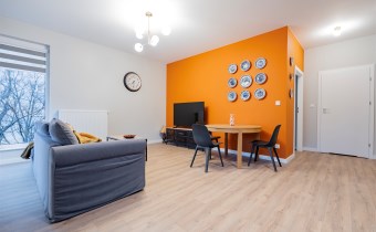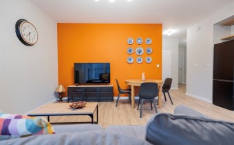 Salon wyposażony został w komfortową sofę wypoczynkową, szafkę RTV, TV, stół z krzesłami, rolety w każdym oknie. Aneks kuchenny posiada wszystkie niezbędne sprzęty: lodówkę z zamrażarką, zmywarkę, płytę i piekarnik, okap. W sypialni łóżko dwuosobowe, z komfortowym wygodnym materacem. Przestronne pomieszczenie - garderoba z pralką. W łazience kabina z deszczownicą, toaleta, umywalka z szafką i lustrem w zabudowie.