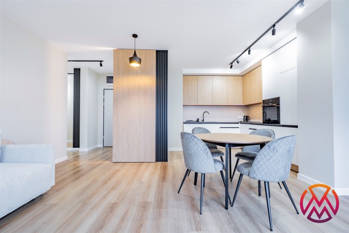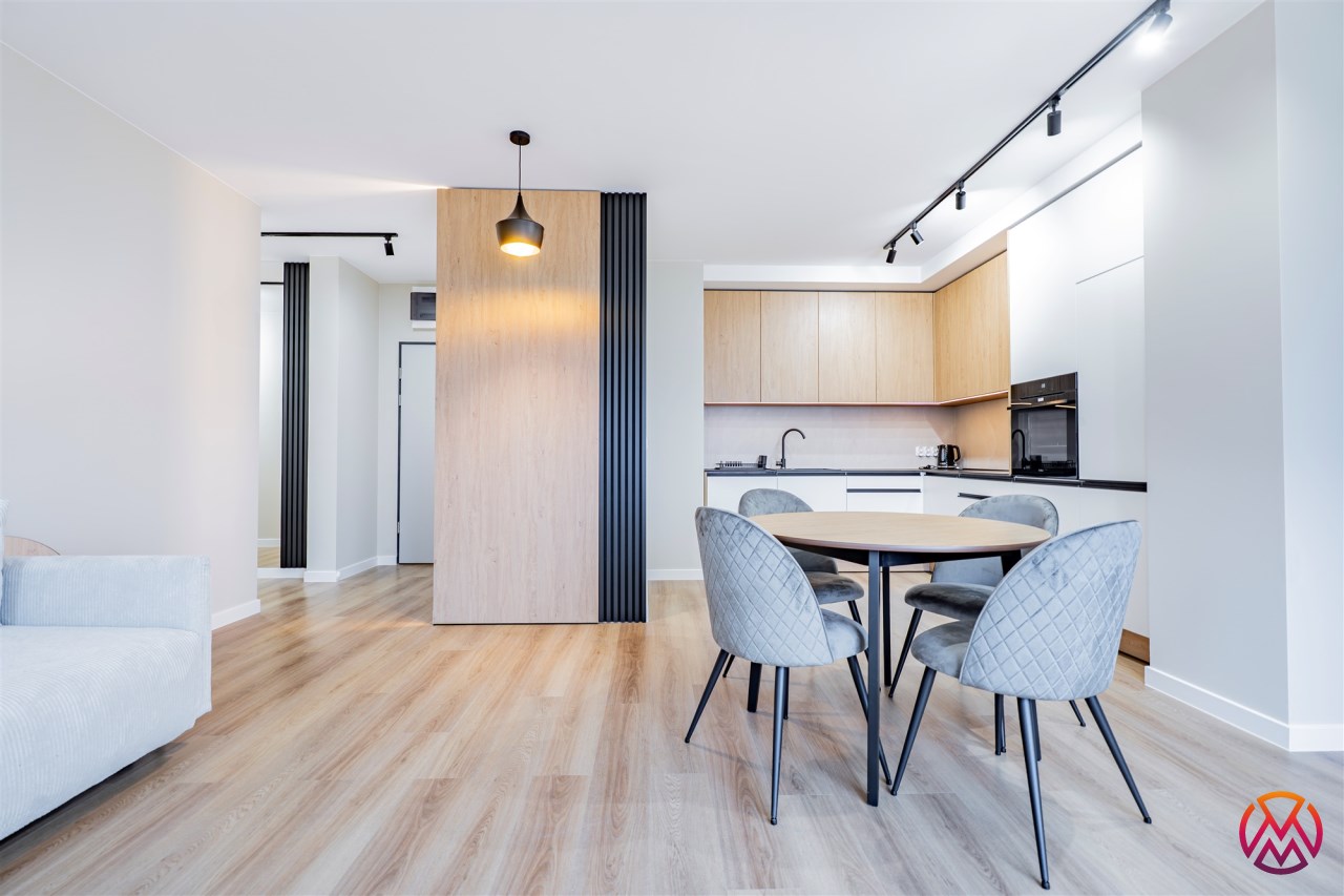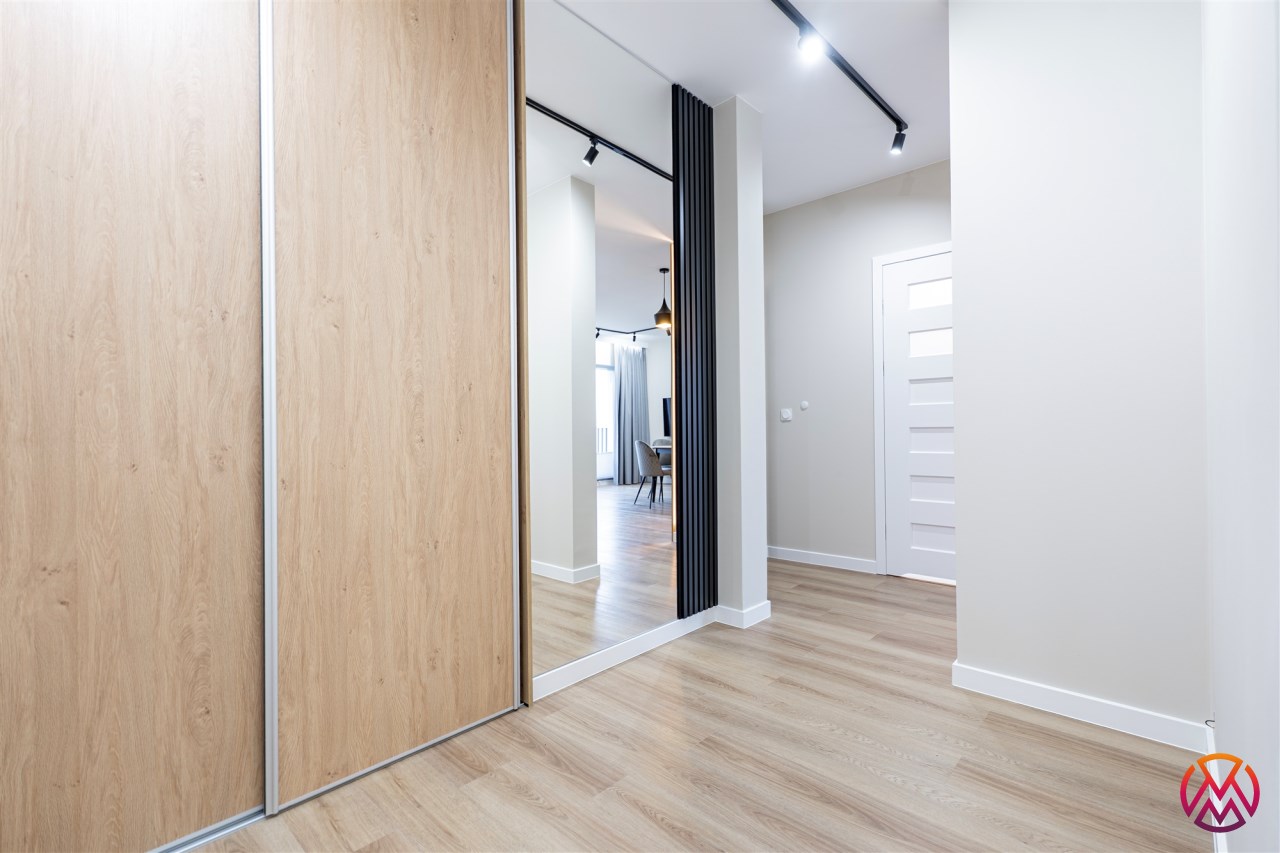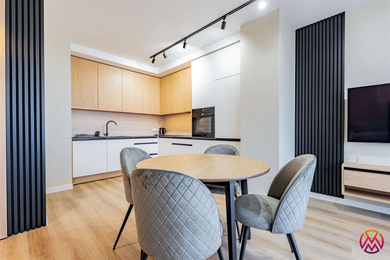 Apartament został wykończony w nowoczesny, niebanalny sposób przez architekta. W salonie znajdziemy wygodną rozkładaną sofę, szafkę RTV, telewizor oraz stół z krzesłami. Aneks kuchenny wyposażony w lodówko-zamrażarkę, zmywarkę, piekarnik, płytę indukcyjną. W sypialni znajduje się  dwuosobowe łóżko oraz pakowna szafa. Drugi pokój może zostać zaadaptowany przez najemcę na gabinet lub sypialnię. Toaleta z wanną z funkcją prysznica, umywalką, pralką oraz oddzielne WC. Dodatkowo w przedpokoju znajduje się pakowna szafa z licznym miejscem do przechowywania.