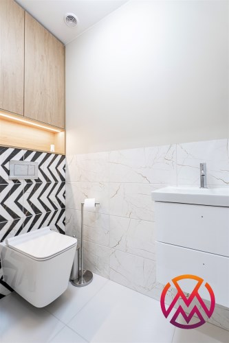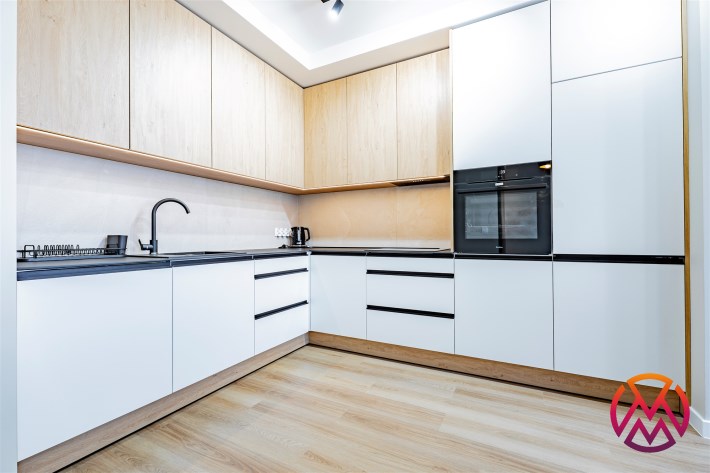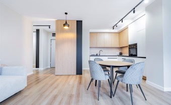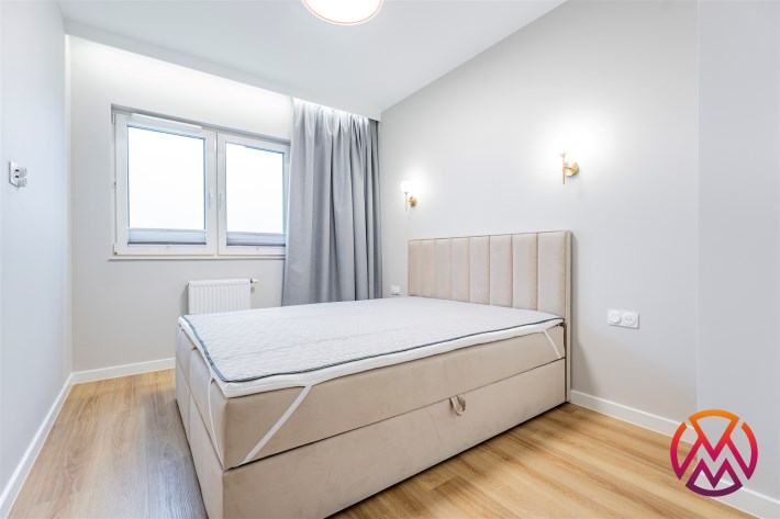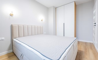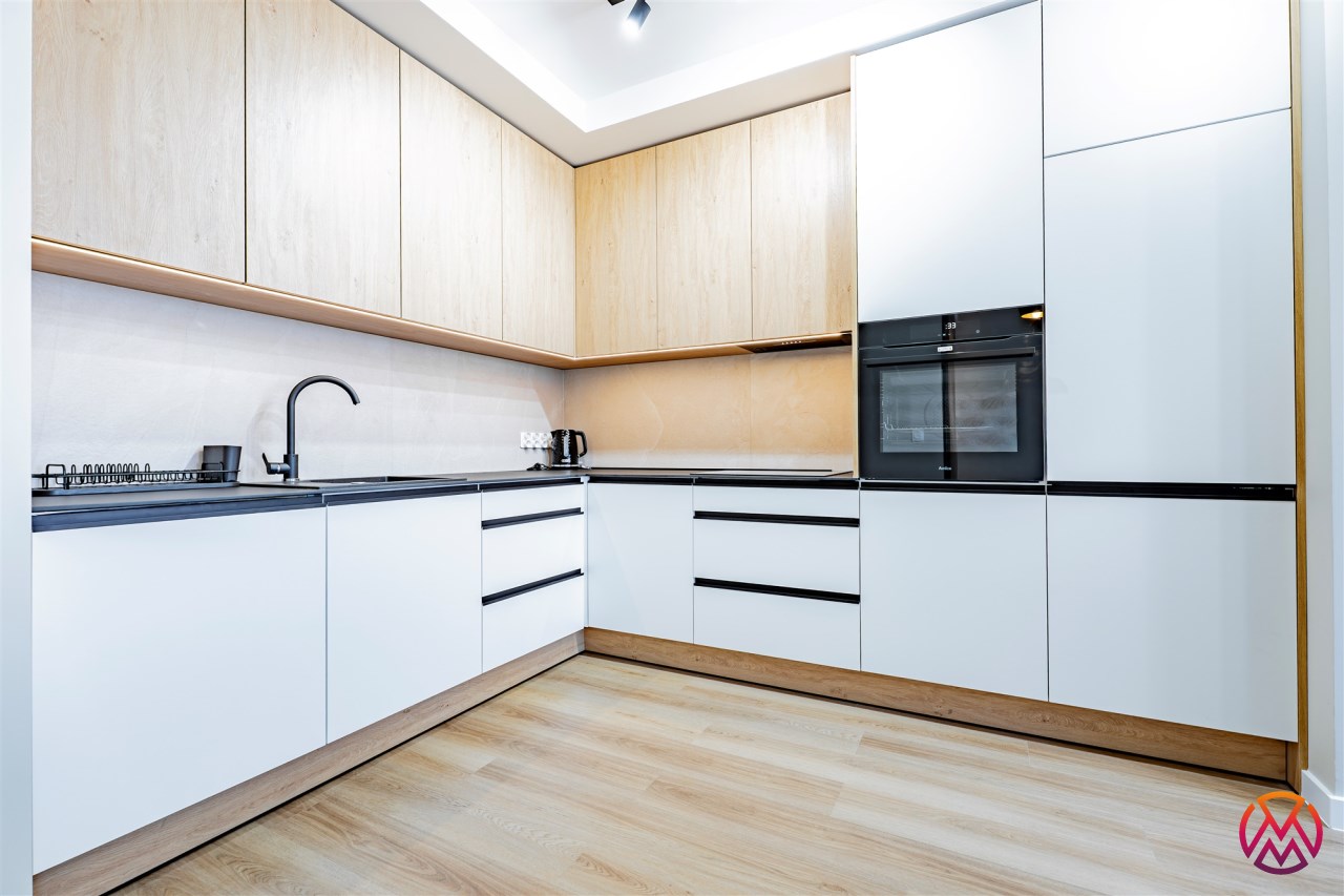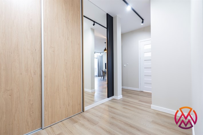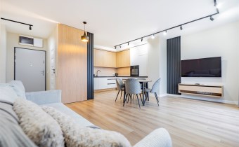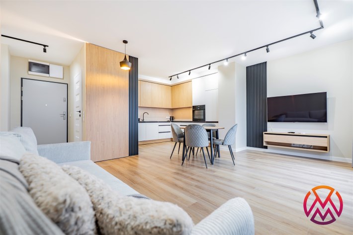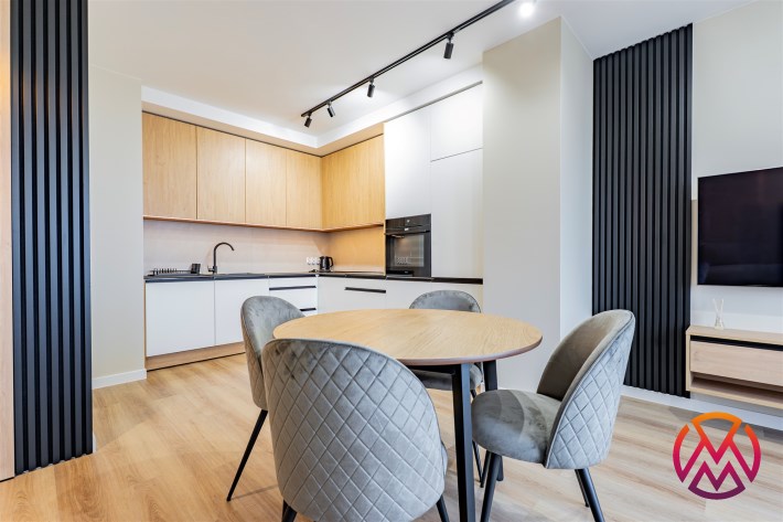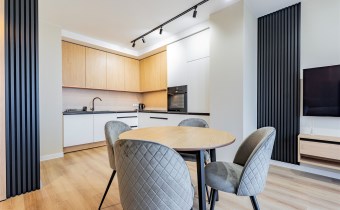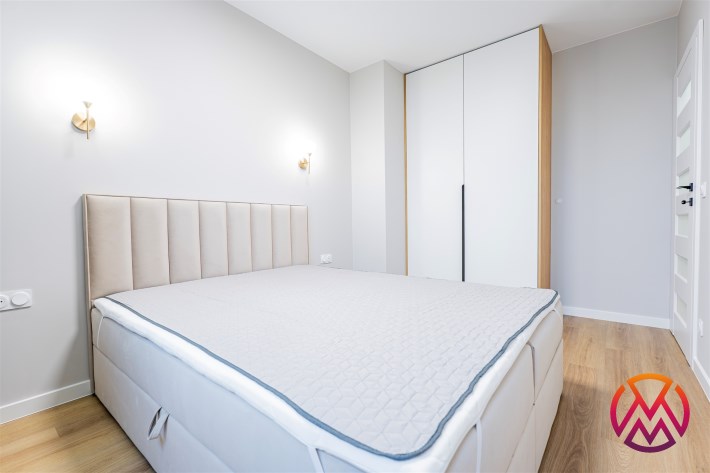 Apartament został wykończony w nowoczesny, niebanalny sposób przez architekta. W salonie znajdziemy wygodną rozkładaną sofę, szafkę RTV, telewizor oraz stół z krzesłami. Aneks kuchenny wyposażony w lodówko-zamrażarkę, zmywarkę, piekarnik, płytę indukcyjną. W sypialni znajduje się  dwuosobowe łóżko oraz pakowna szafa. Drugi pokój może zostać zaadaptowany przez najemcę na gabinet lub sypialnię. Toaleta z wanną z funkcją prysznica, umywalką, pralką oraz oddzielne WC. Dodatkowo w przedpokoju znajduje się pakowna szafa z licznym miejscem do przechowywania.