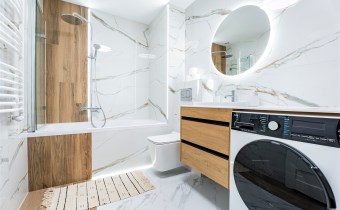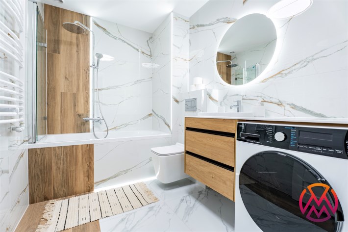 Wyposażenie łazienki lustro, natrysk, pralka, prysznic, umywalka, wanna, WC