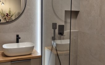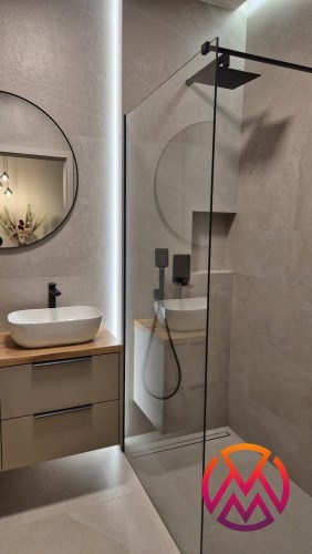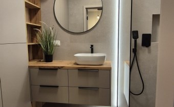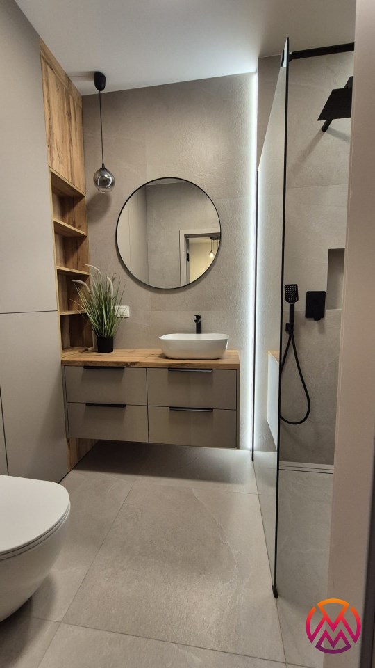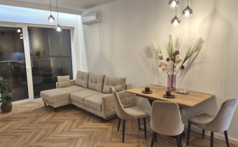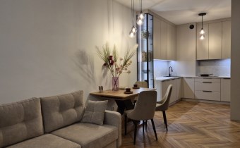 Apartament składa się z salonu z aneksem kuchennym, sypialni, łazienki razem z WC oraz przedpokoju. Całość wykończona bardzo gustownie przy użyciu materiałów wysokiej jakości. Mieszkanie klimatyzowane. Atutem mieszkania jest duża przestrzeń do przechowywania oraz bliskość terenów zielonych oraz rekreacyjnych.