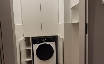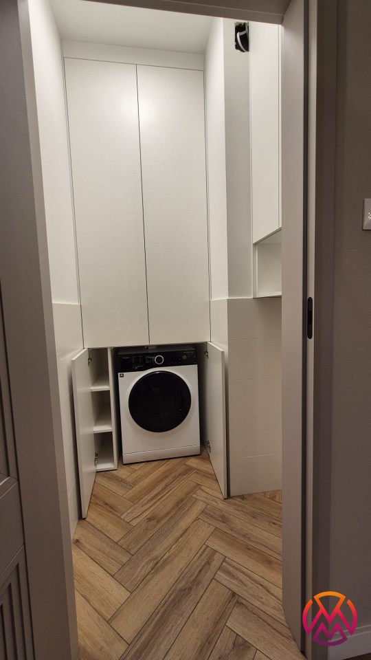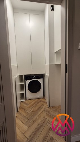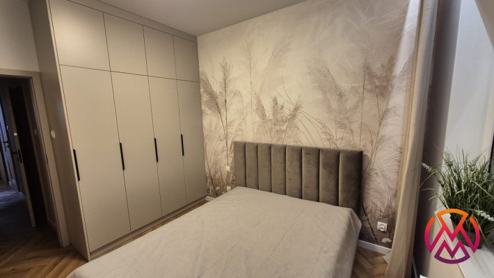 W salonie znajdziemy wygodną sofę, szafkę RTV, telewizor, oraz stół z krzesłami. Aneks kuchenny wyposażony w lodówko-zamrażarkę, zmywarkę, piekarnik, płytę indukcyjną. W sypialni znajduje się dwuosobowe łóżko oraz pakowna szafa. Toaleta z prysznicem typu walk-in, umywalką, pralką oraz WC. Dodatkowo w garderobie oraz przedpokoju znajdują się pakowne szafy z licznym miejscem do przechowywania.
