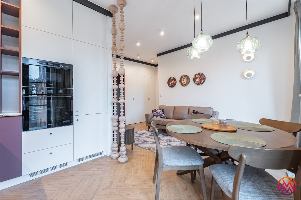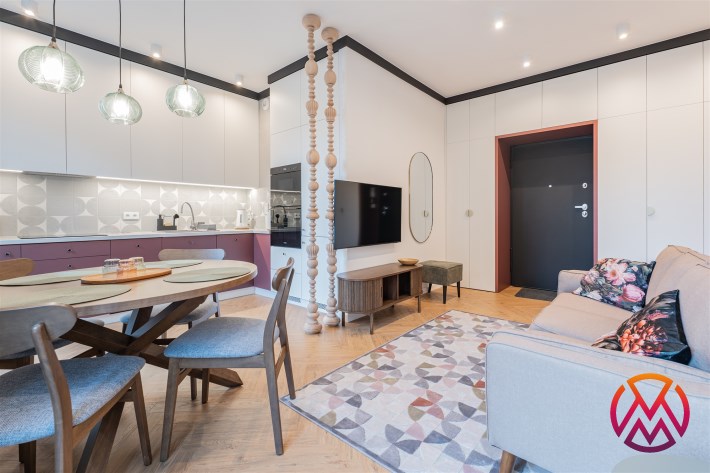 Wykończenie mieszkania cechuje nowoczesność, jak i funkcjonalność. Salon został wyposażony w wygodną kanapę, funkcjonale szafki i schowki, stół z krzesłami oraz telewizork, rozplanowane tak aby wykorzystać przestrzeń jak najprecyzyjniej. Kuchnia przygotowaną na wymiar przez stolarza, posiada nowe sprzęty (na gwarancji) m.in. piekarnik, mikrofale, płytę indukcyjną, zmywarkę, lodówkę, okap kuchenny. Sama kuchnia to połączenie nowoczesności i wyjątkowego stylu.