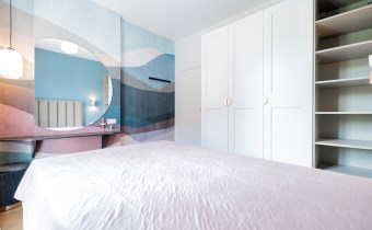 Sypialnia z łóżkiem podwójnym, stolikami nocnymi, szafą oraz toaletką.